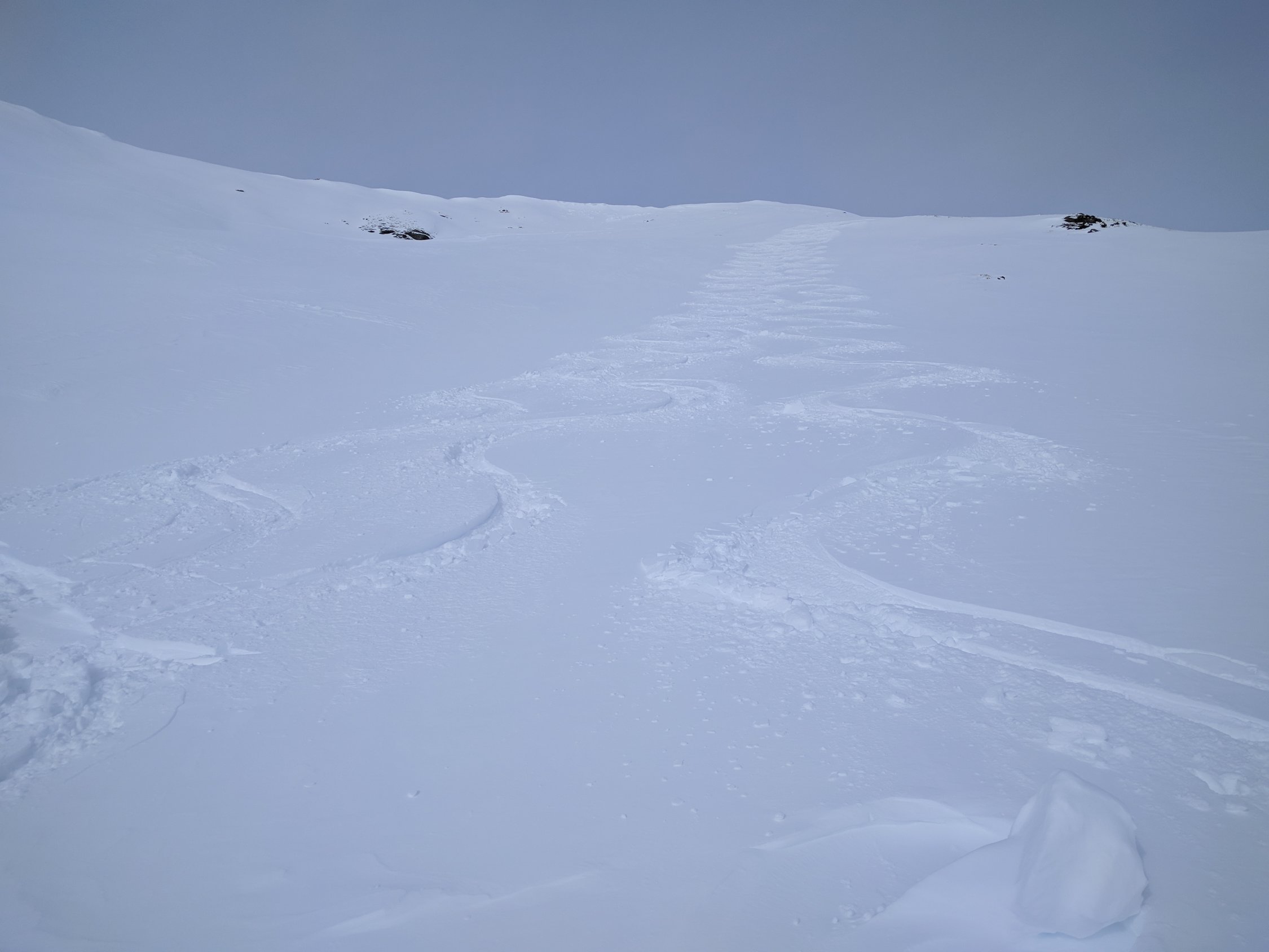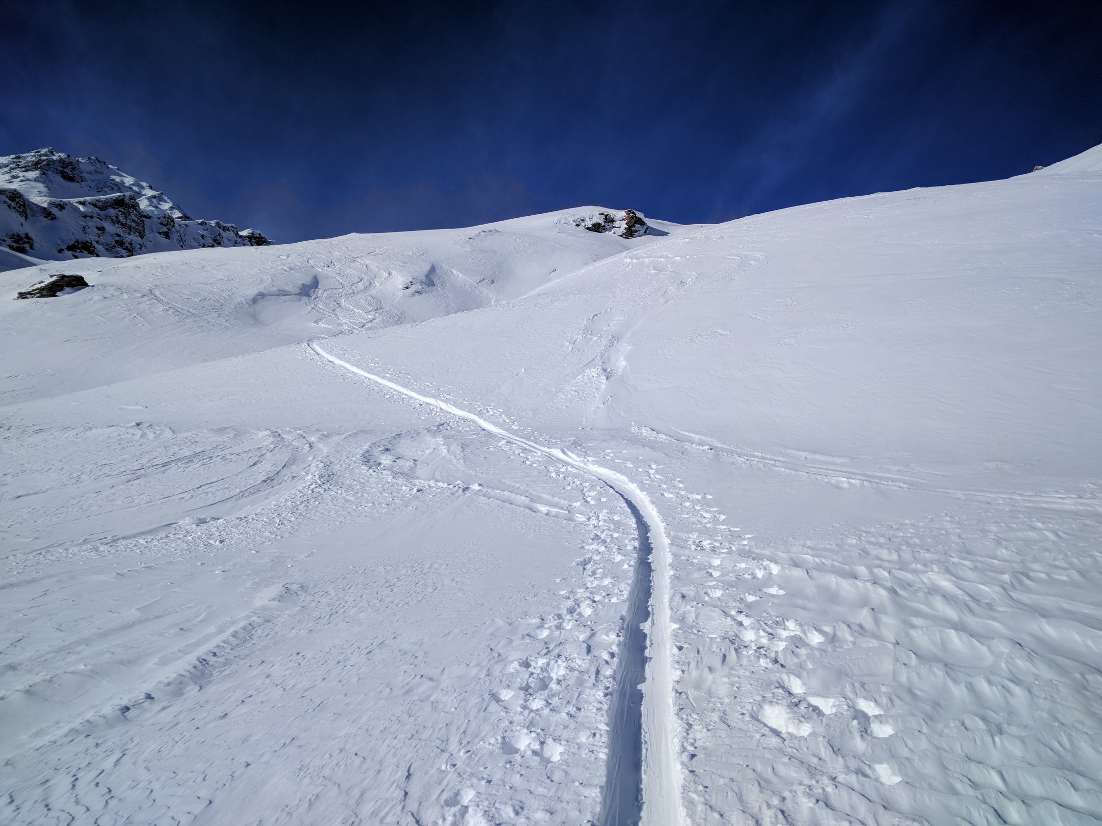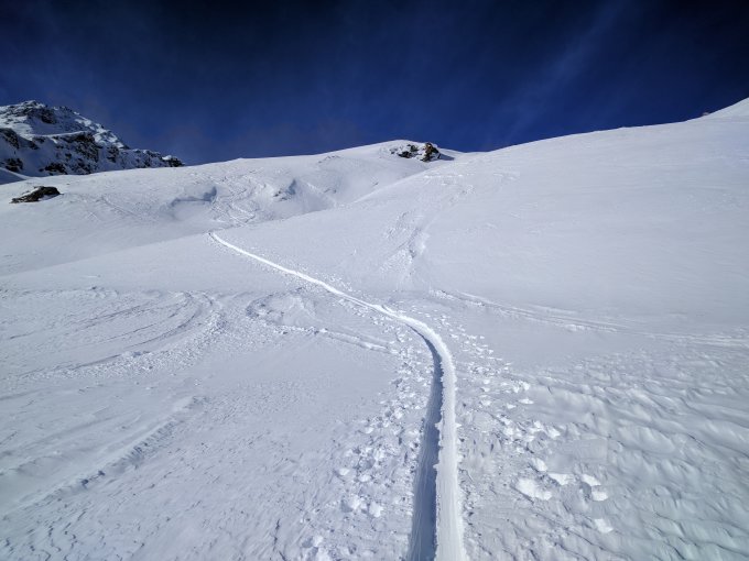 Start bei kalten -15, Gipfel -20, zurück -7. Mehr oder weniger durchgehend Pulver, mal mehr (Mulden), mal weniger (Gipfel). Unten teils durch die Altschneeschicht gebrochen, oben teils vereist. Traumverhältnisse, hoffentlich geht der Winter so weiter.