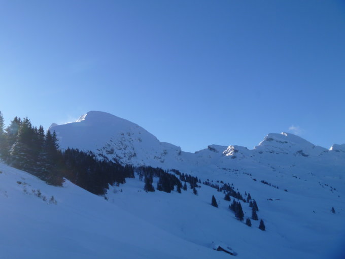 Im Wald schöner Pulver bis auf etwa 1800 MüM, danach hart. Der Gipfelhang ist verblasen, aber genug Schnee ohne Bodenkontakt. Gute Spur, auch ohne Harscheisen machbar.