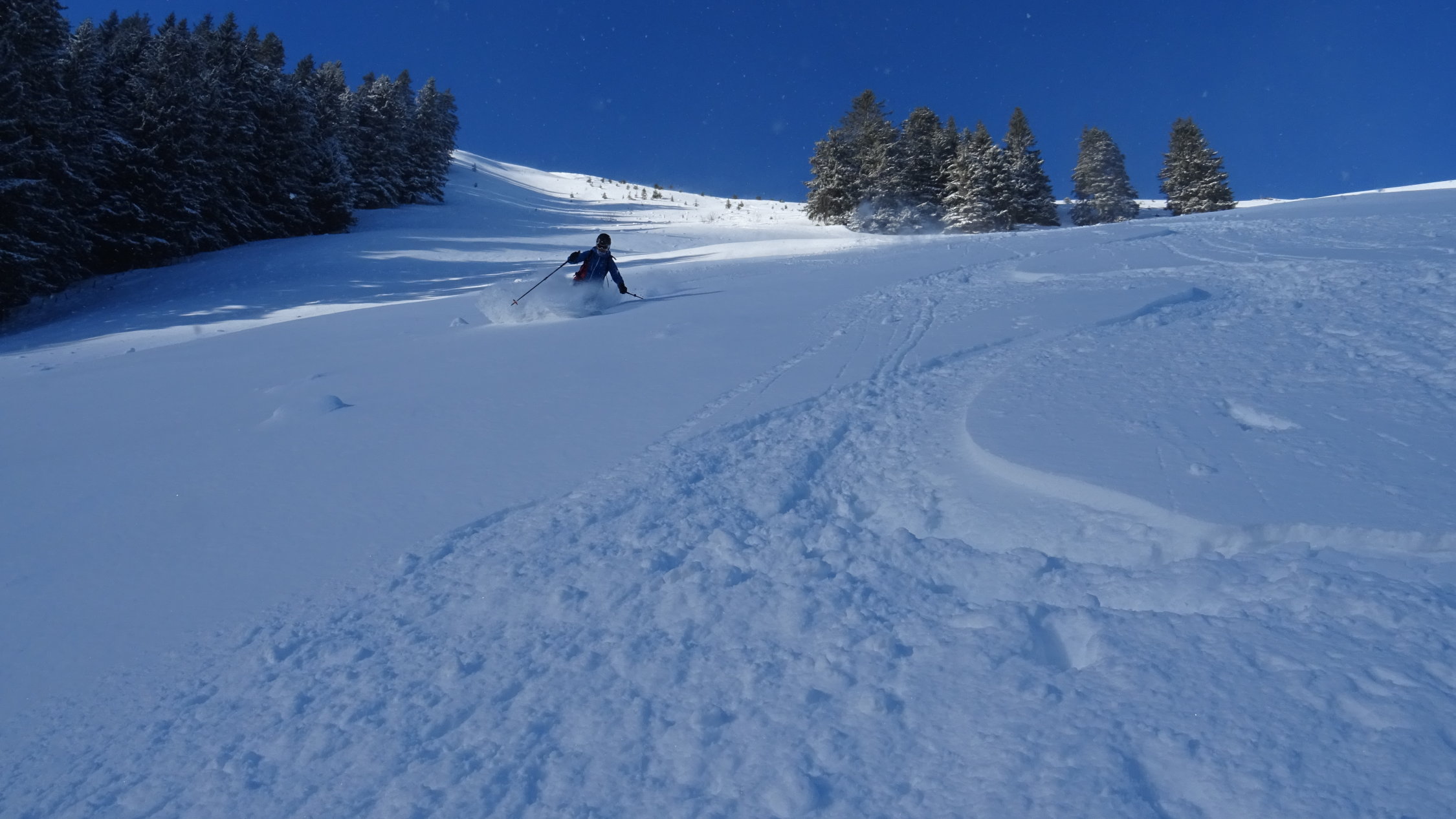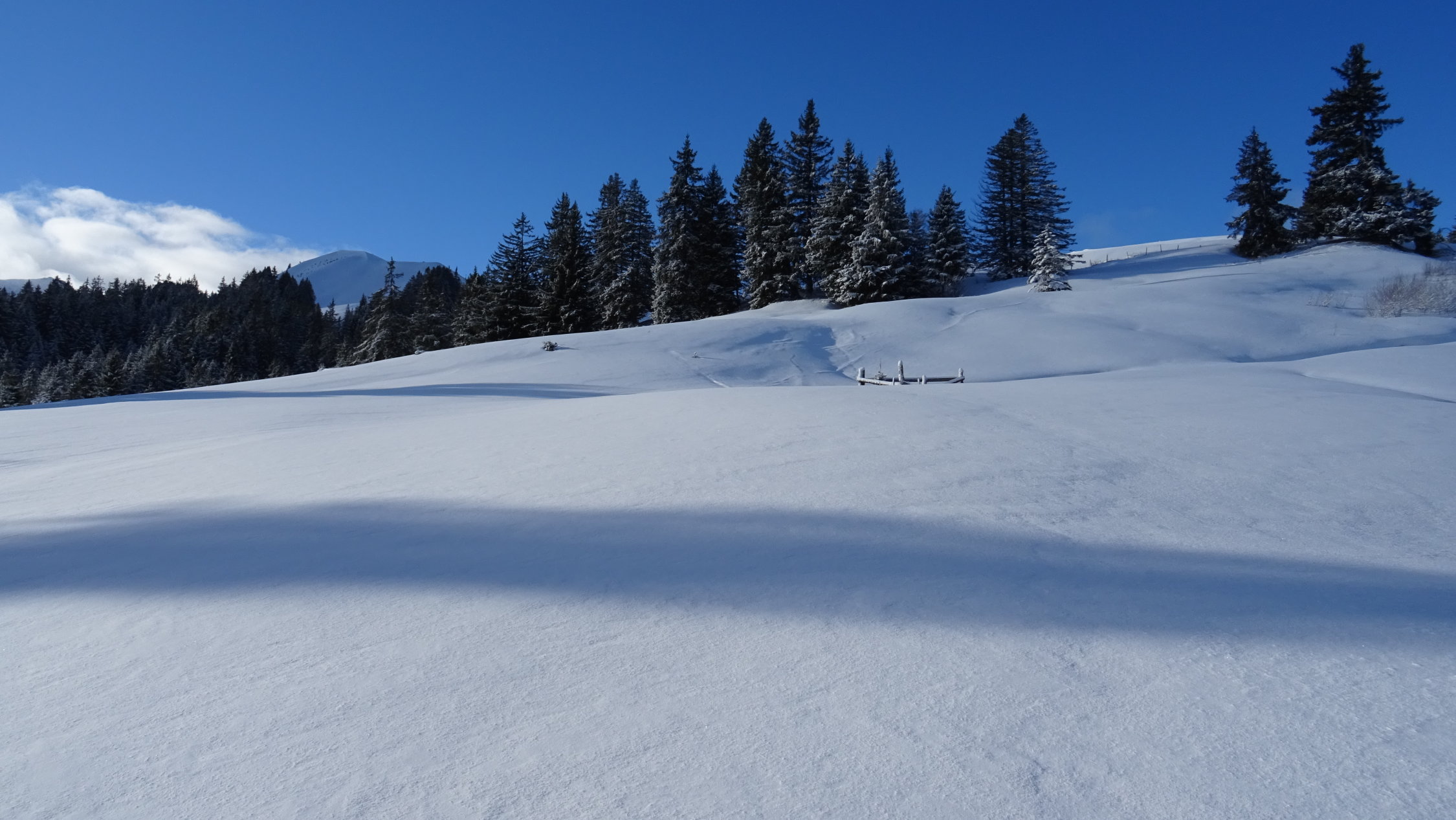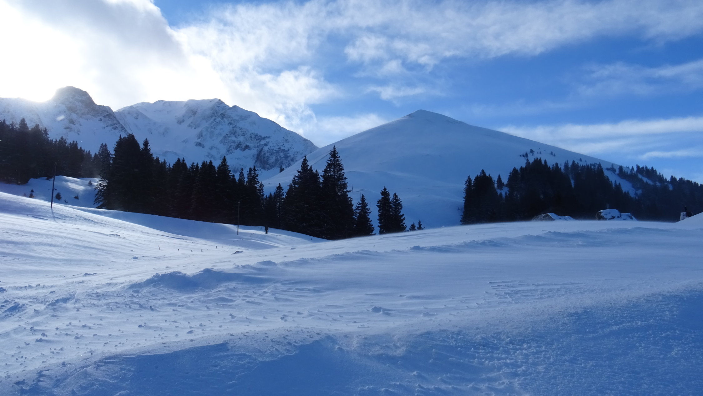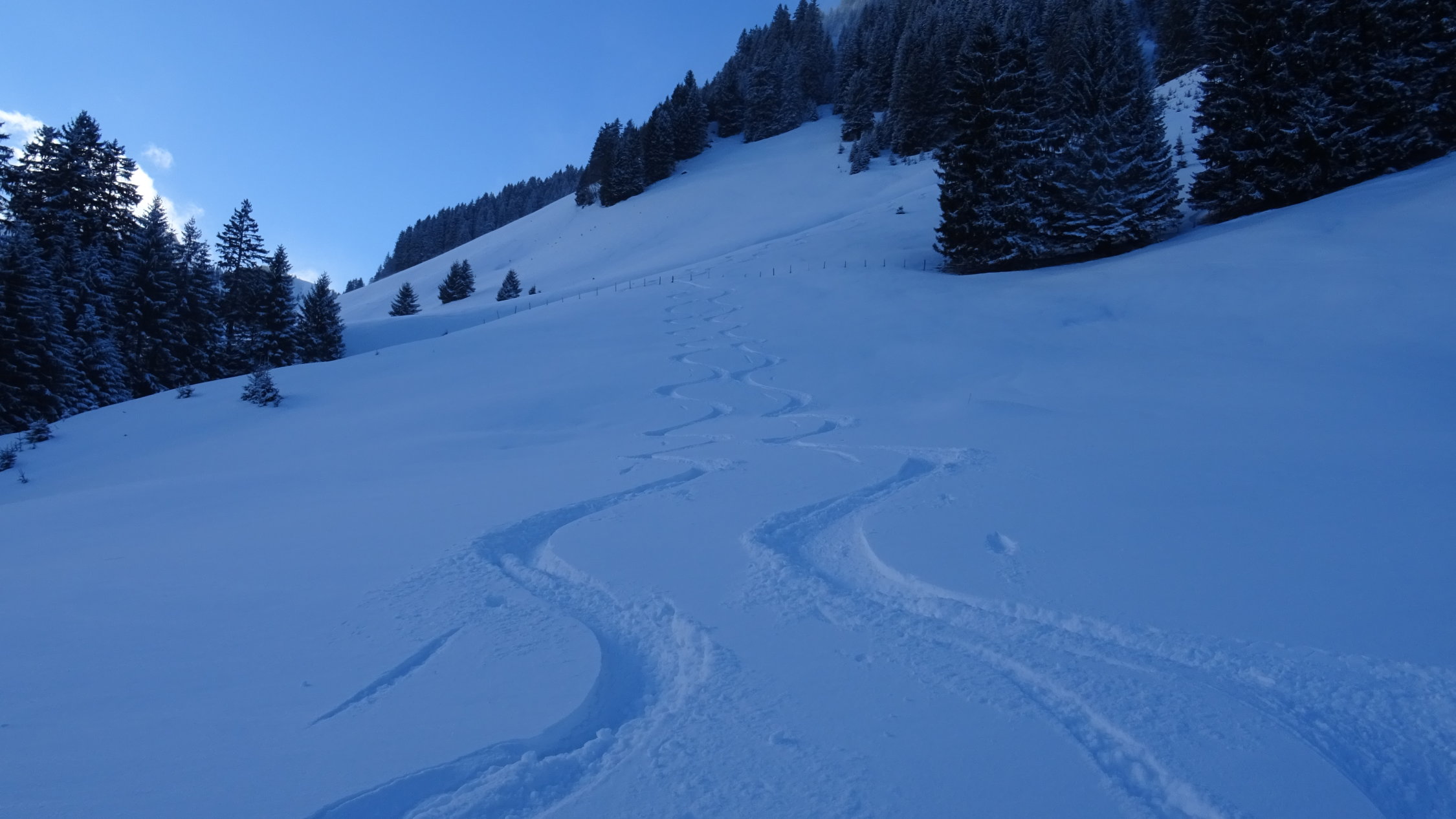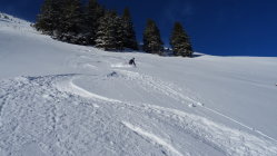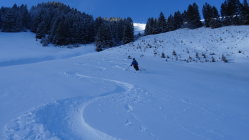 Heute überraschend gute Verhältnisse mit 5-15cm frischem Pulverschnee der Neujahrsnacht auf teils tragender und teils feuchter Unterlage aber alles gut zum fahren (siehe Bilder)