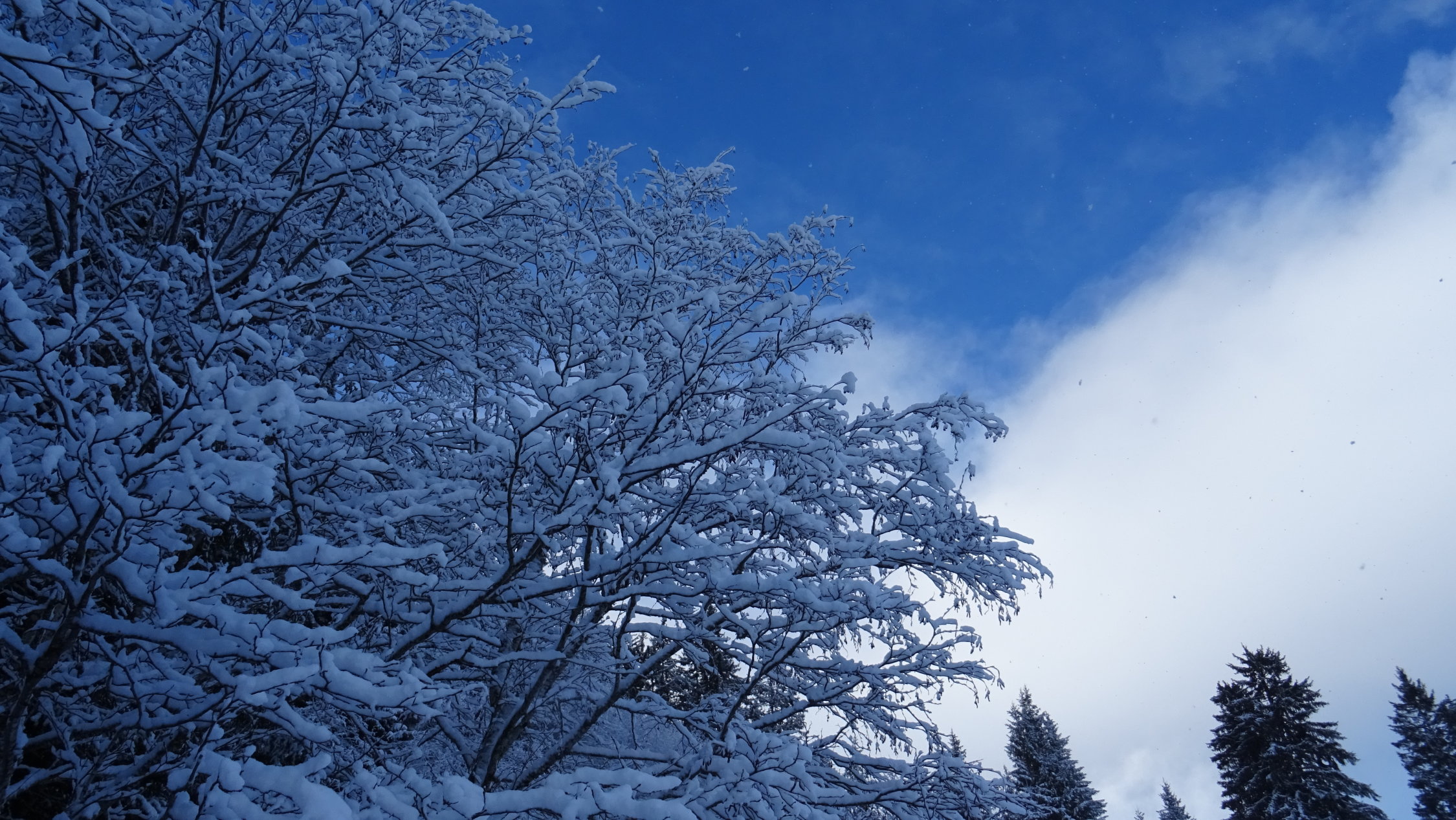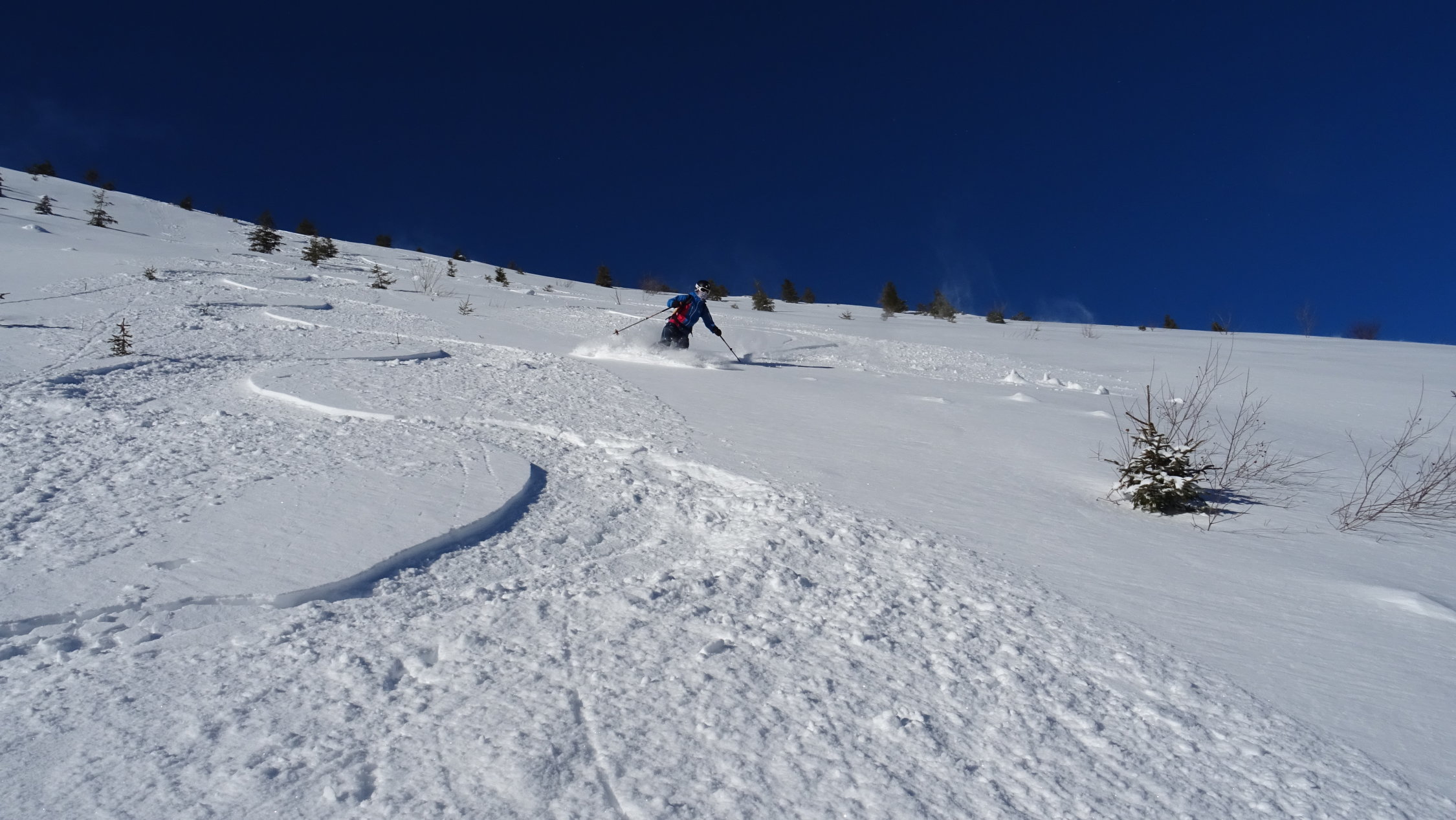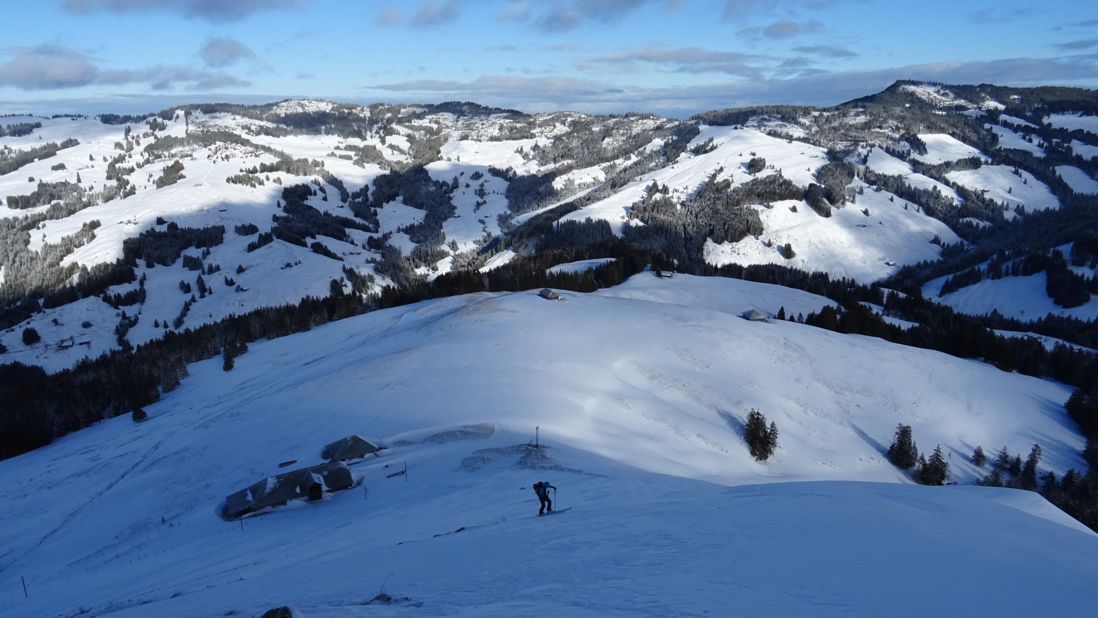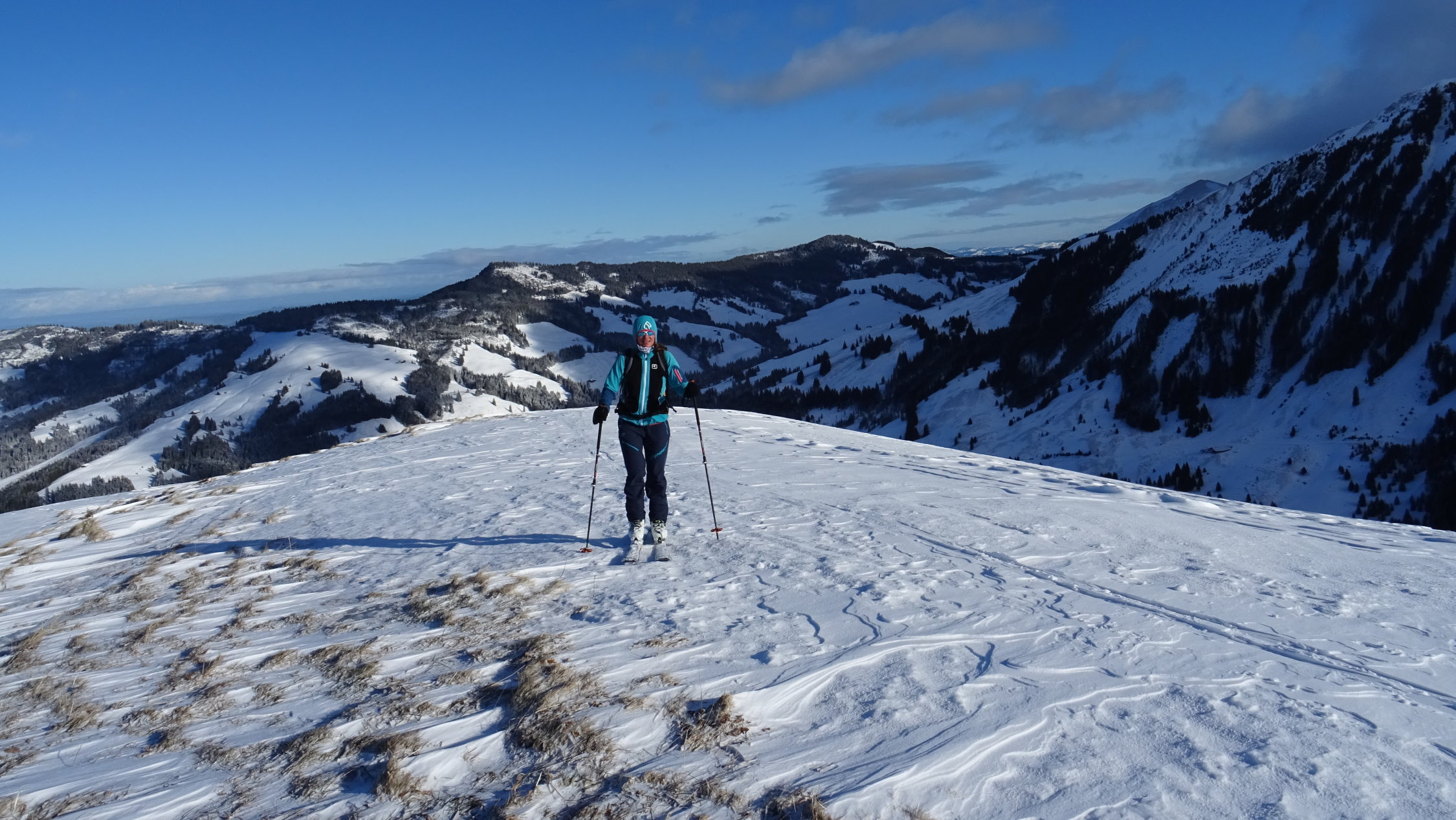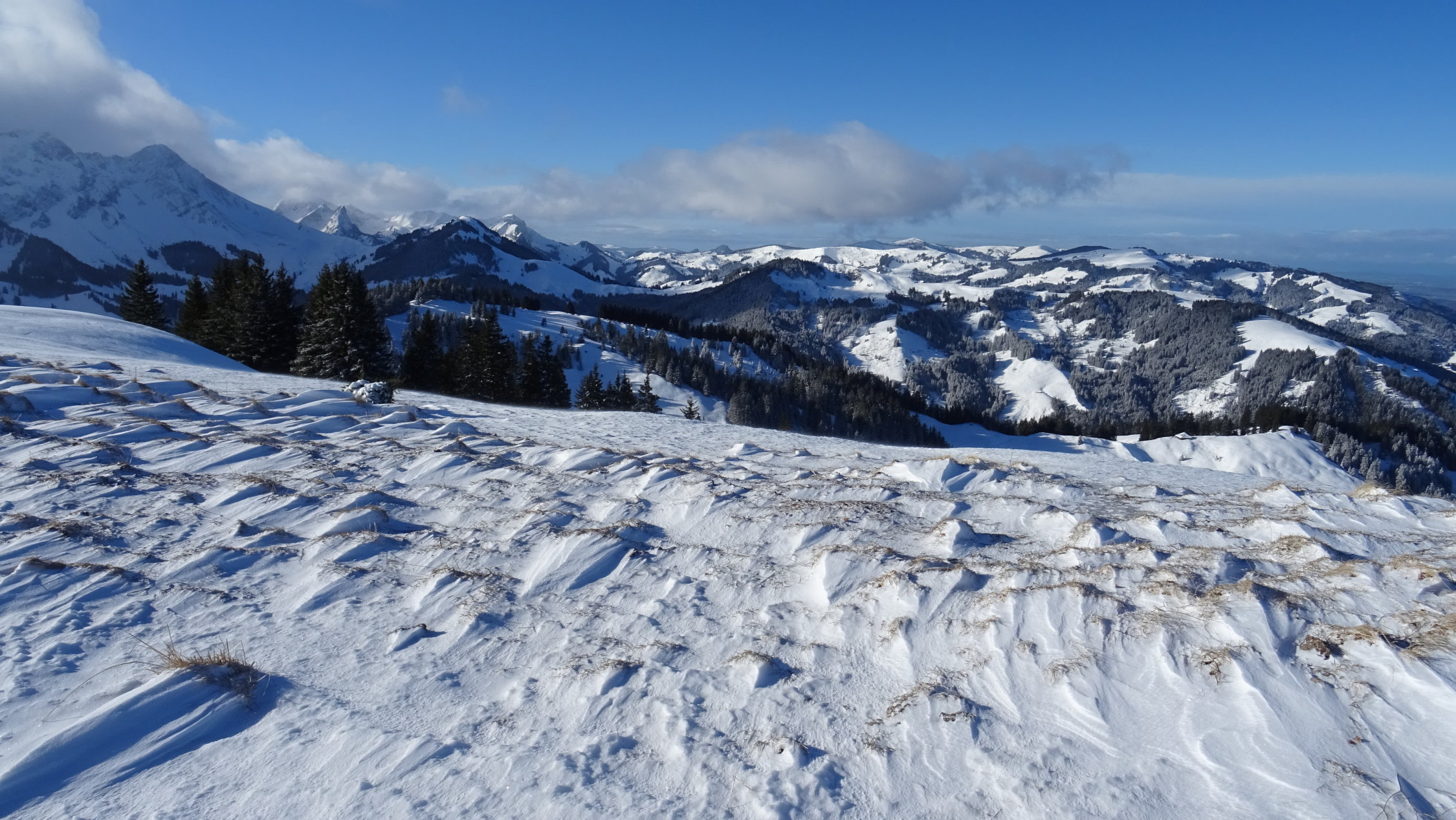 Heute überraschend gute Verhältnisse mit 5-15cm frischem Pulverschnee der Neujahrsnacht auf teils tragender und teils feuchter Unterlage aber alles gut zum fahren (siehe Bilder)