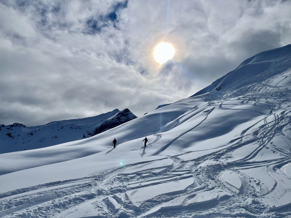 20cm Pulver auf gesetztem, gutmütigem Untergrund. Die Hauptabfahrten sind schon zerfahren aber mit etwas Spürsinn findet man immer noch unverspurte Bereiche zum abfahren. Das gleiche gilt auch für den kleinen Seekopf. Südseitig fangen die Hänge an einen leichten Deckel zu bilden.