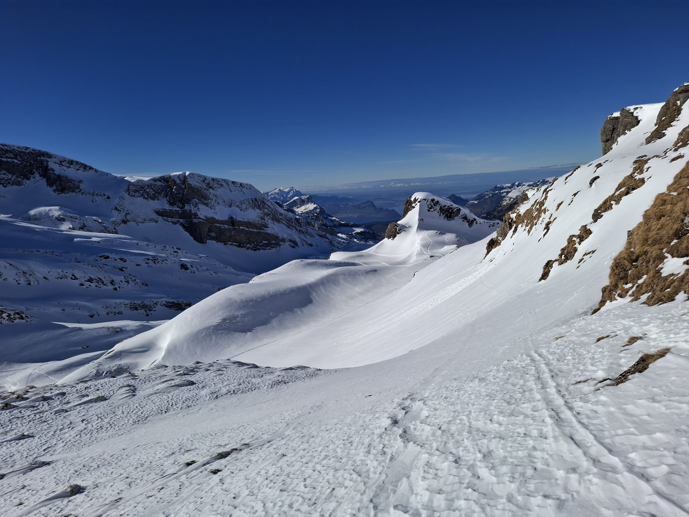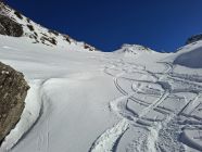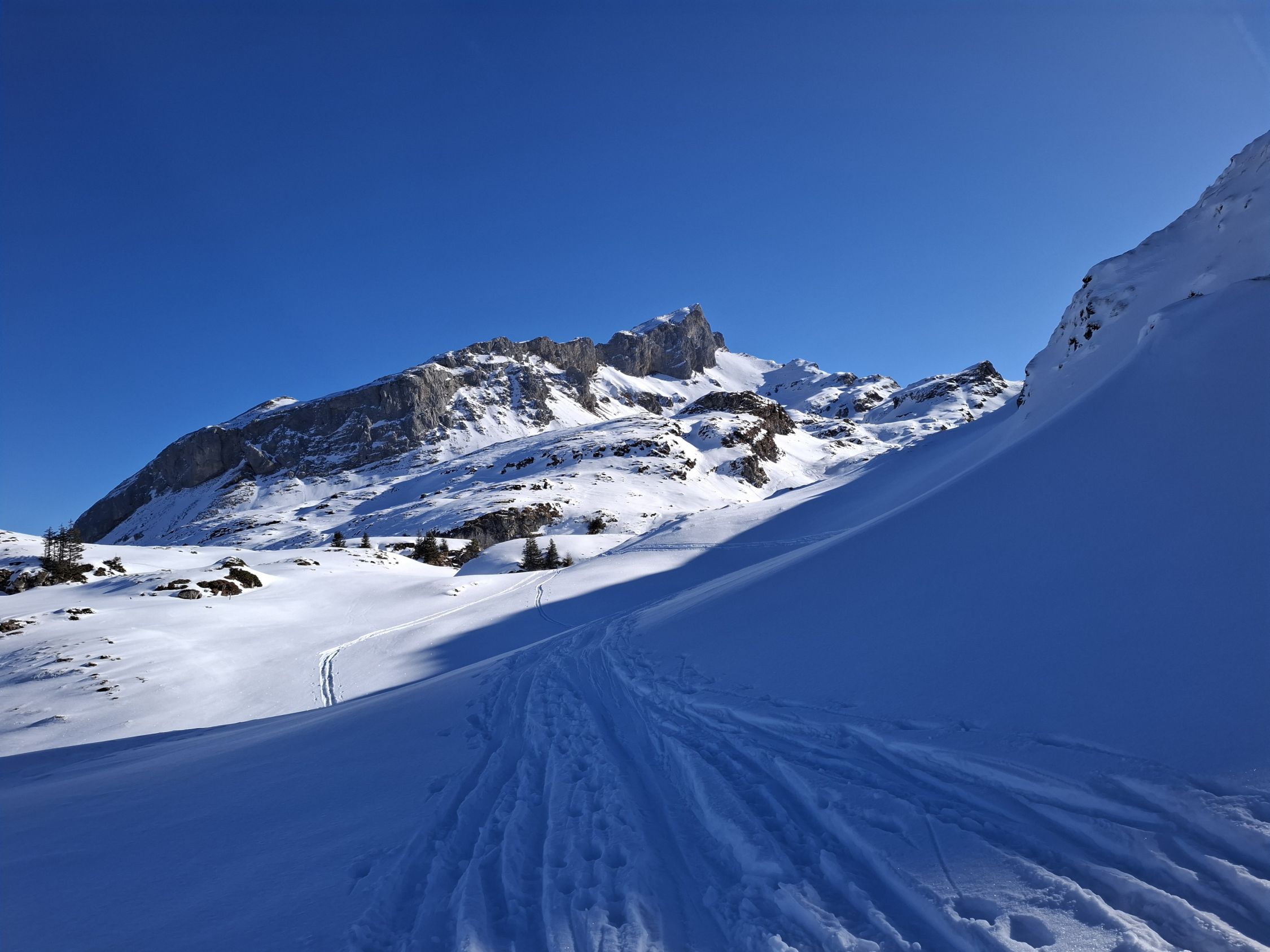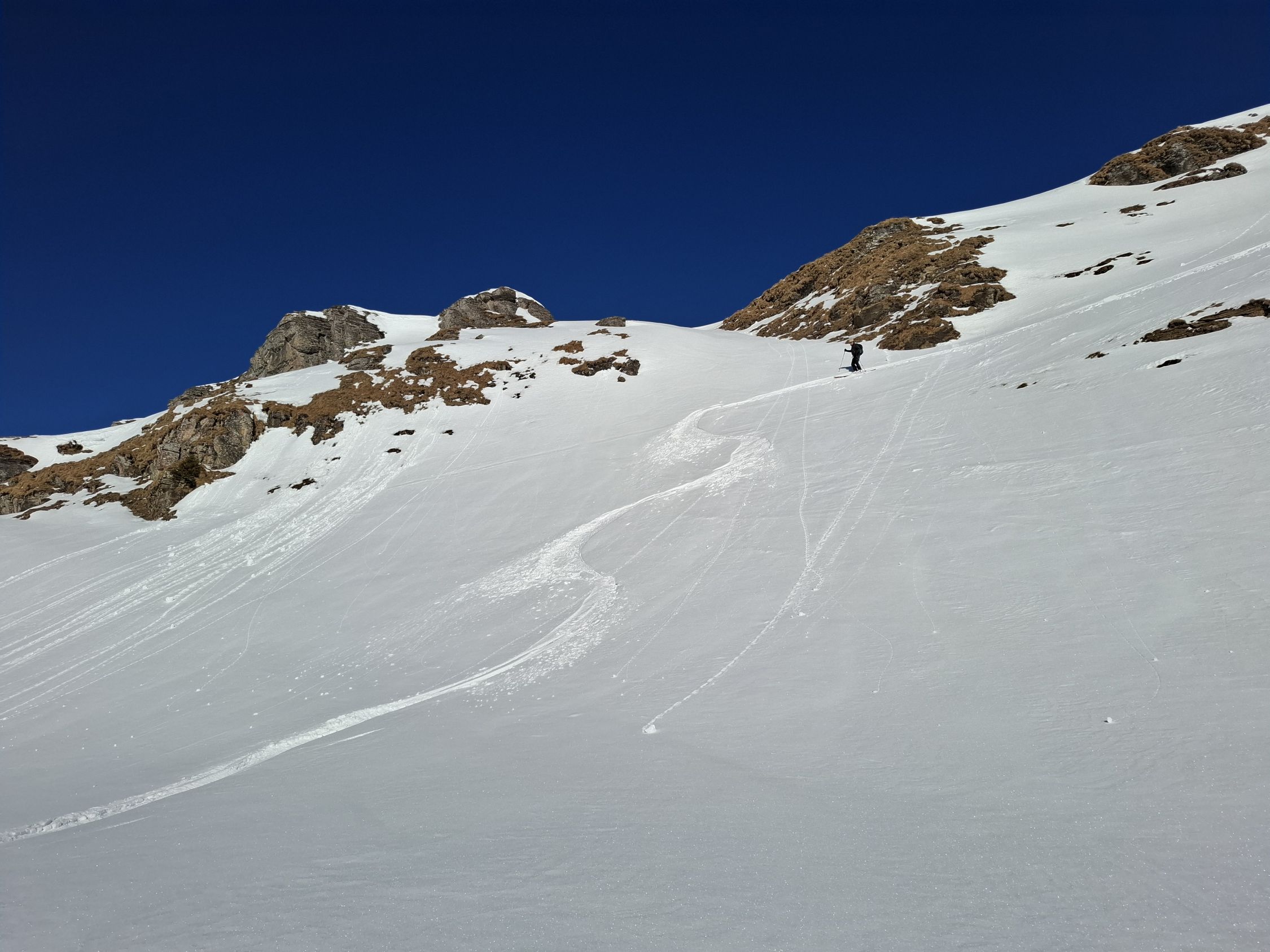 wir gingen nicht direkt zum Chaiserstocksätz und zwar etwas südwestlich davon, nahe P 2261. Hier gab es noch genug unverspurtes Gelände, mit herrlichem Pulverschnee.