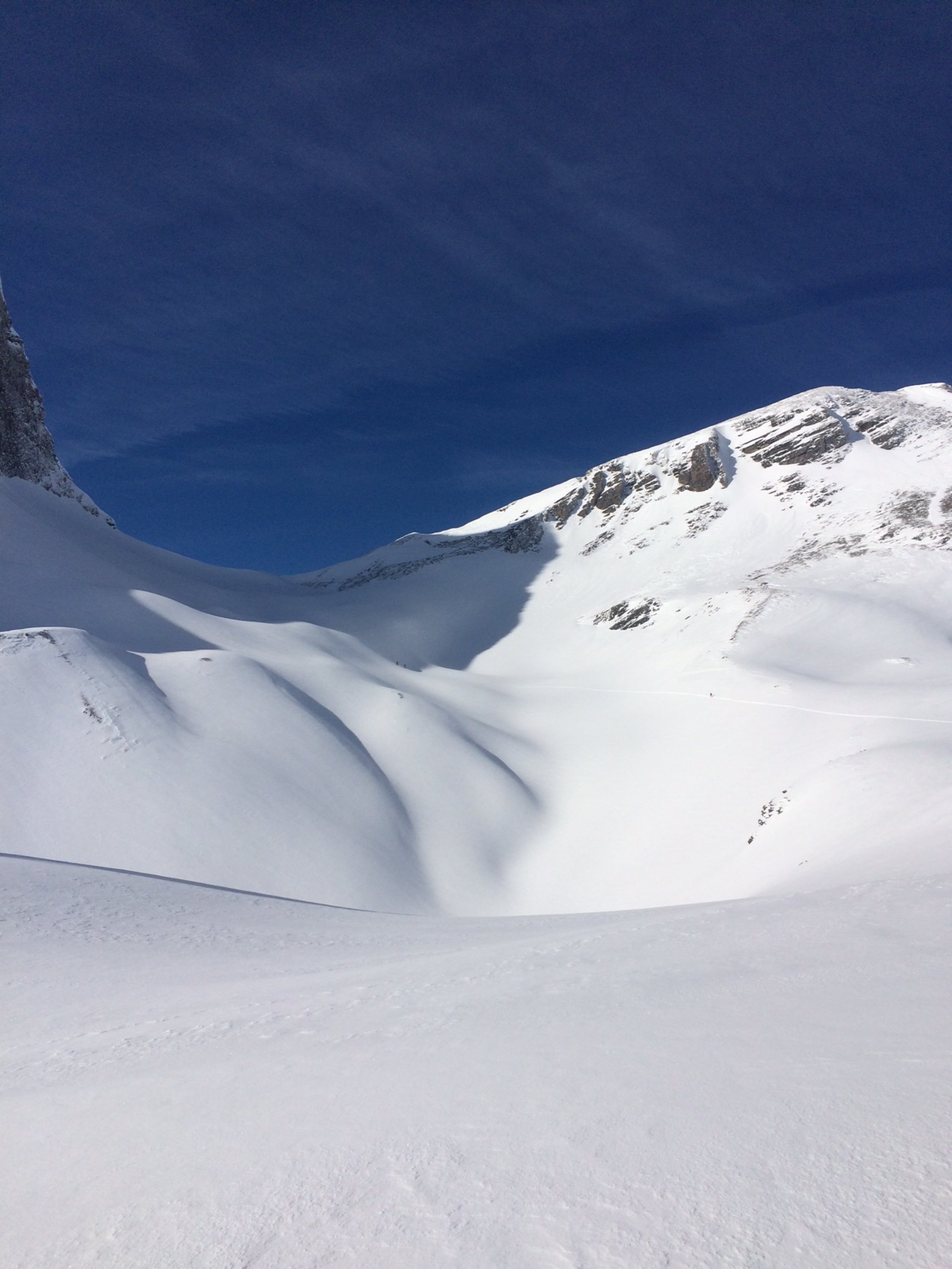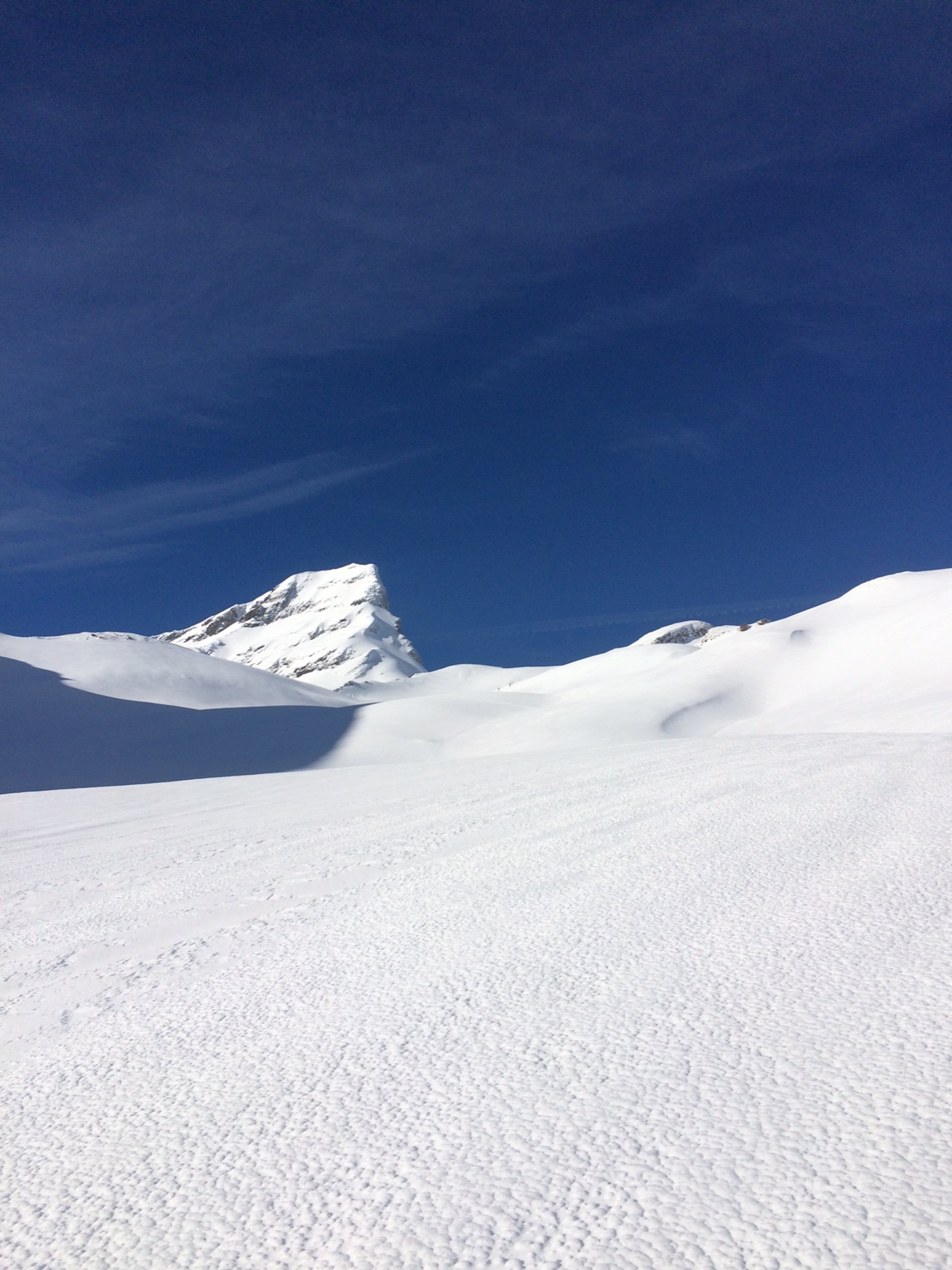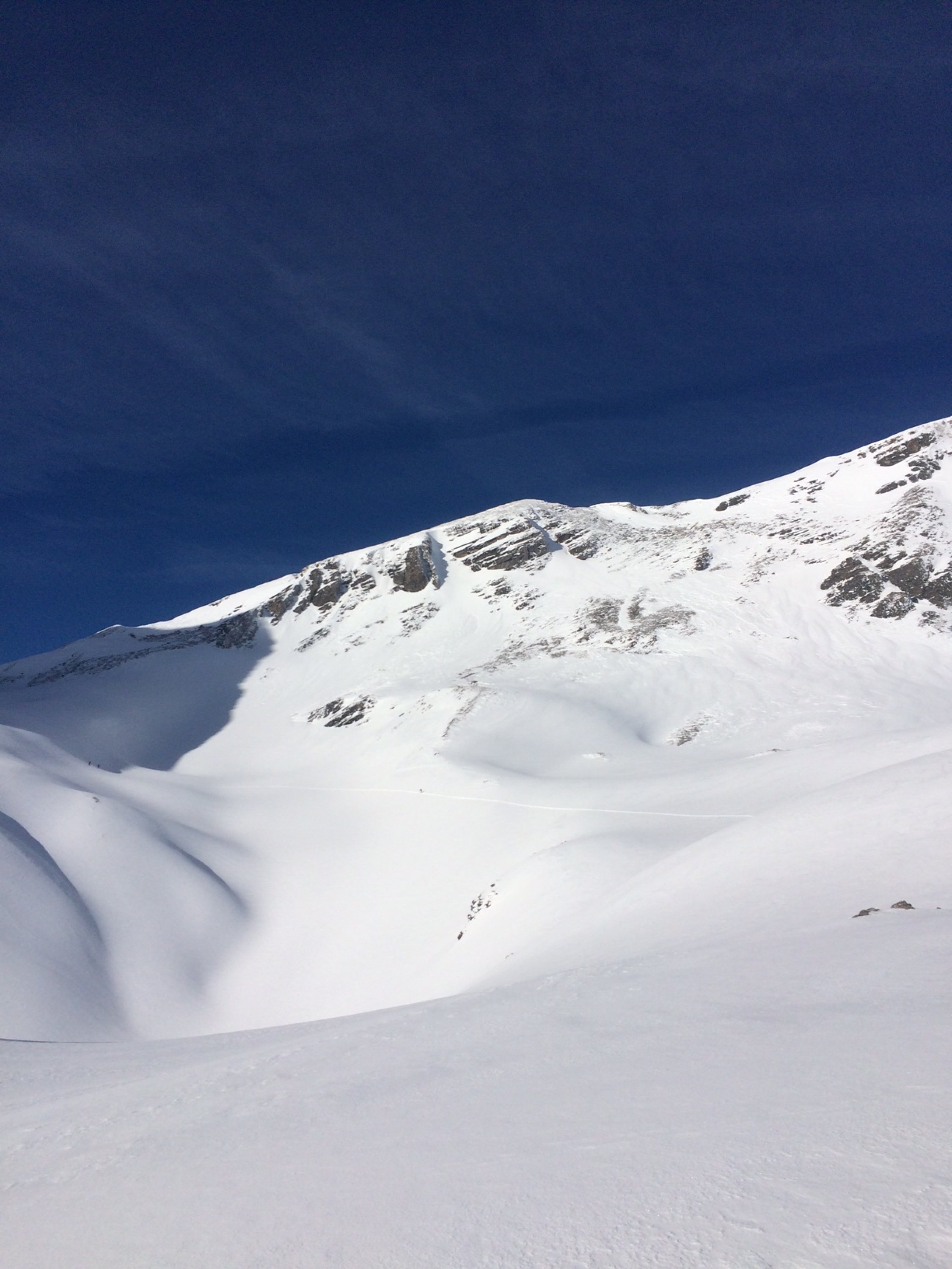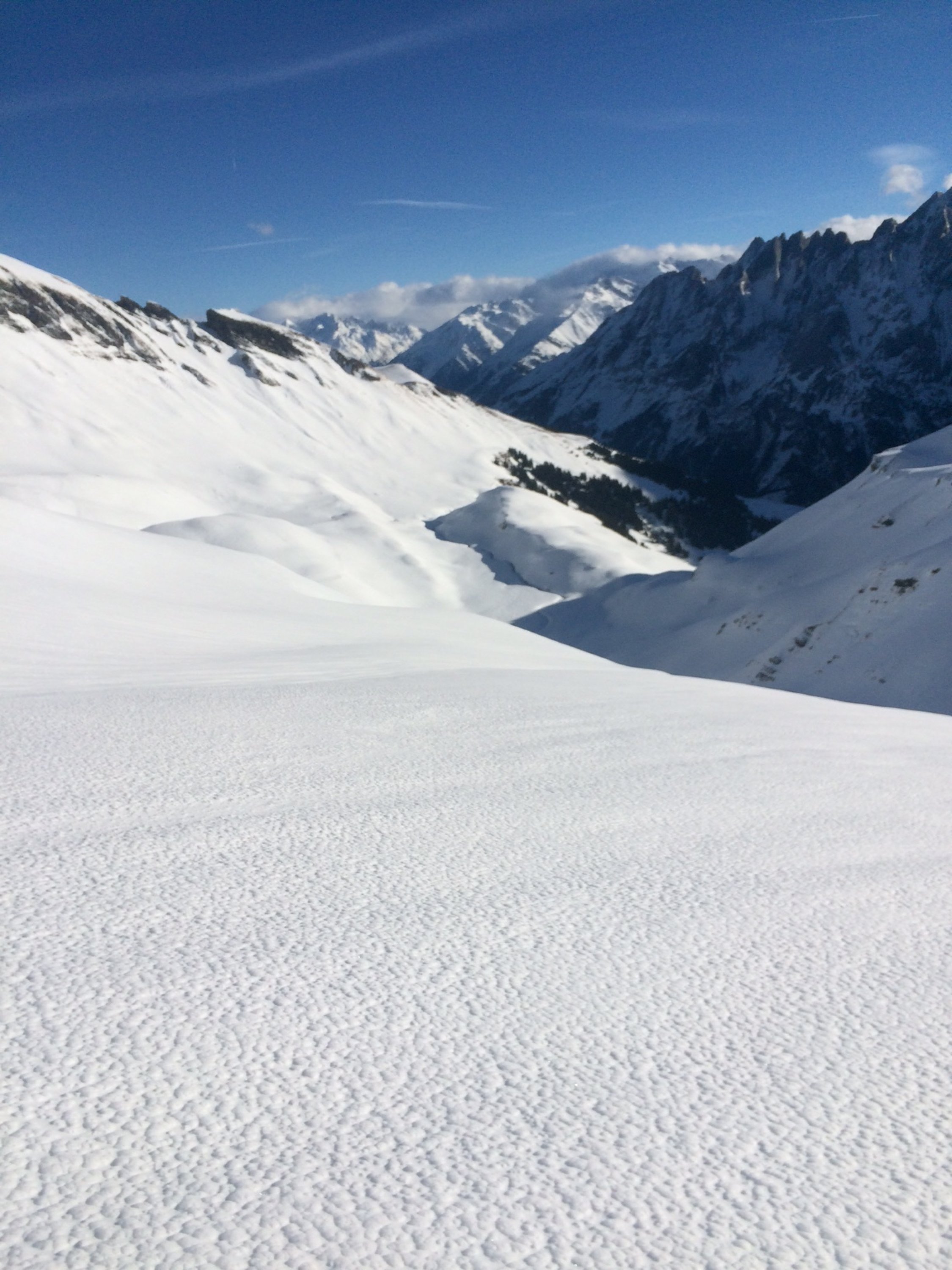 Bis ca. 2300 hat es geregnet. Viele Regenrinnen, welche die Abfahrt erschweren. Bei gemütlicher Fahrt geht es aber recht gut. Alles tragend gefroren bis 2300. Danach langsam in feine Pulverschicht übergehend. Gipfelhang abgeblasen und eher mühsam zu fahren. Aber zwischen 2300 und 2600 traumhafte Verhältnisse mit leichter Pulverauflage! Man kann es krachen lassen.