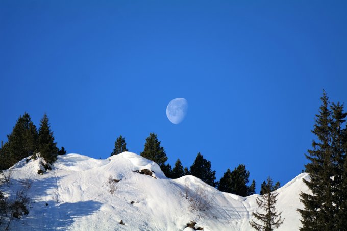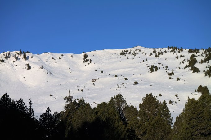Schnee am Morgen nach klarer Nacht hart gefroren aber griffig. Am Gipfel kühler Wind aus südlicher Richtung. Bei der Abfahrt um 10.15 Uhr Gipfelhang bereits leicht aufgesulzt und gut zum Fahren. Eine halbe Stunde später wäre es wohl noch besser gewesen. In den Schattenpartien immer noch gefroren und entsprechend ruppig zum Fahren wegen den Wasserrinnen. An den vorhandenen Spuren war gut zu erkennen, dass der Schnee gestern noch nicht ganz tragend war.