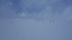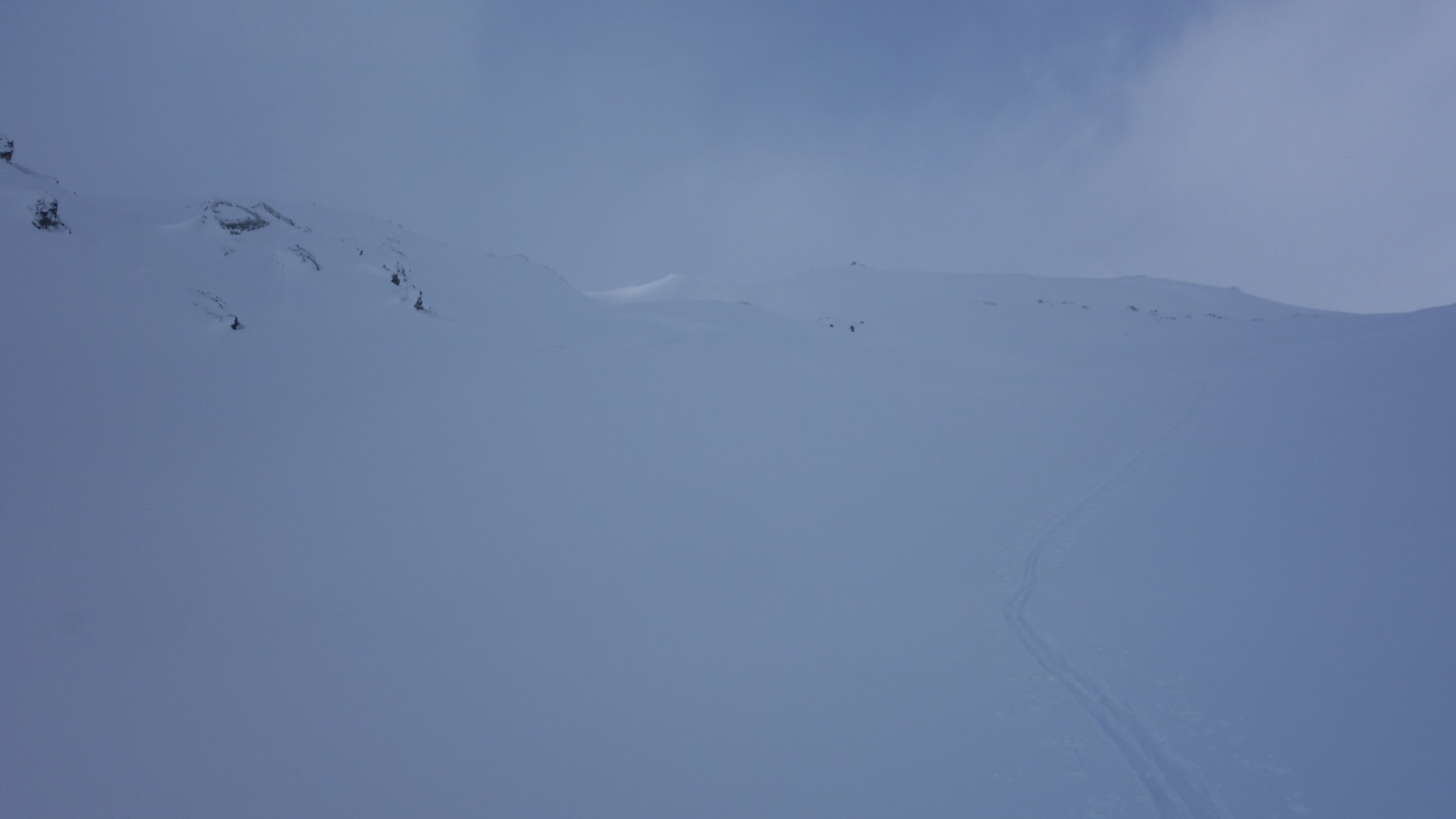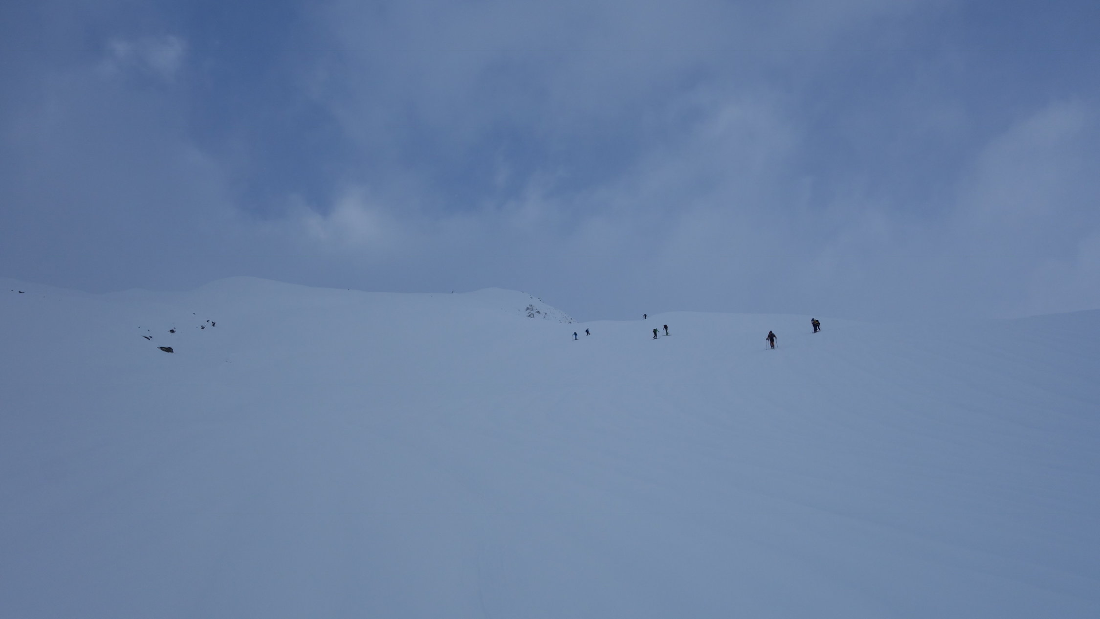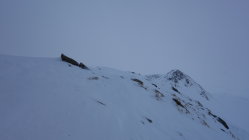 Wetter wie erwartet eher schlecht; sehr windig und wenig Sicht. Fast bis auf den Gipfel hat es Wasserrillen; oben war es fast wie eine Piste, unten ist man durch gefallen.