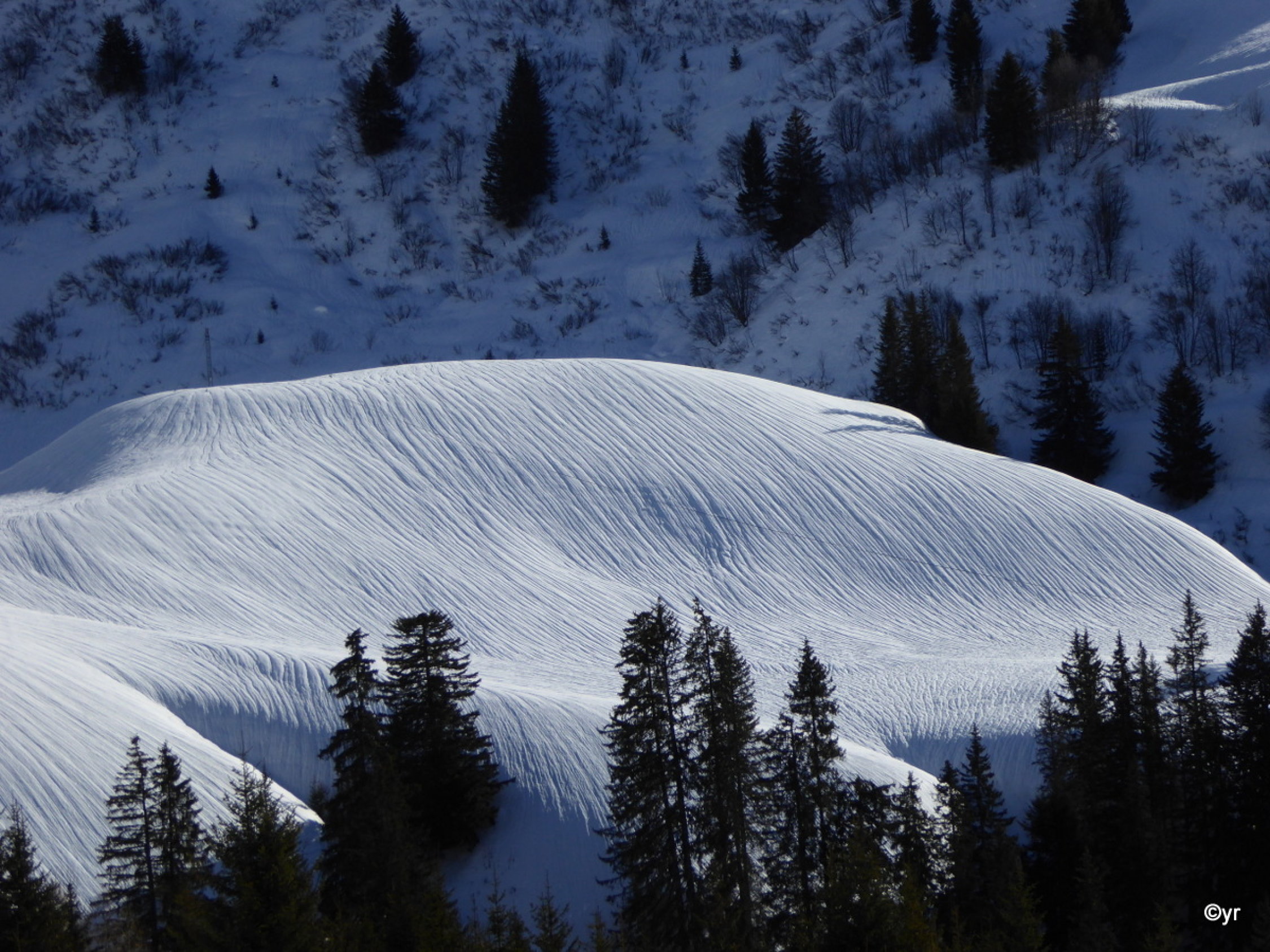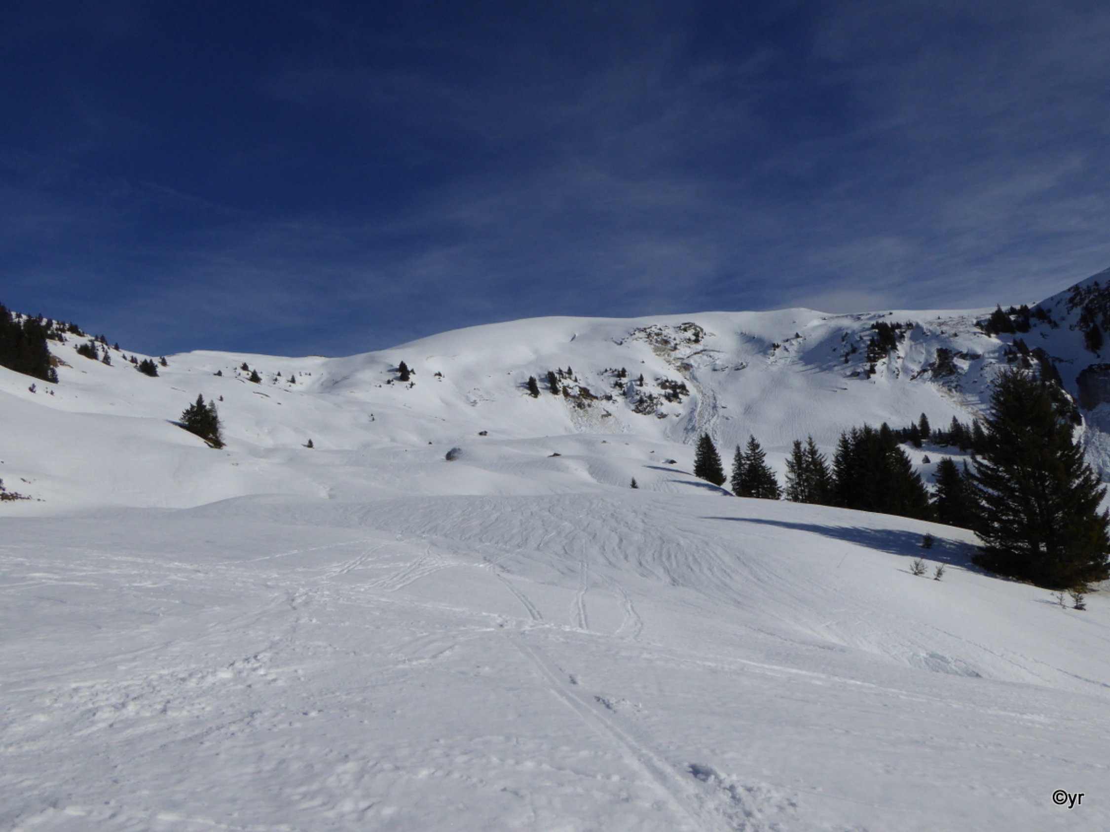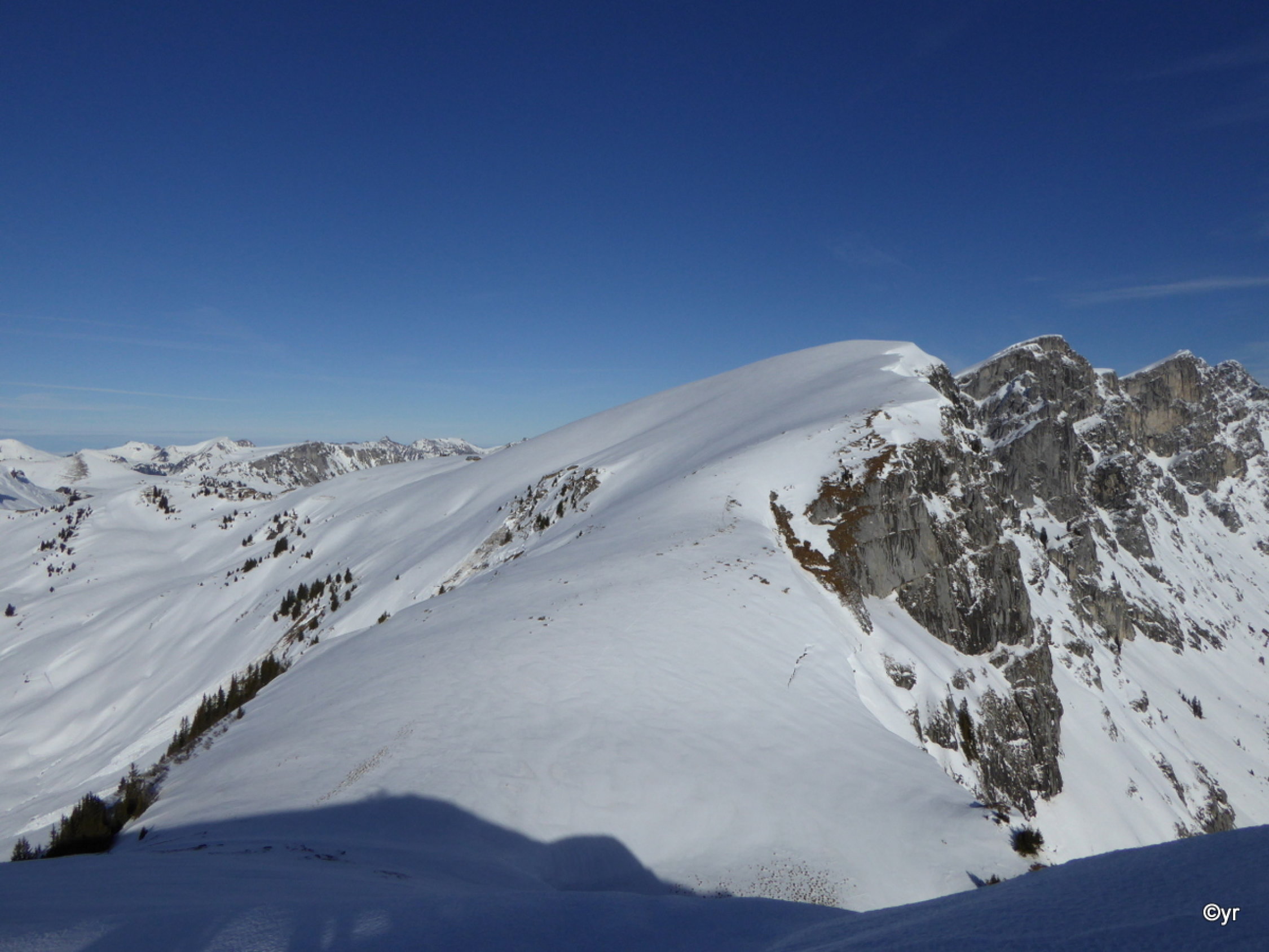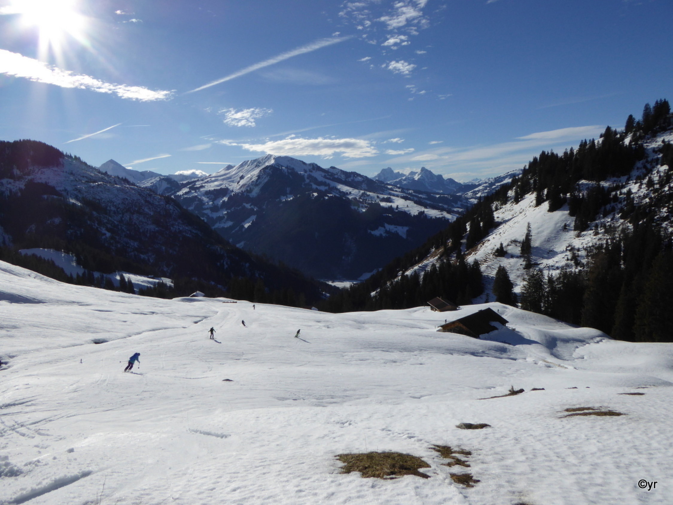 Die Skis mussten bis kurz vor die erste Brücke im Bettelriedgrabe getragen werden. Bäume lagen noch auf der Strasse, aber passierbar. Im ganzen Aufstieg pickelharter Schnee, aber knapp ohne Harscheisen machbar. Grat bei Punkt 2080 recht abgeblasen aber mit genügend Schnee für mit den Skis. Teils mächtige Wächten nach Westen. "Dank" den hohen Temperaturen hatten wir auf der Abfahrt dann teilweise ein minimales Sülzchen an den Südhängen.