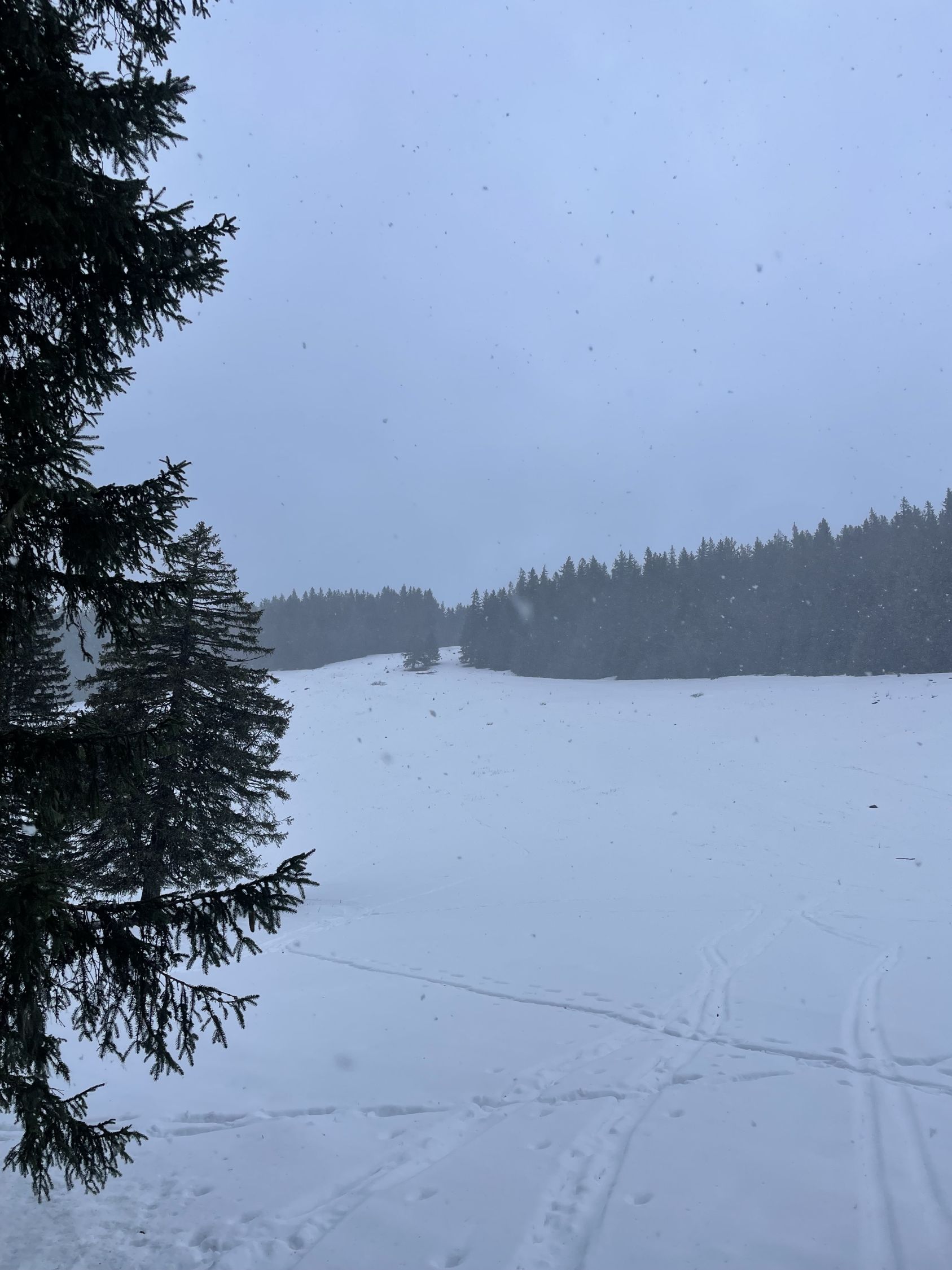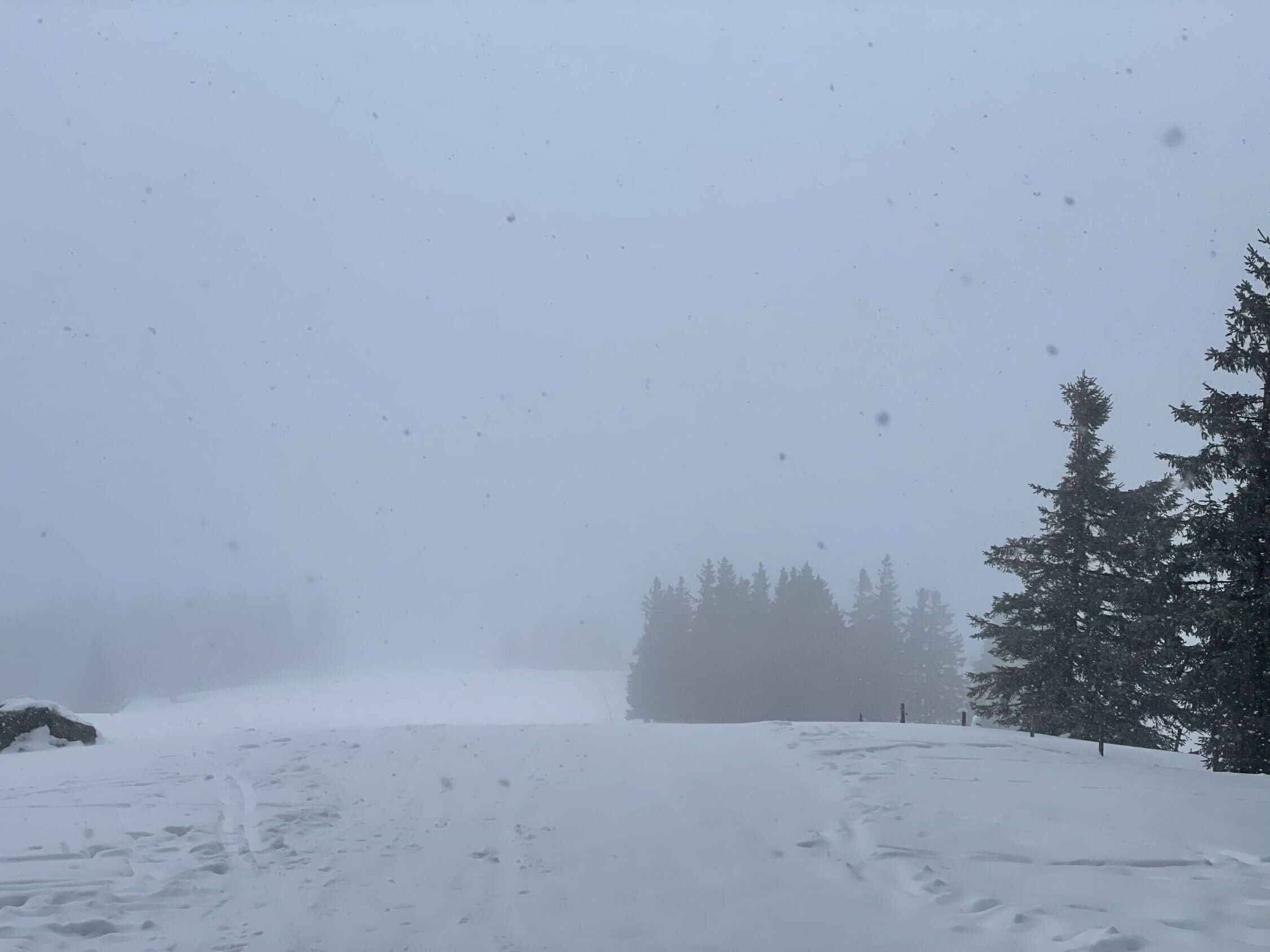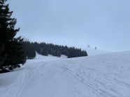 Die Benotung hängt ja immer auch mit den Erwartungen zusammen, und heute erwartete ich Wind und Niederschlag, und da war ich denn schon dankbar, dass es Schnee war und nicht Regen. Ebenso freute ich mich, dass ich beinahe der Einzige heute ab Stollenbach war. Bis zum Toten Mann der Piste nach (Skilifte laufen nicht), dann die Abfahrt zum Hüttenwasen zur Abwechslung mal wieder möglich, genug Schnee. Ab Hüttenwasen einsetzender Schneefall, oberhalb Immisberg dann auch stürmischer Wind und Nebel. Man konnte sich am Viehzaun orientieren und so gelangte ich zum Gipfel. Im Windschatten des Observatoriums liess es sich gut pausieren, Felle runter und Apfel rein. Dann die Abfahrt: oben nur dank extensiver Anwendung der uralten Kulturtechnik des Stemmbogens machbar, inklusive Gesichtspeeling… im Wald windstill und Sicht und sofort hübsch. Hüttenwasenhang gut fahrbarer Nassschnee, Wiederaufstieg Toter Mann gut zum Wiederauftauen und dann runter zum Stollenbach super zu fahren. Immer wieder eine schöne Tour.