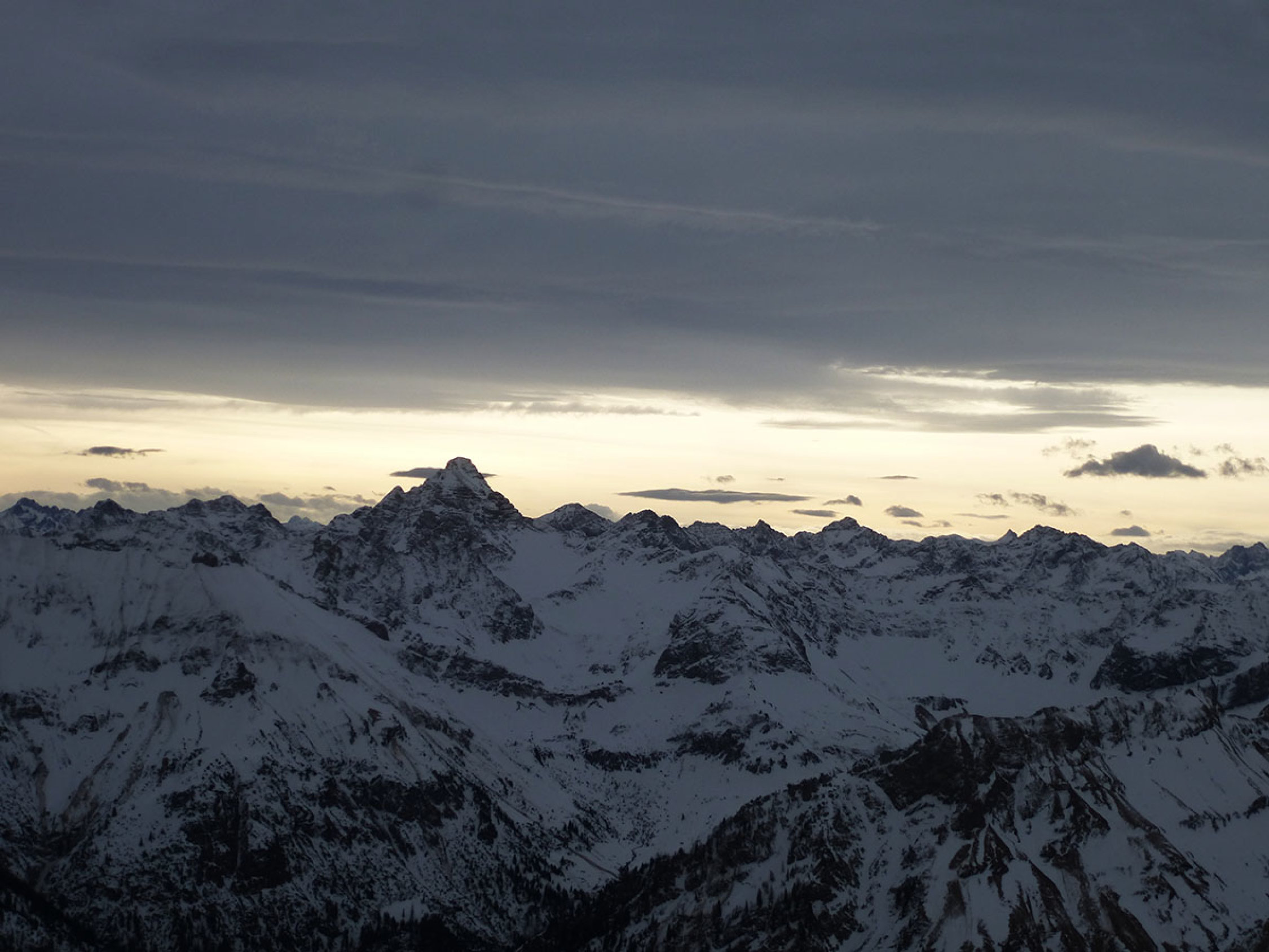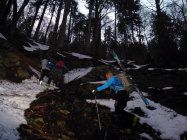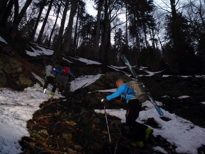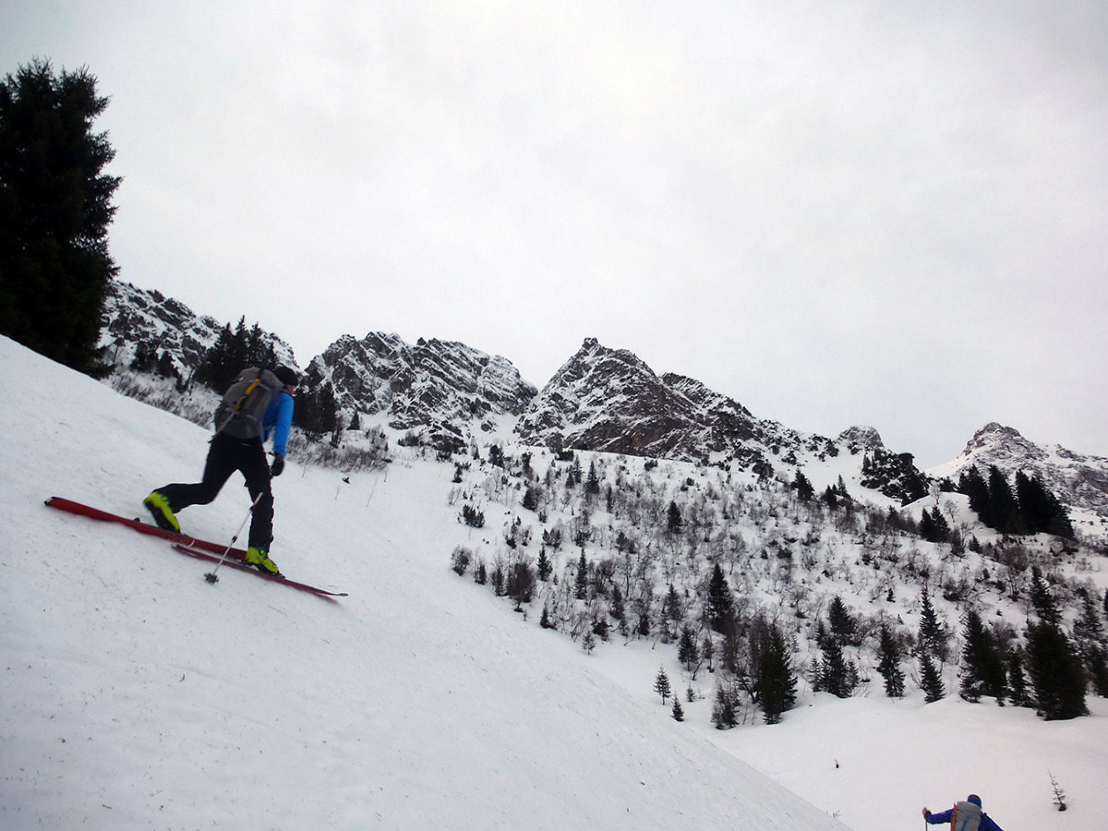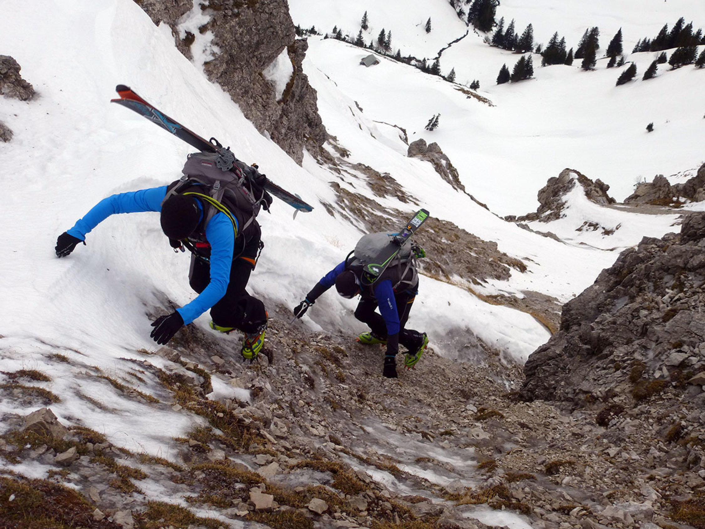 Im steilen Wald unterhalb der Alpe Egg (1445m) eine längere Skitragepassage wegen Schneemangel. Nachdem Wald tragender Harschdeckel bis in die Scharte zwischem Heubatspitze und Kleinem Daumen. Teilweise richtige Eisschicht an der Oberfläche. Harscheisen obligat.