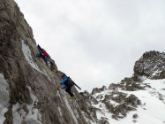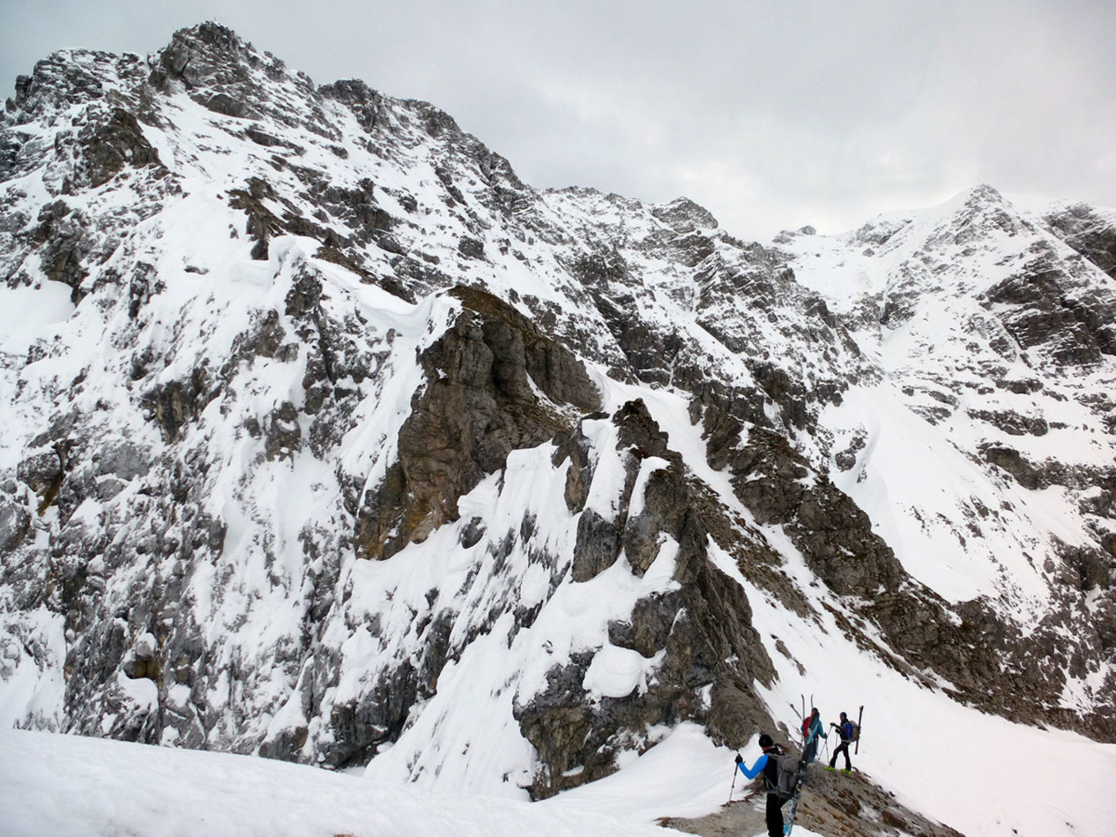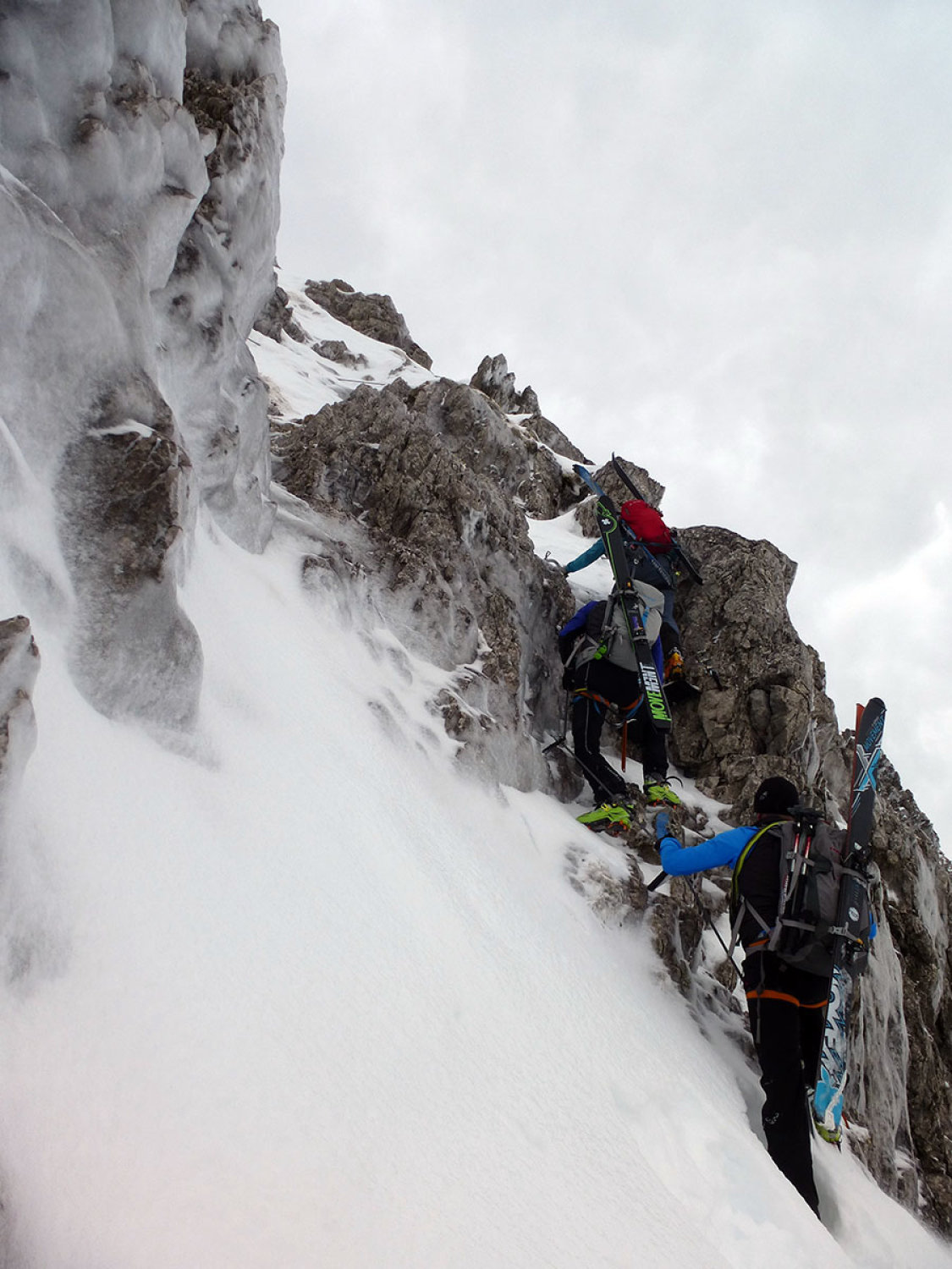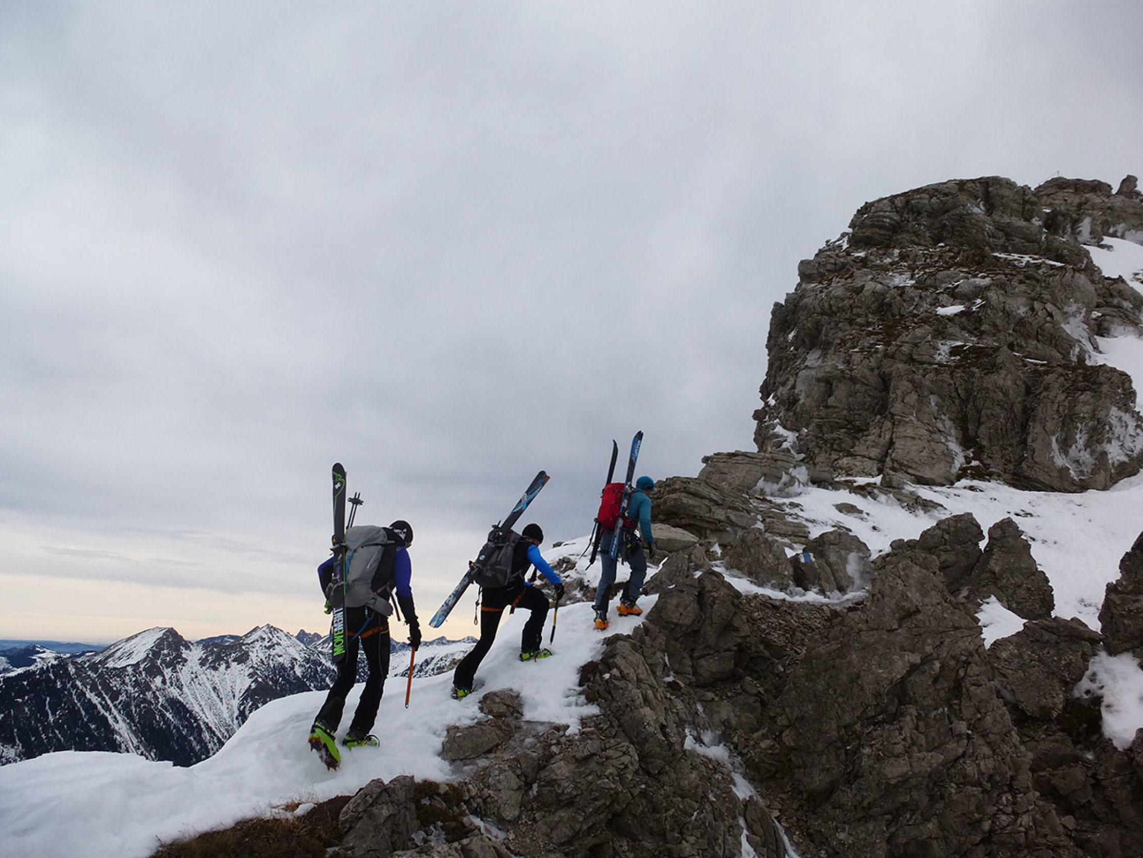 Von der Scharte einem Teilstück des Hindelanger Klettersteiges folgendem dem NW Grat entlang. Unterm steilen felsigen Gipfelaufschwung markante Rechtsquerrung vom NW Grat in die Flanke. Insgesamt gute Verhätnisse am Grat und in der Flanke. Überwiegend guter Trittfirn oder tragender Deckel. Weiter oben vermehrt nicht mehr ganz tragender Deckel und Spuraufwand. Drahtseil an den entscheidenden Stellen aus dem Schnee herausen. Steigeisen und ein Eisgerät/Pickel obligat.