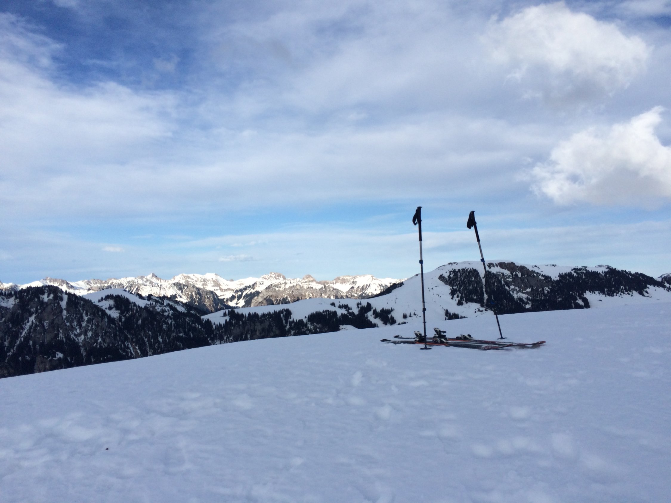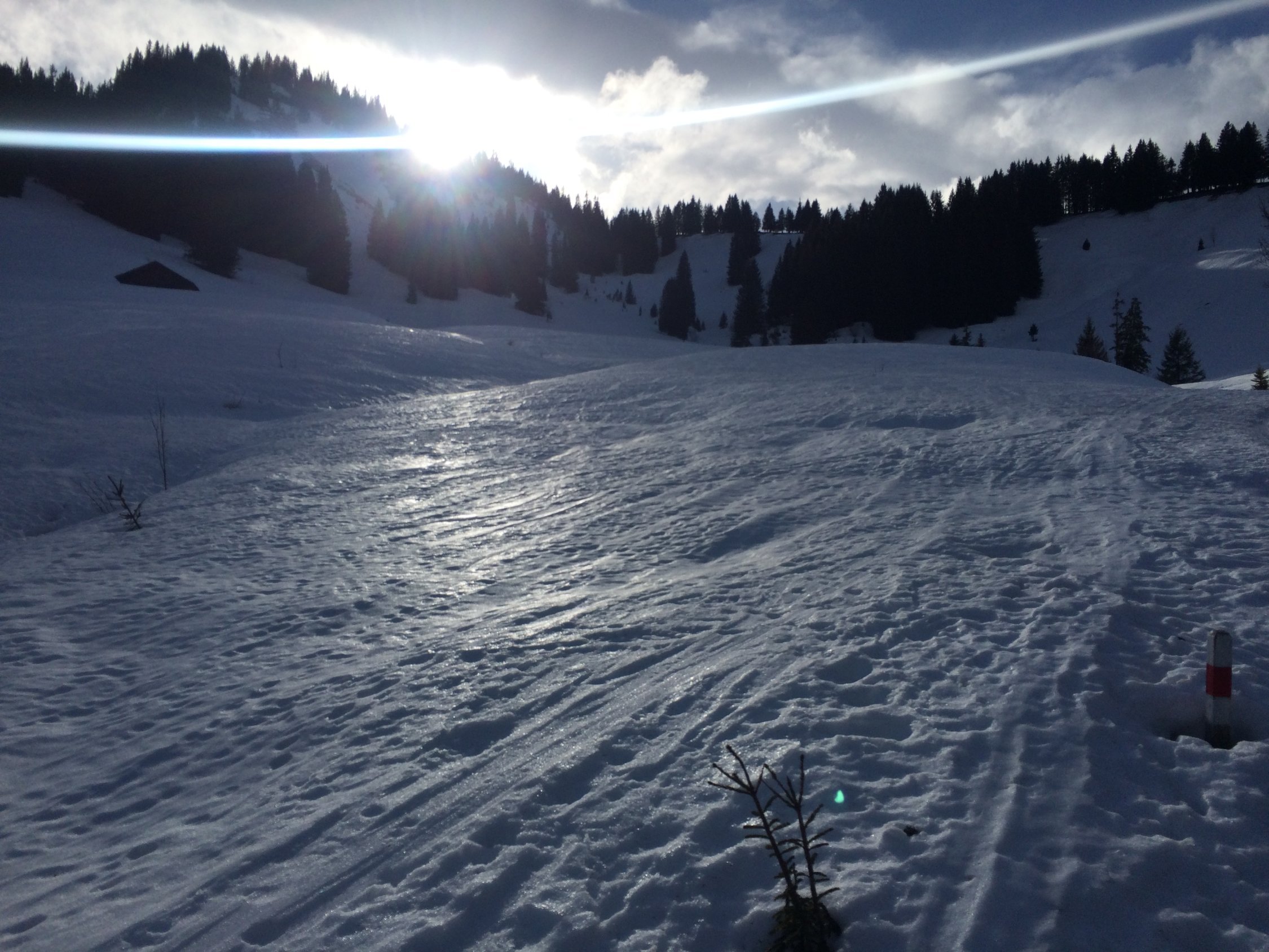 Parkplatz ist sehr eisig. Aufpassen, dass nicht schon vor der Skitour das Steissbein malträtiert wird. Um 12.00h aber ca. 4 Grad. Sonst durchgehend Schneedecke bis auf Grat. Es war hart, aber mit den paar Sonnenstrahlen am Mittag oberhalb der Hütten mit einem kleinen Sülzchen. Oben mit Regenrillen. Prächtiges Aussichtswetter auf dem Gipfel. Abfahrt durch Menigwald zu Pkt. 1531 und nochmals hoch zum Stand Pkt.1939 und gequert zum Meniggratgipfel. Aufstieg durch Schwalmere solala, oben steil.
