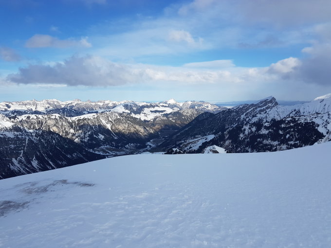 Sehr starker Wind ab Grimmifurgge. Dafür aber bessere Sicht als erwartet, es drückte immer wieder die Sonne und blauer Himmel durch.