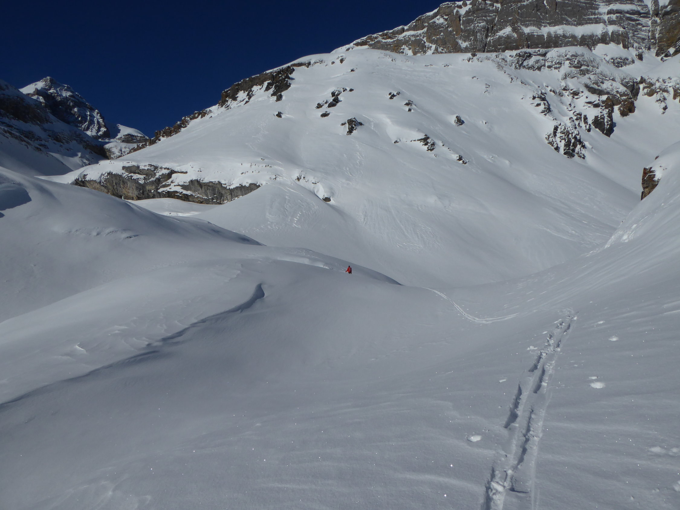 Keine, die Route scheint stabil, keine Anrisse erkennbar. Der Neuschnee ist nicht überall mit dem Altschnee verbunden, aber mengenmässig unkritisch.