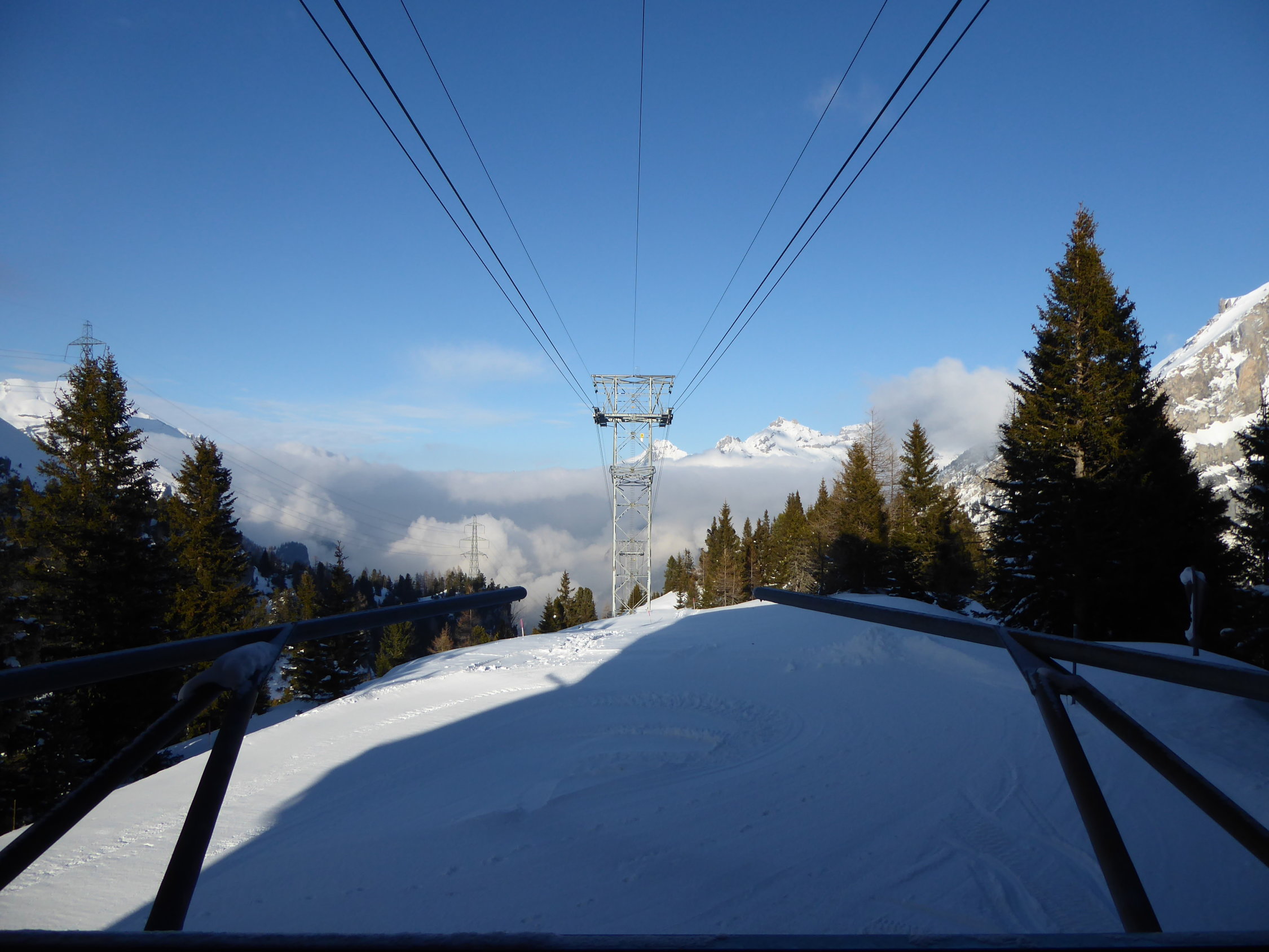 Kurz vor Ankunft haben wir den Gipfelbuch-Autoren tourist von weitem gesehen, der heute bereits einen Eintrag hinterlassen hat. Seinen Erläuterungen zu den Verhältnissen ist eigentlich nichts hinzuzufügen, ausser dass es eher 10 cm statt 10 m Neuschnee sind... Teilweise sehr schön zum fahren, teilweise windverfrachtet und etwas unberechenbarer. Zwischendurch auch blankgefegte Passagen. Wir waren heute von dieser Seite her die einzigen beiden. Da uns die Abfahrt von Sunnbüel wegen zahlreicher Lawinen und vielen aperen Stellen nicht gluschtete, sind wir wieder mit der Bahn runter. Glück mit den Nebel, die Obergrenze war ca. 2100 m, ab Sunnbüel von Anfang an grand bleu.