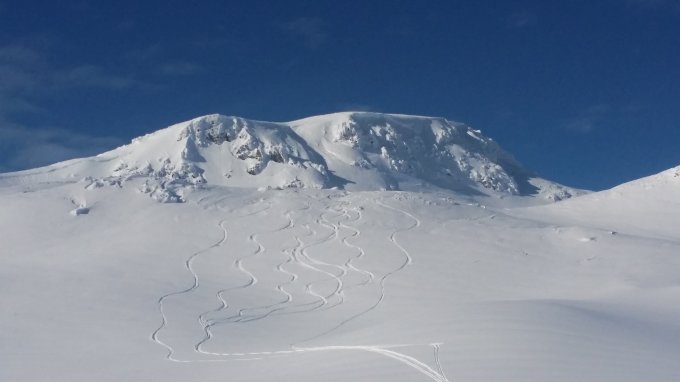 Oben perfekter Pulver und unbefahrene Hänge. Es waren ca. 12 Leute insgesamt auf dem Gipfel.