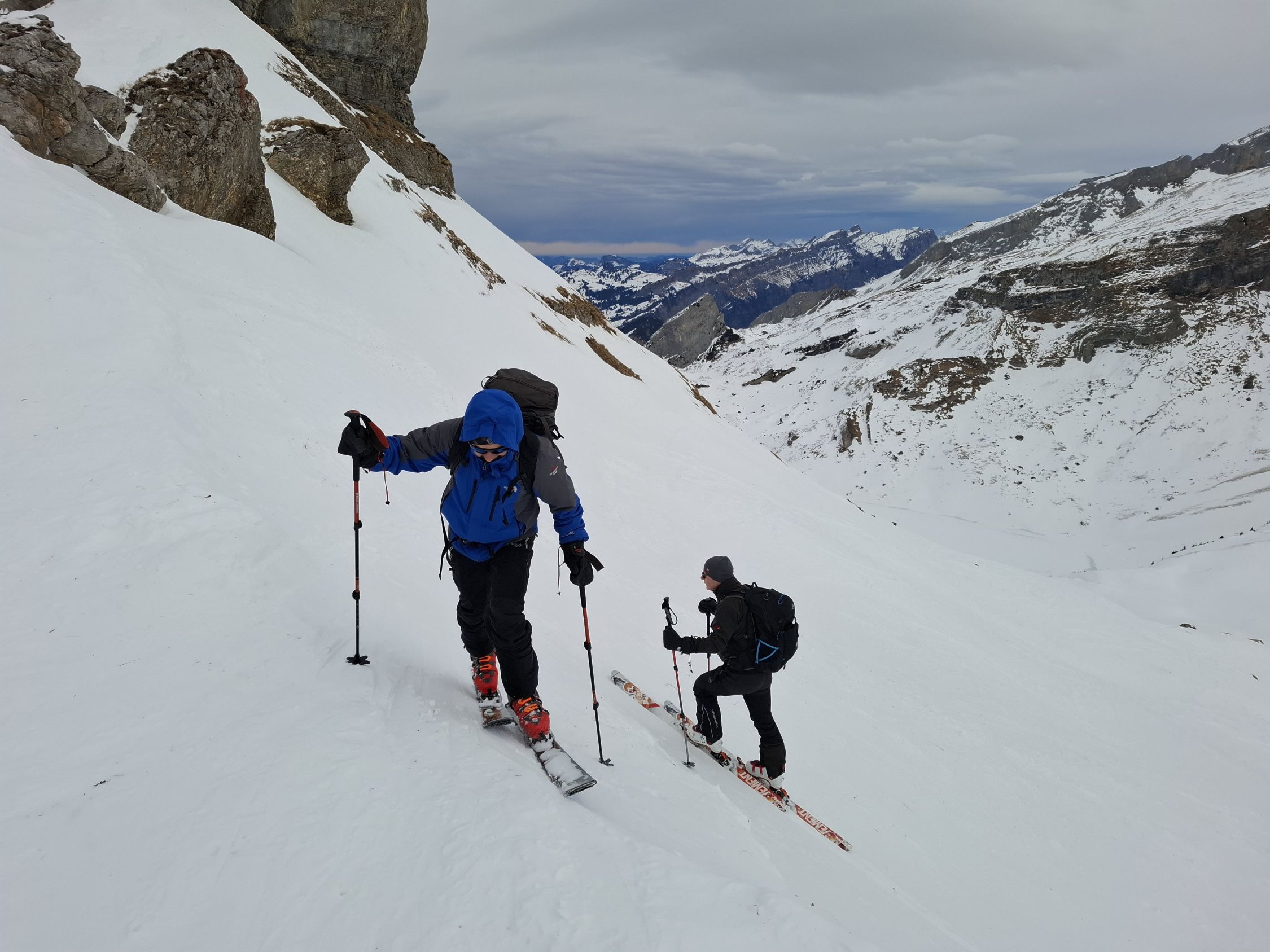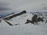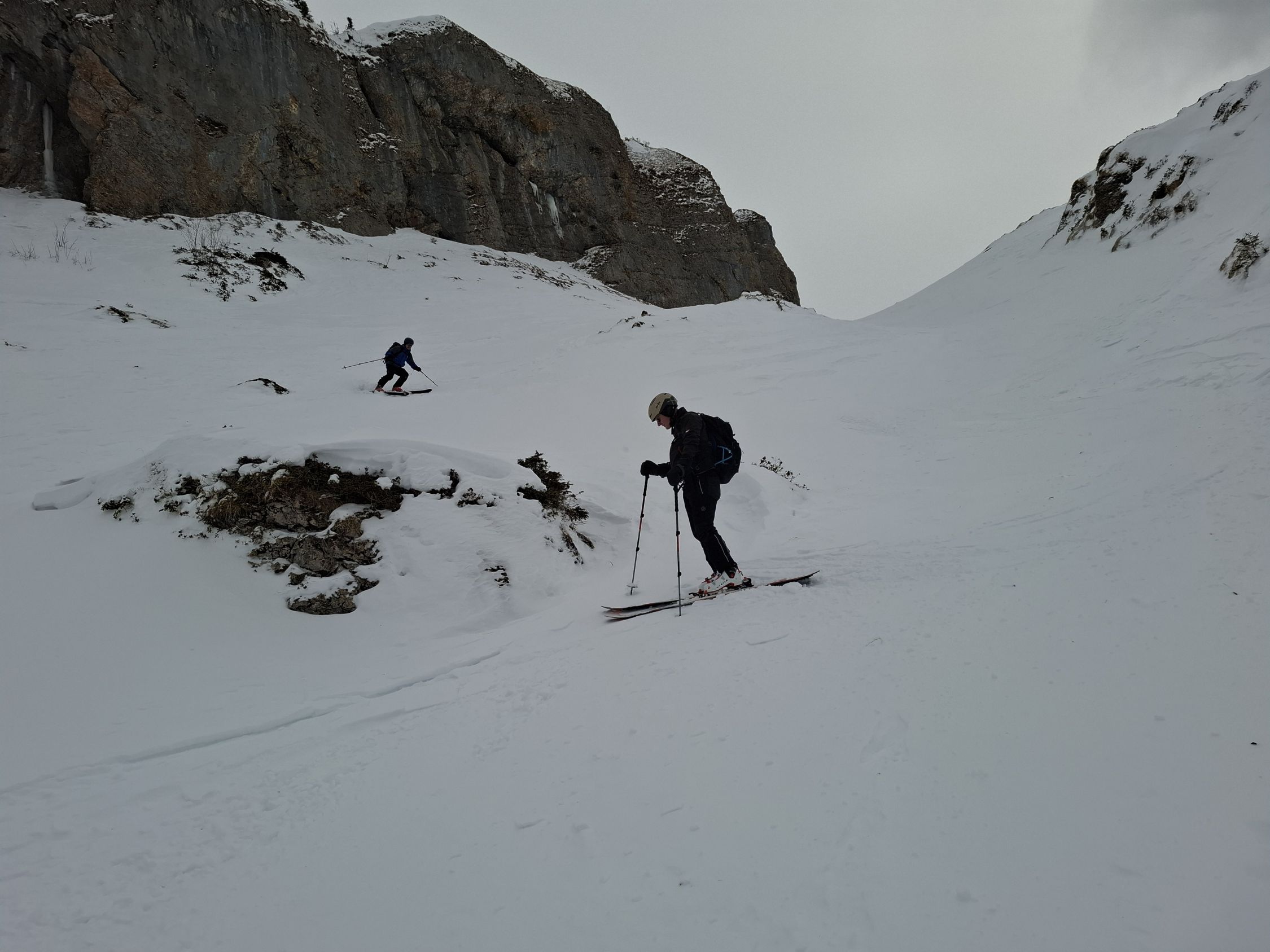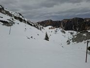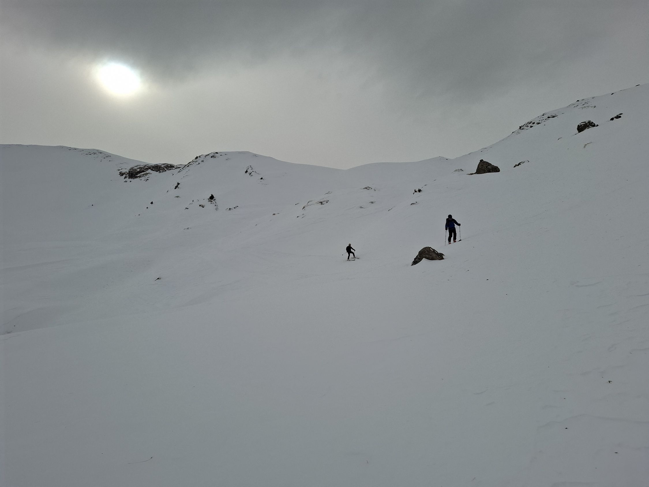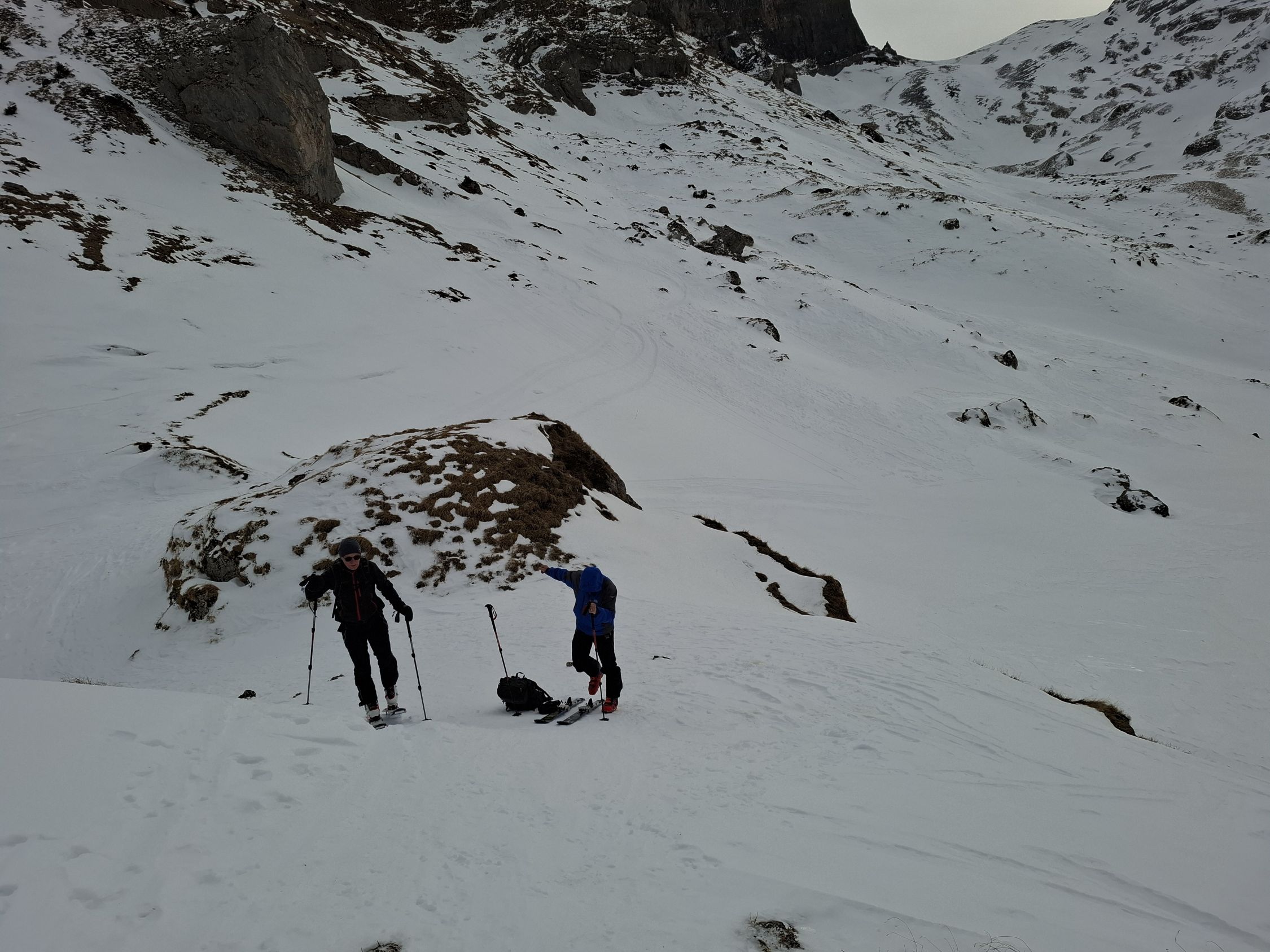 Es herrschte starker Föhn. Auf dem Gipfel war es, erfreulicherweise, kurz fast windstill. Vom schönen Pulver von vorgestern war nichts mehr vorhanden. Die Spur war, falls nicht verweht, sehr hart. Bevor wir uns an die Flanke, oberhalb des Spilauer Sees machten, montierten wir die Harscheisen. Und das war gut so.