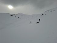 Der Pulverschnee war hartgepresst und die Kuppen waren abgeblasen. Das Licht, bei der Abfahrt, war diffus und nur Unebenheiten im Schnee (durch Wind oder frühere Spuren) erlaubten bessere Orientierung.