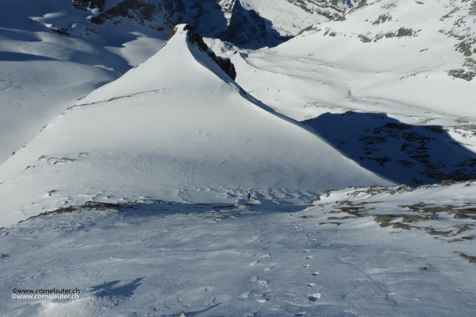 Danach super Verhältnisse, anfangs ein Schäumchen Neuschnee auf harter tragender Unterlage, umso weiter hinauf werden die Mengen grösser und unterschiedlicher….etwas abrutschen im Aufstieg kann nicht verhindert werden, Harscheisen, aber der Neuschnee ist mit der harten Unterlage nicht verbunden, teils etwas Triebschneetaschen. Auf dem Gletscher Blüemlisalpfirn hie und da etwas verblasen, ein paar wenige Stellen abgeblasen bis auf die harte vereiste Unterlage, sonst auch da gute Verhältnisse.