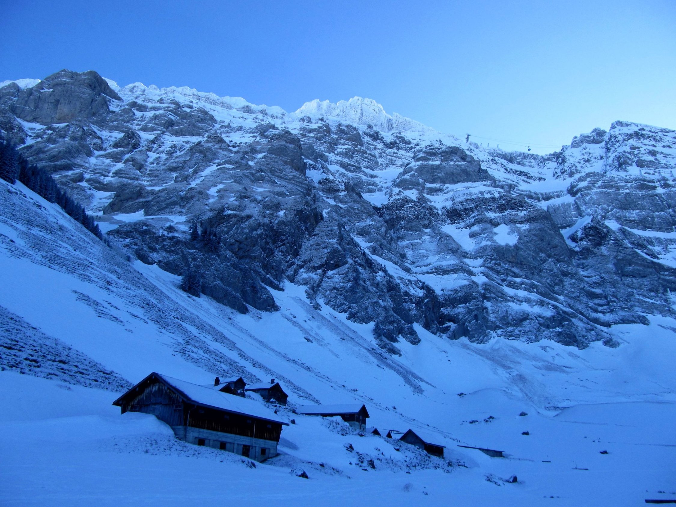 Start im Hochnebel bei Minusgraden. Burglind hat auf der Schwägalp heftig gewütet. Was der Wind nicht verfrachtet hat, wurde durch den Regen an den Hängen weggeputzt. Bei den Alphütten gab es tiefe Furchen im Schnee. Es müssen richtige Sturzbäche durch die Schwägalp-Ebene geflossen sein.