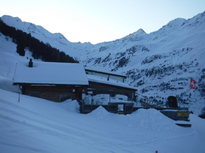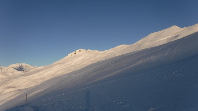 Tourenbeginn um 07:40 Uhr bei -6°C unter wolkenlosem Himmel. Aufstieg auf verfirnten Schneeverhältnissen, im oberen Bereich noch pulvrig. Abstieg im Mattjischtälli auf wechselnden Verhältnissen zwischen abgeblasenem Bruchharsch und Pulver (oben), tiefer dann Pulver, aber kein Sulz trotz Sonneneinstrahlung. Die SS können schon am Parkplatz angeschnallt werden.