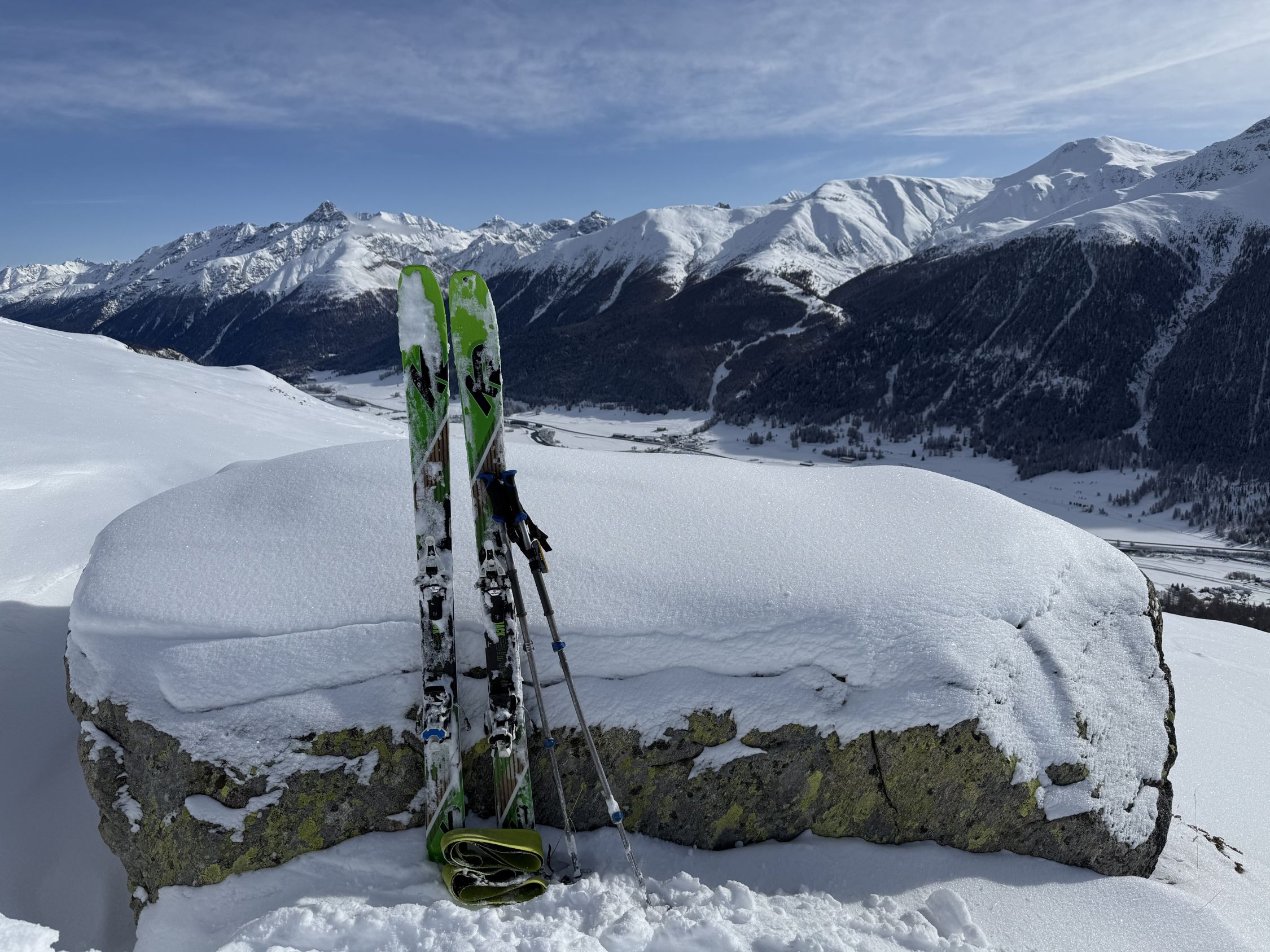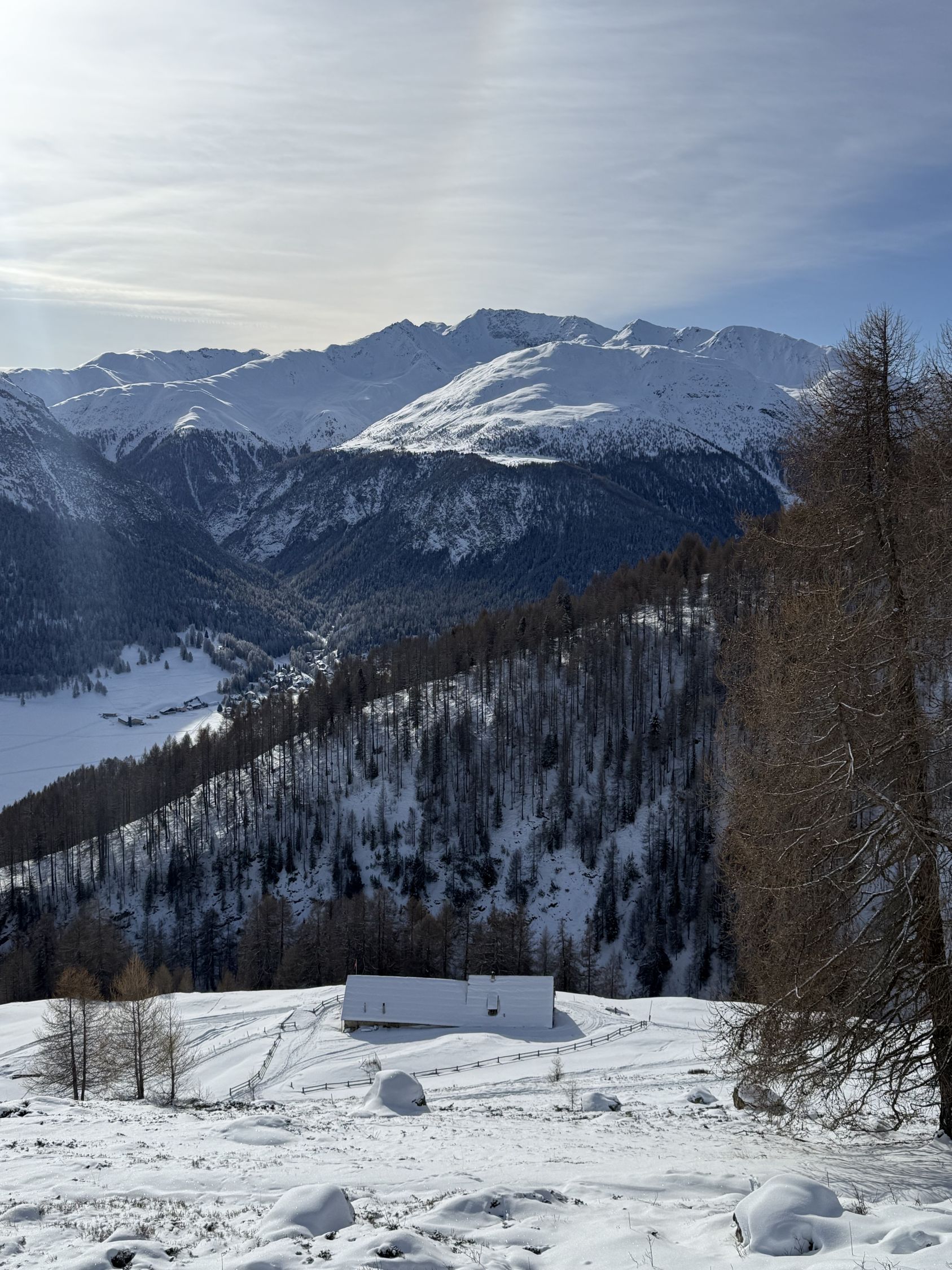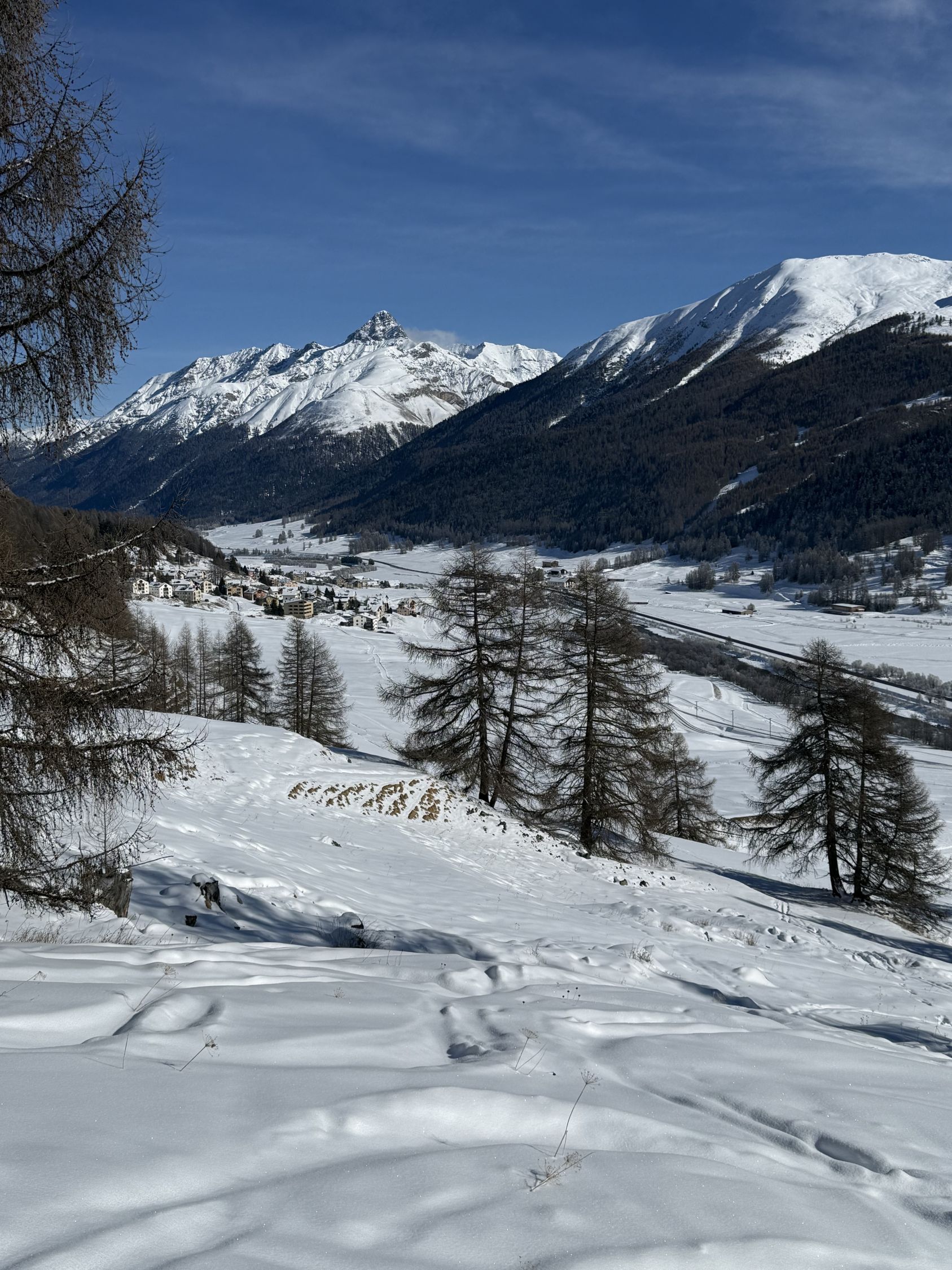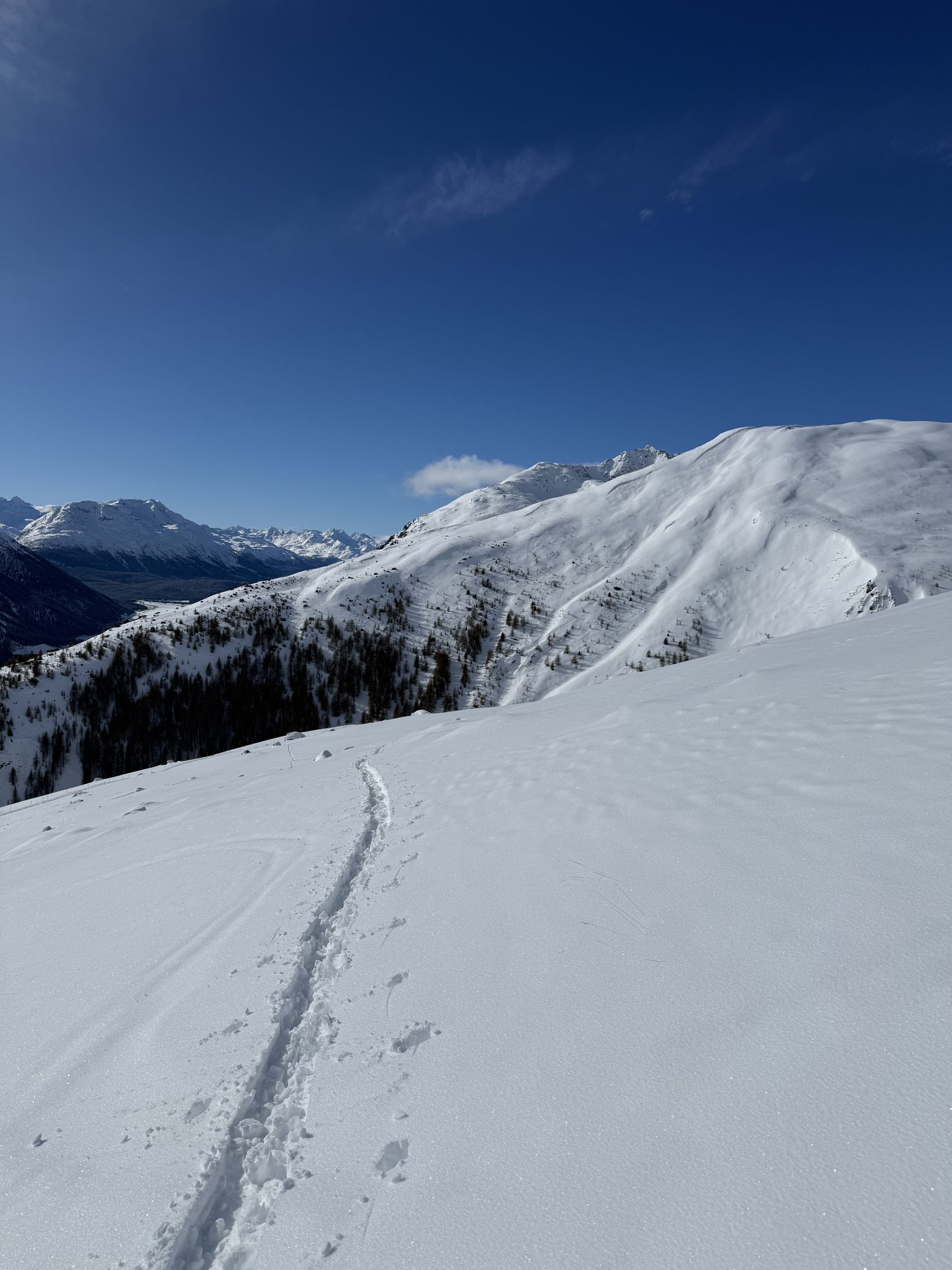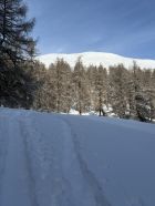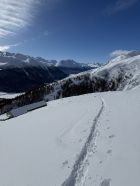 Tourenziel Boschetta Punkt 2484 m, ab 2375 m zu wenig Schnee, Umkehr, ÖV Tour, WS-. Start Bahnhof Madulain 8.30 Uhr, minus 2 Grad, windstill, blauer Himmel, ab God Spinas Sonne. Mehr oder wenig der präparierten Piste bis Alp Es-cha Dadour, weiter auf Schneeschuhspur bis Höhe 2250 und weiter in schönem Pulverschnee bis zum Umkehrpunkt Höhe 2350 m.
