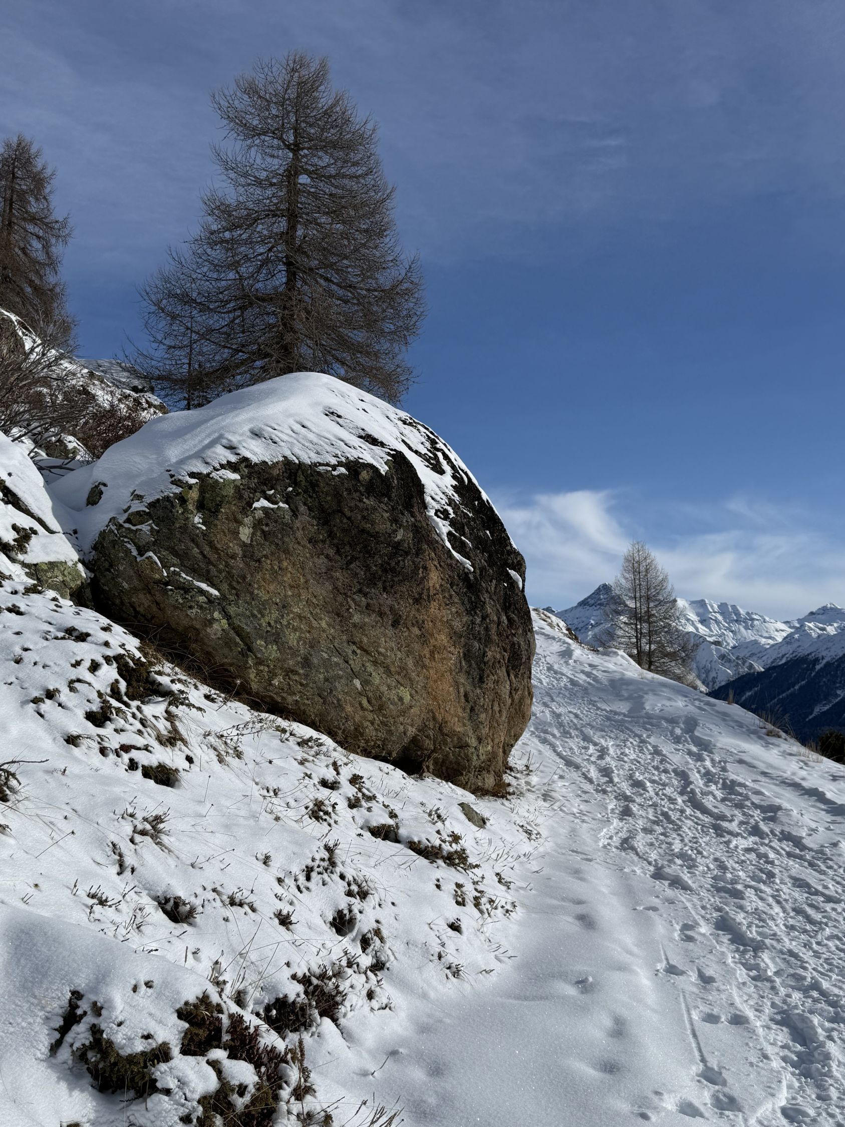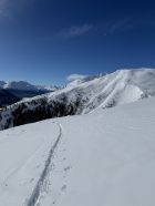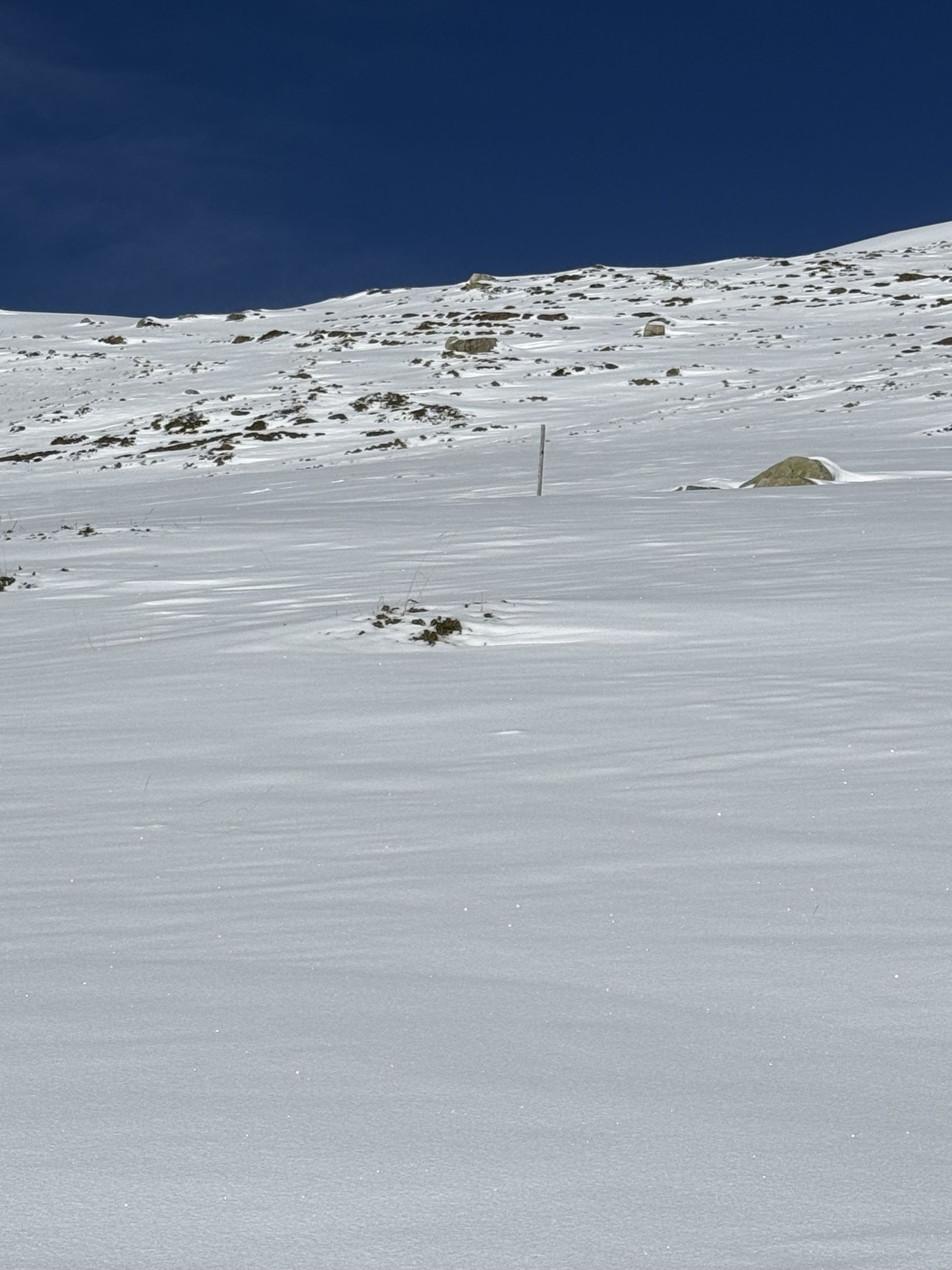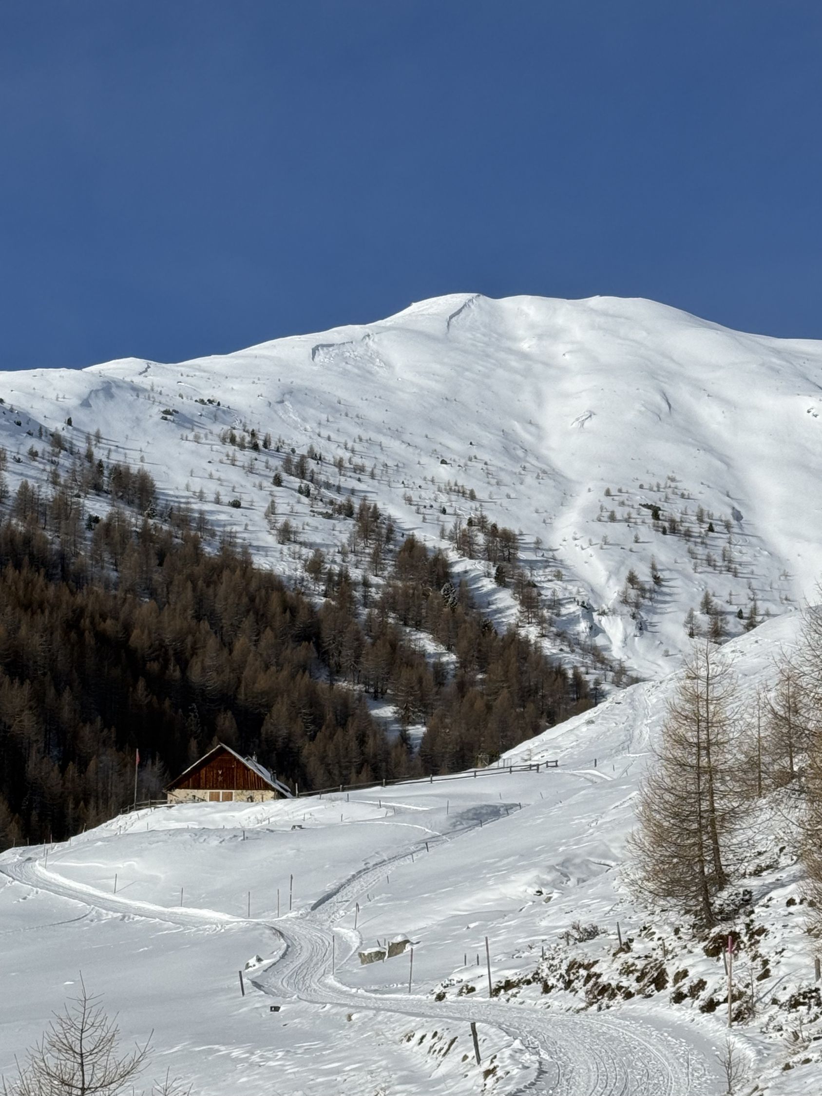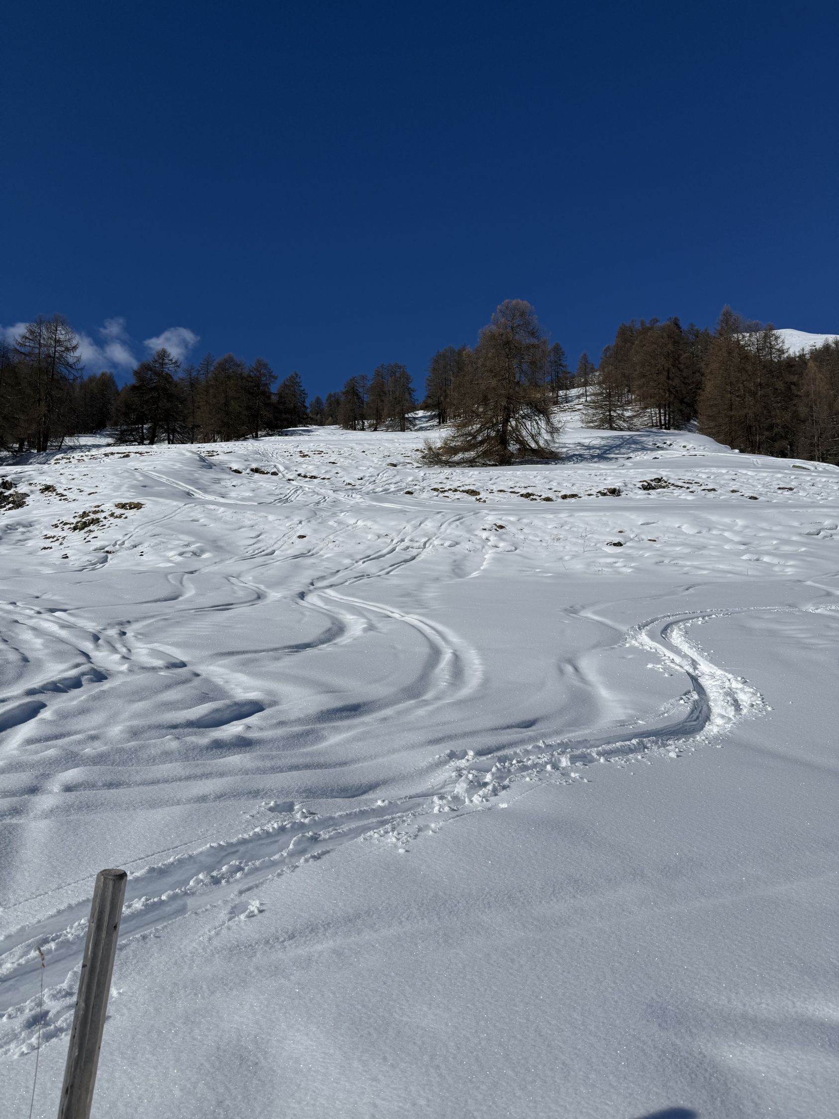Tourenziel Boschetta Punkt 2484 m, ab 2375 m zu wenig Schnee, Umkehr, ÖV Tour, WS-. Start Bahnhof Madulain 8.30 Uhr, minus 2 Grad, windstill, blauer Himmel, ab God Spinas Sonne. Mehr oder wenig der präparierten Piste bis Alp Es-cha Dadour, weiter auf Schneeschuhspur bis Höhe 2250 und weiter in schönem Pulverschnee bis zum Umkehrpunkt Höhe 2350 m.