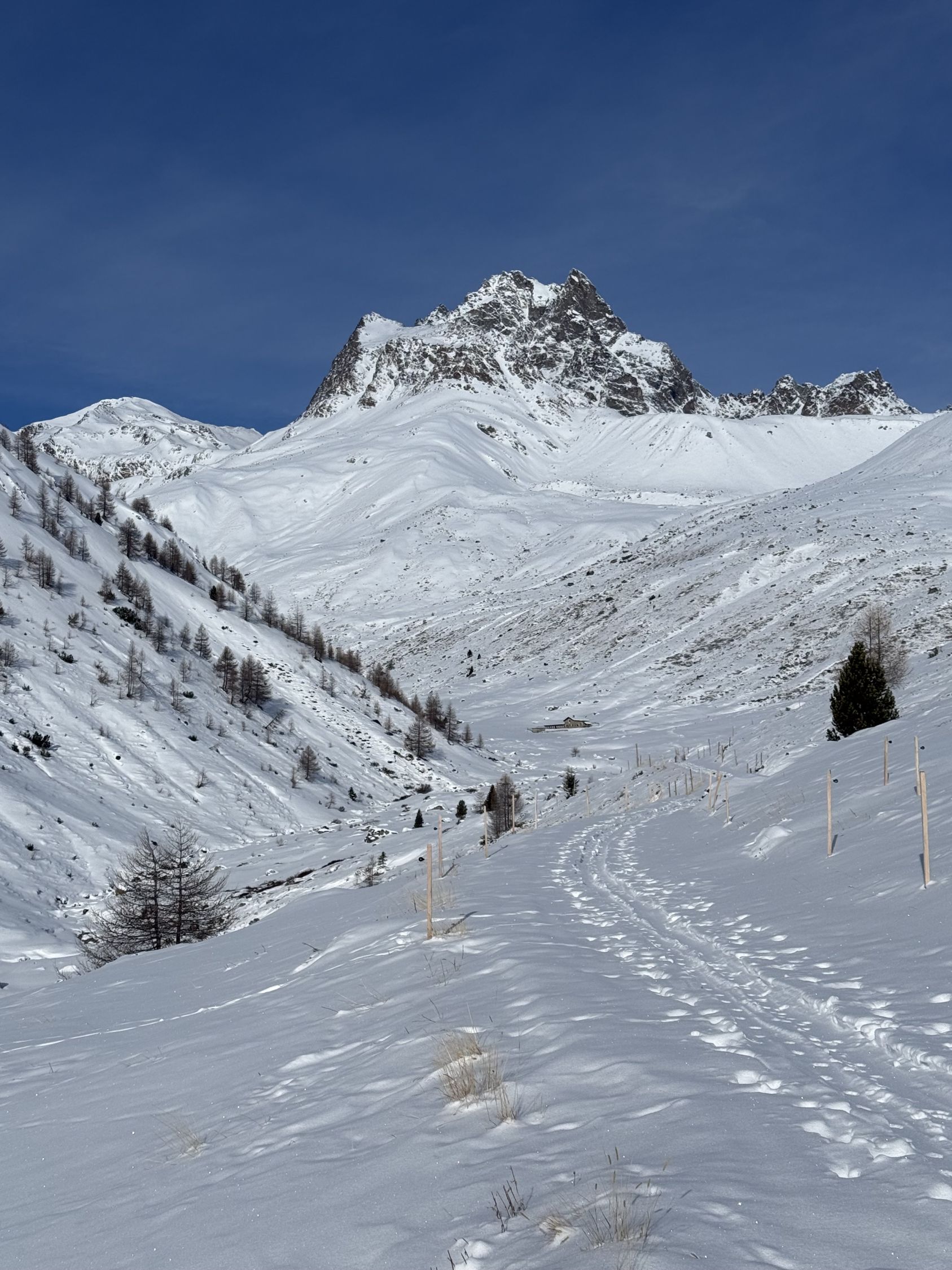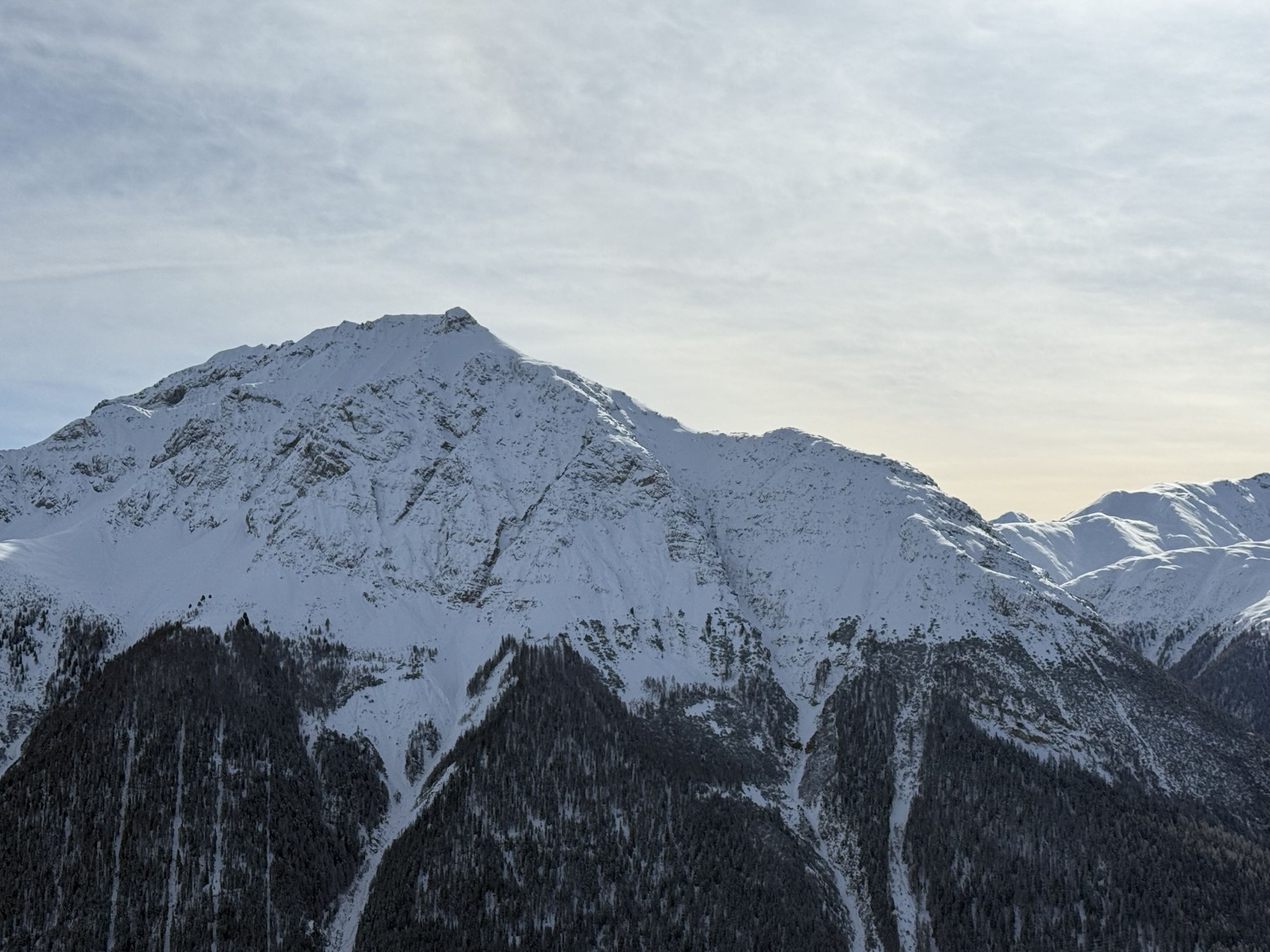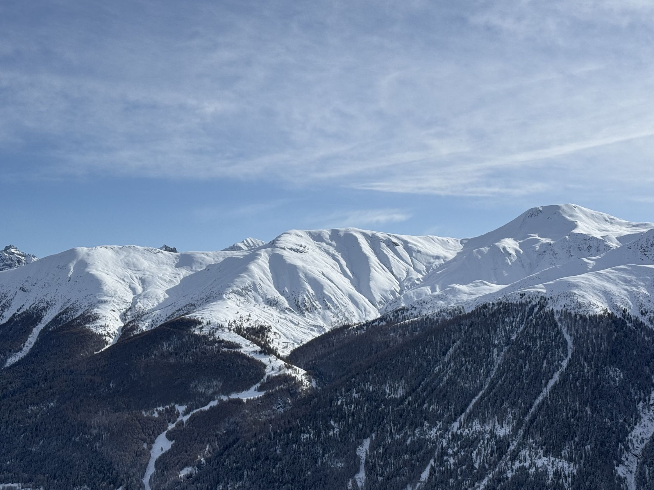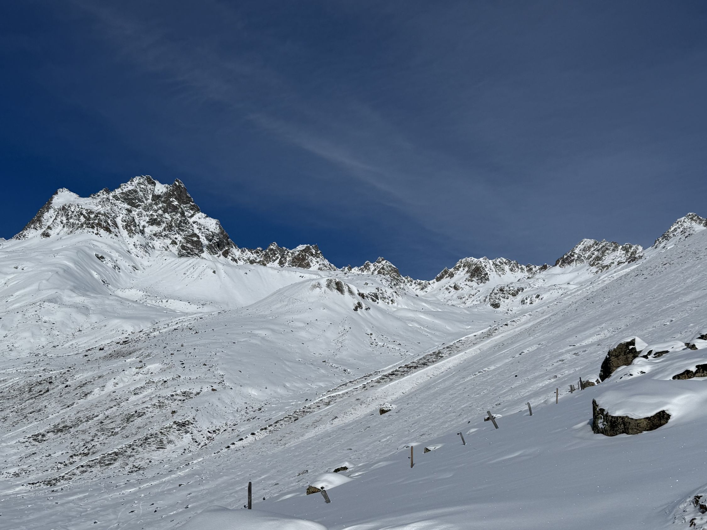 Tourenziel Boschetta Punkt 2484 m, ab 2375 m zu wenig Schnee, Umkehr, ÖV Tour, WS-. Start Bahnhof Madulain 8.30 Uhr, minus 2 Grad, windstill, blauer Himmel, ab God Spinas Sonne. Mehr oder wenig der präparierten Piste bis Alp Es-cha Dadour, weiter auf Schneeschuhspur bis Höhe 2250 und weiter in schönem Pulverschnee bis zum Umkehrpunkt Höhe 2350 m.
