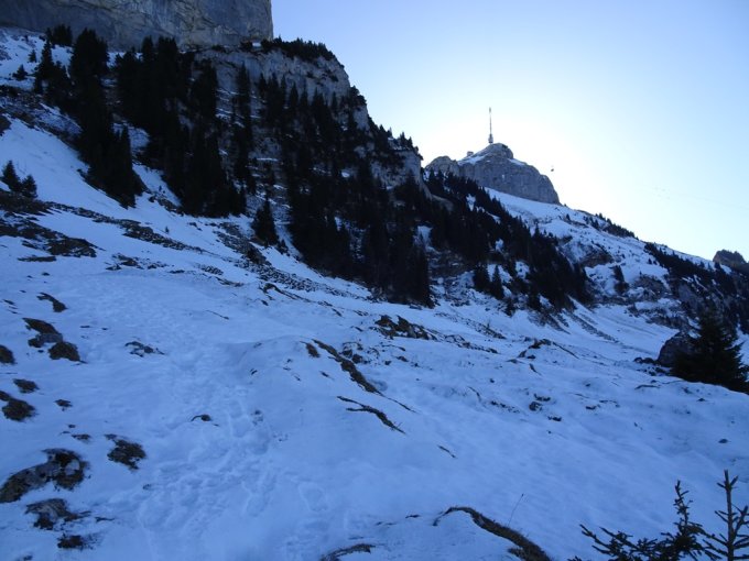 Bis zum Ruhesitz kaum noch Schnee, wenn dann hart gespurt. Oberhalb Ruhesitz gute Spuren bis etwa zur Hälfte der Querung, auf ca. 1460Mt. Offenbar haben hier einige umgedreht; sowie auch heute mehrere Personen. Ab hier nur eine Solo-Steigeisenspur zum Kastensattel, weiter zum Gipfel und zurück. (Jetzt 2 Spuren…)