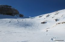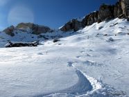 Abfahrt: Insgesamt schöne Verhältnisse. Wechselhafter Schnee - fast tragend, kompakter Pulverschnee, verfahrener Schnee, fast kein Bruchharsch. Einige wenige unverspurte Pulverflächen, wo das Gelände etwas flacher ist.
