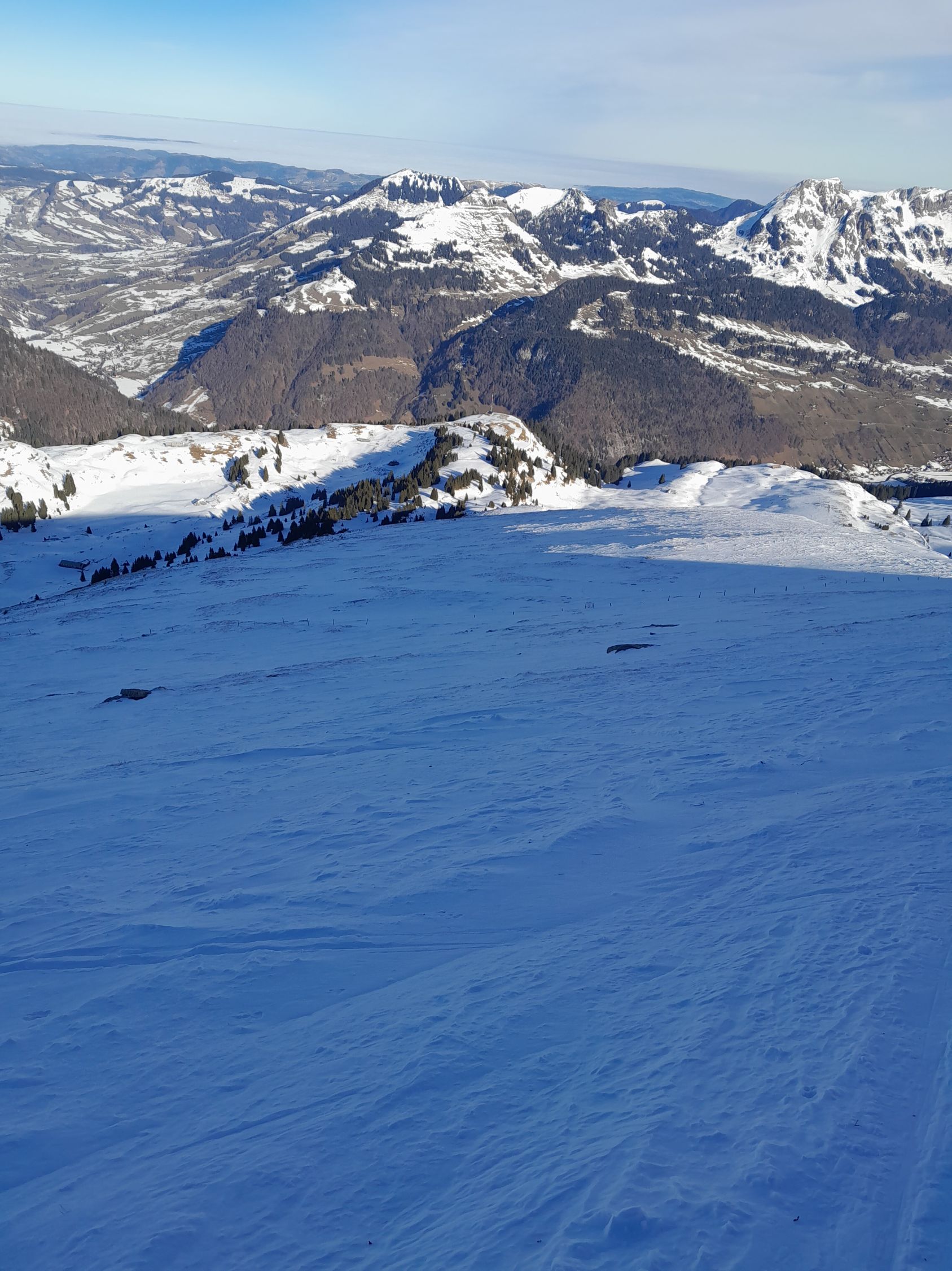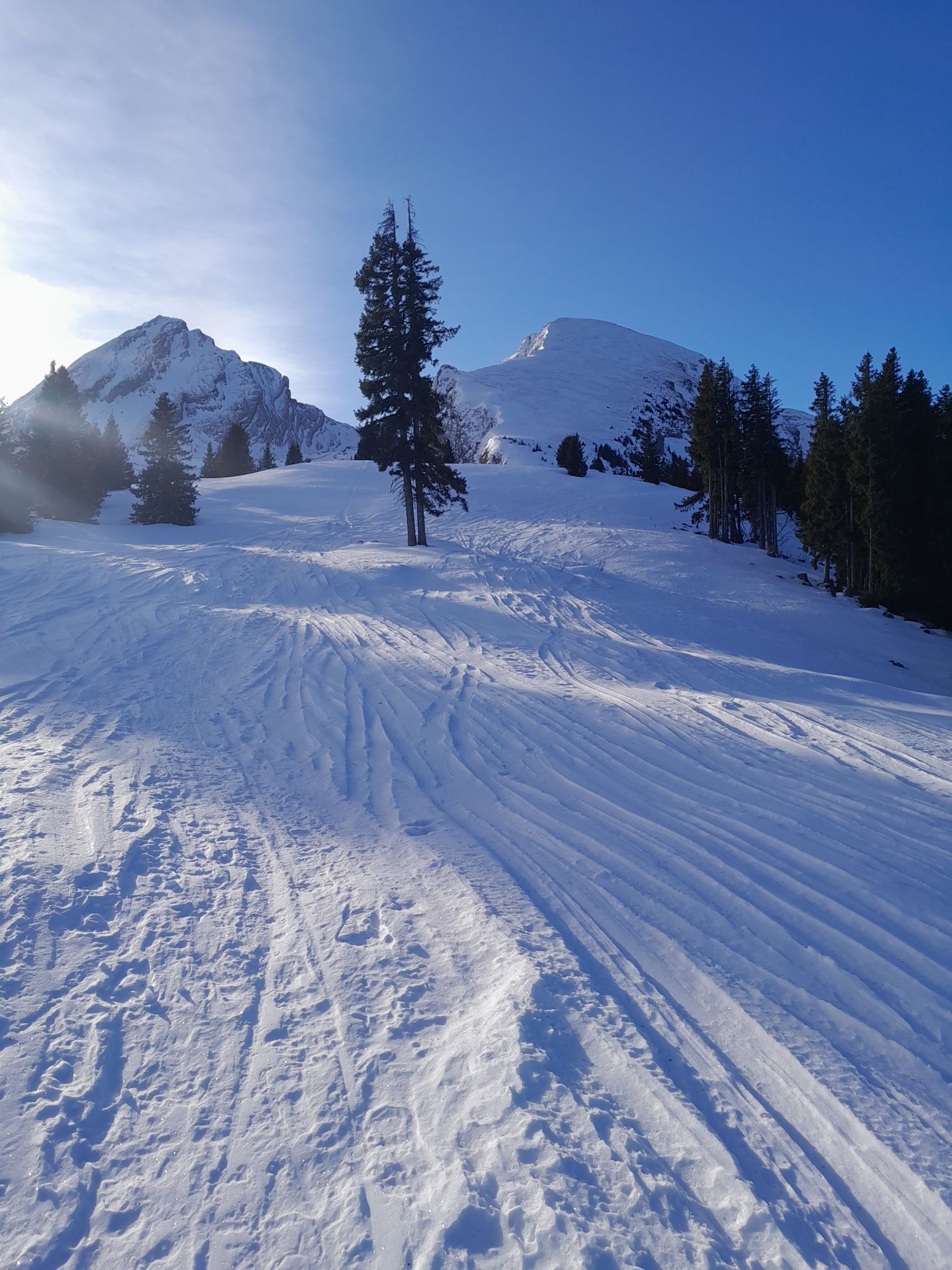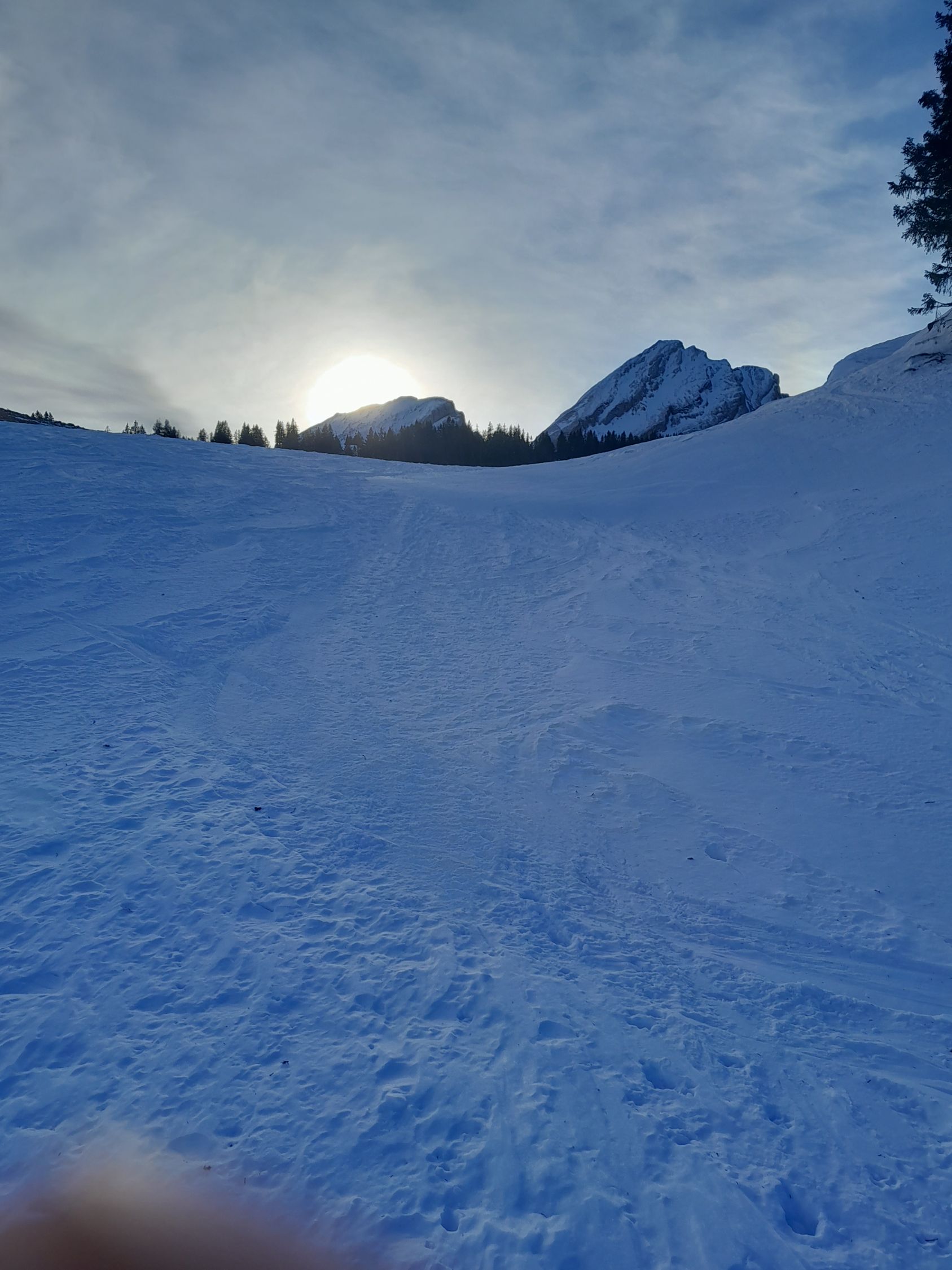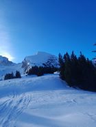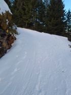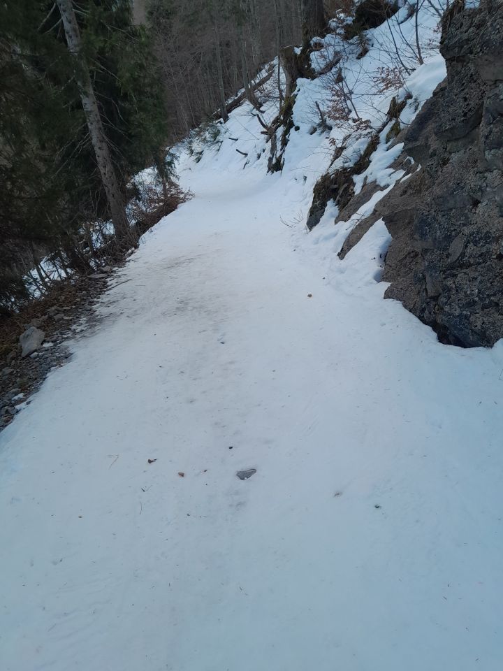 Im untersten Teil verfahrener harrschiger Schnee, der jedoch durch das häufige Befahren gut zu fahren ist. Waldweg im unteren Teil eisig und es schauen vereinzelt Steine hervor, oberer Teil besser. Auf dem Rücken nach wie vor hartgepresster Schnee, aus dem vereinzelt Gras und Steine herausschauen die jedoch gut zu umfahren sind. Alles in allem ein Genuss für jene, die den Fokus eher aufs Aufsteigen legen. Die Abfahrtsliebhaber sind dort zum jetzigen Zeitpunkt sicher nicht am richtigen Ort.