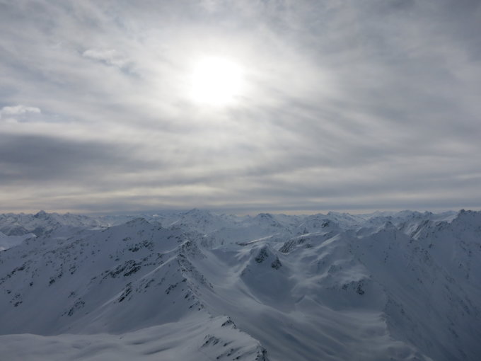 Top Verhältnisse auf der ganzen Route. Gute Spur und dank der weiten Hänge genug Platz für eigene Spuren. Im Mittelteil kurz etwas harschig, kann aber bei der Abfahrt bestens im schönsten Pulver umfahren werden. Traumtag.