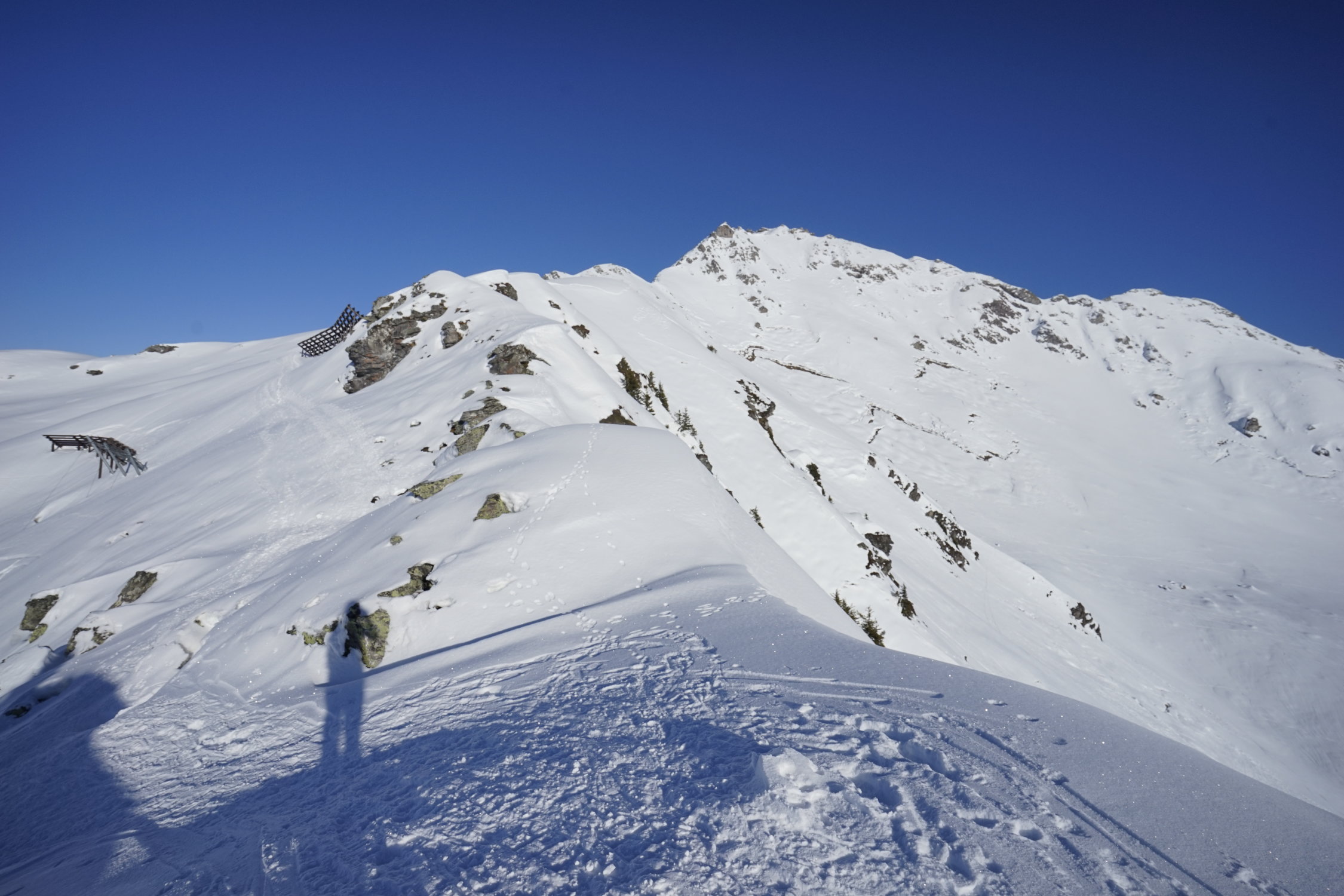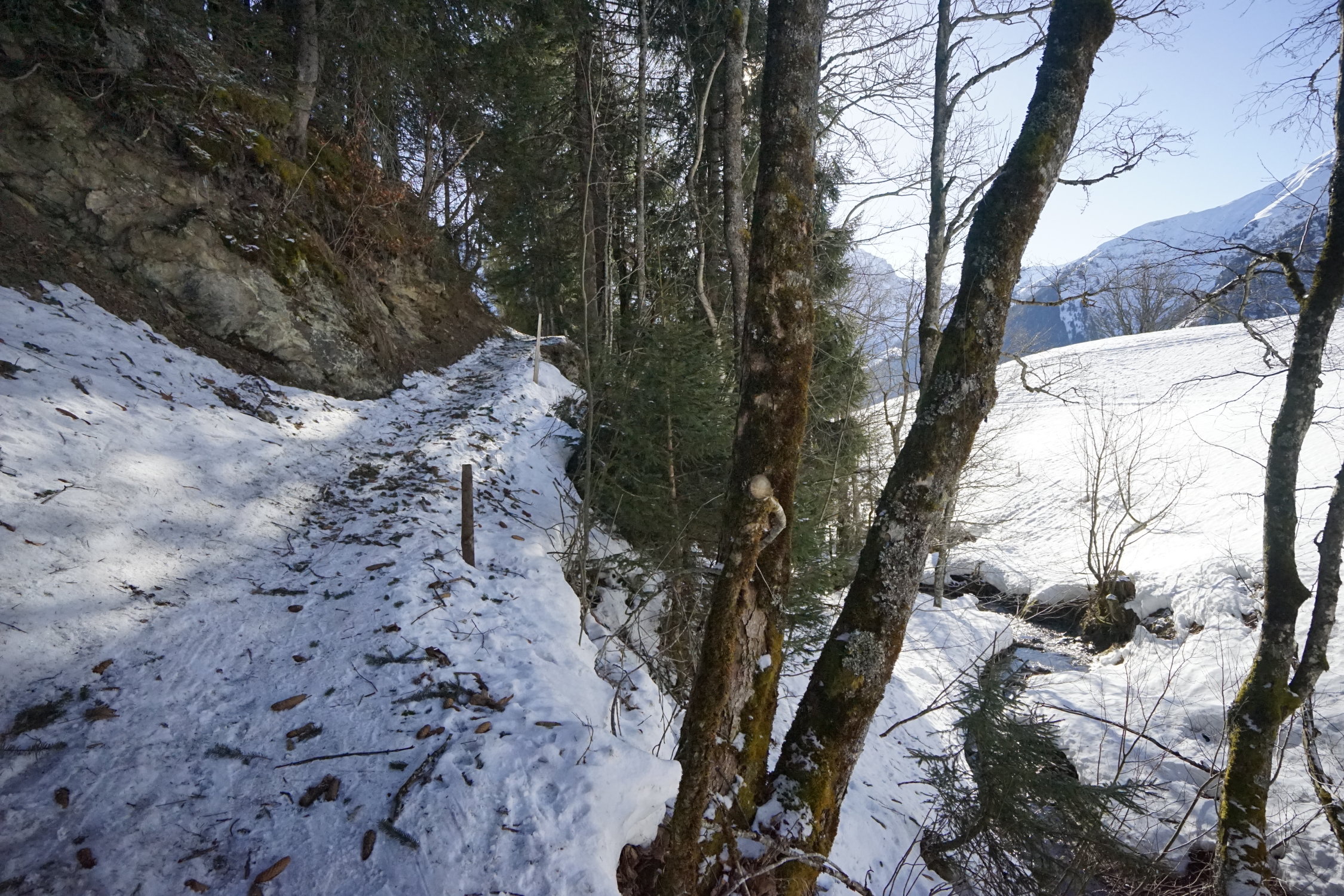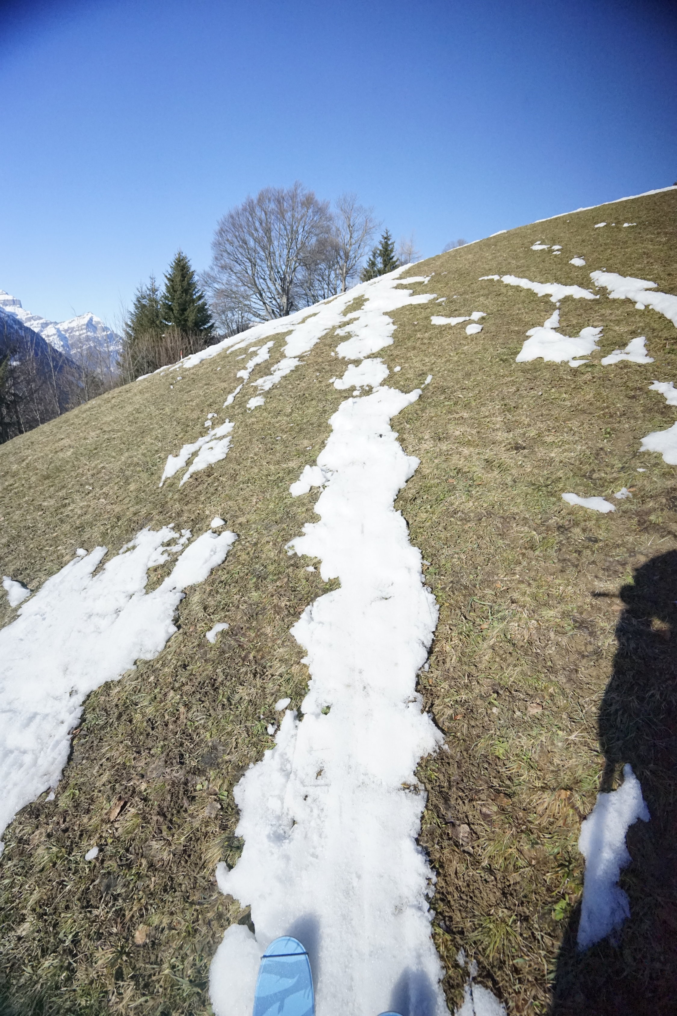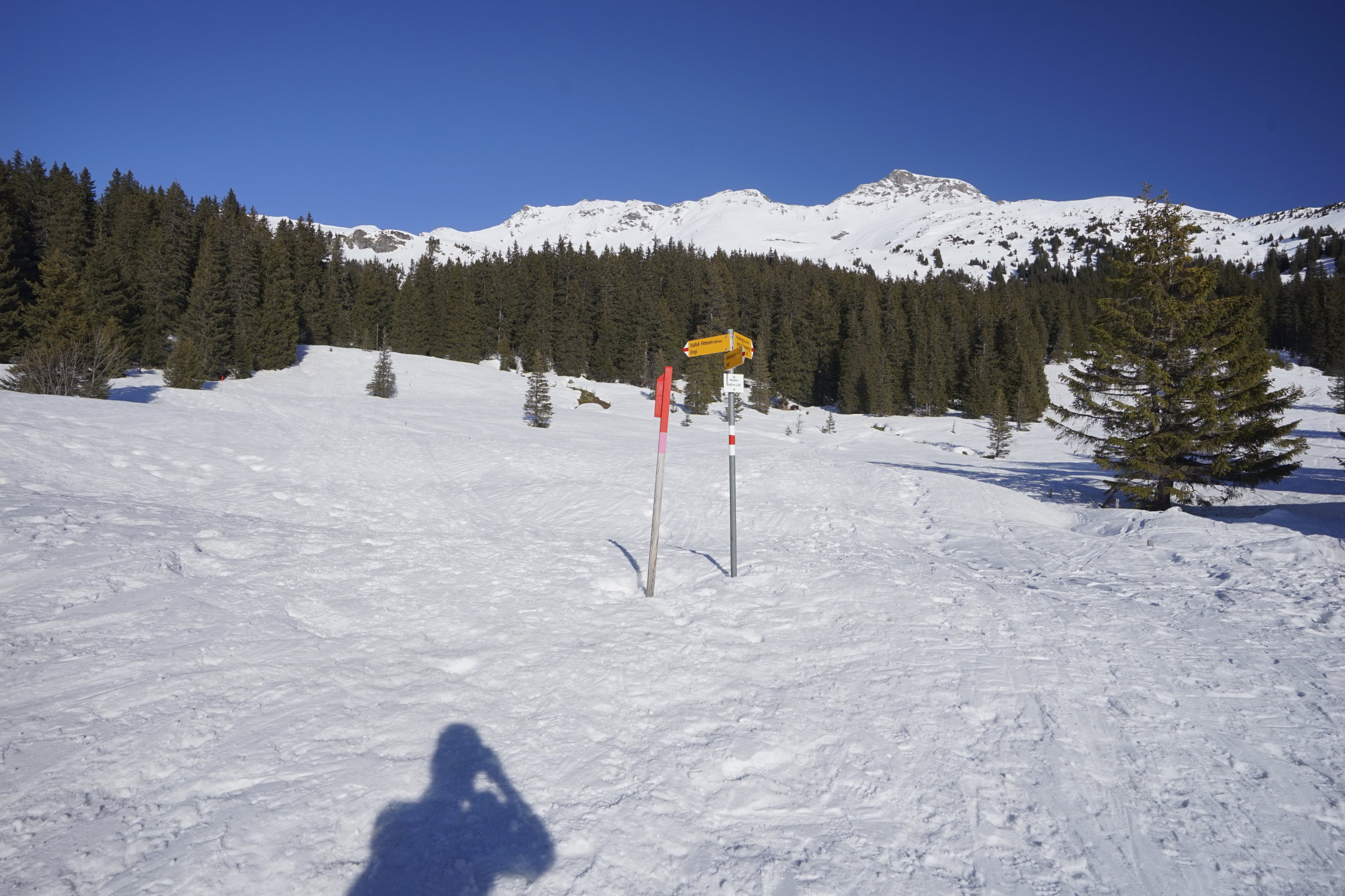 Start ab Weissenberg um 12.45 Uhr. Hartschnee mit leicht aufgeweichter, griffiger, aber rauher Oberfläche. Auf den ersten hundert Höhenmetern ab Weissenberg gibt es einzelne grüne Stellen, darüber sind die Verhältnisse entlang der roten Schneeschuhroute gut, durchgehend Schnee mit einzelnen tiefen Löchern. Teilweise bis 10 cm Pulver/Sulz in den Flanken der Gipfelkrete und an der Waldobergrenze. Harscheisen waren hilfreich. Regenzeichen des Wärmeeinbruchs von letzter Woche an der Gulderstock Südwestflanke (Matt) und Sonnenhörnli-Süd-/Südostseite bis sicher auf 2200 m (Lawinenabgänge bis auf den Grund). Die Abfahrt vom Sattel zwischen Sonnenhörnli und Gulderstock in die Matt Richtung Chamm wurde von einzelnen gemacht (Hartschnee).