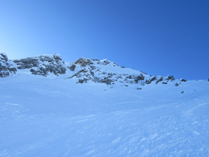 Harschdeckel im unteren Bereich, bei der Querung zum Skidepot gepresster Schnee mit einer geringen Triebschneeauflage.
