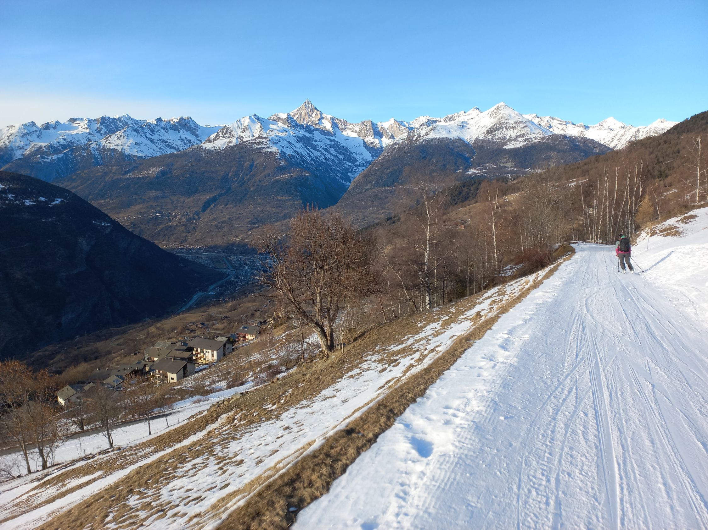 Ab Rothorn gelangt man über die Skipiste bis Giw. Bis Visperterminen liegt kaum mehr Schnee und die Skipiste ist geschlossen. Der Schlittelweg entlang der Strasse hingegen ist geöffnet und führt zur Talstation, ohne die Ski tragen zu müssen.