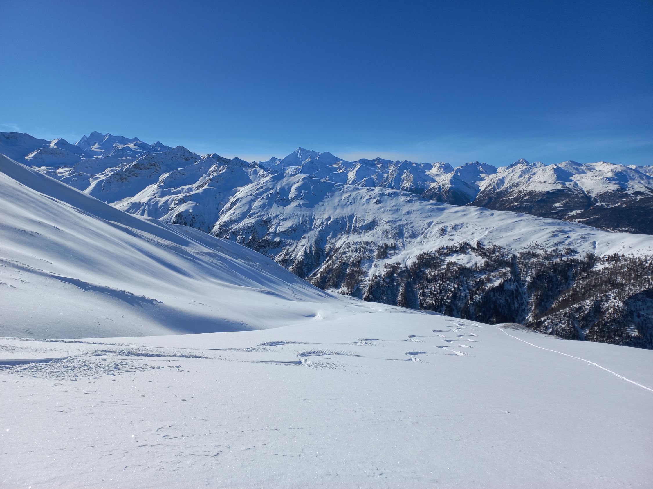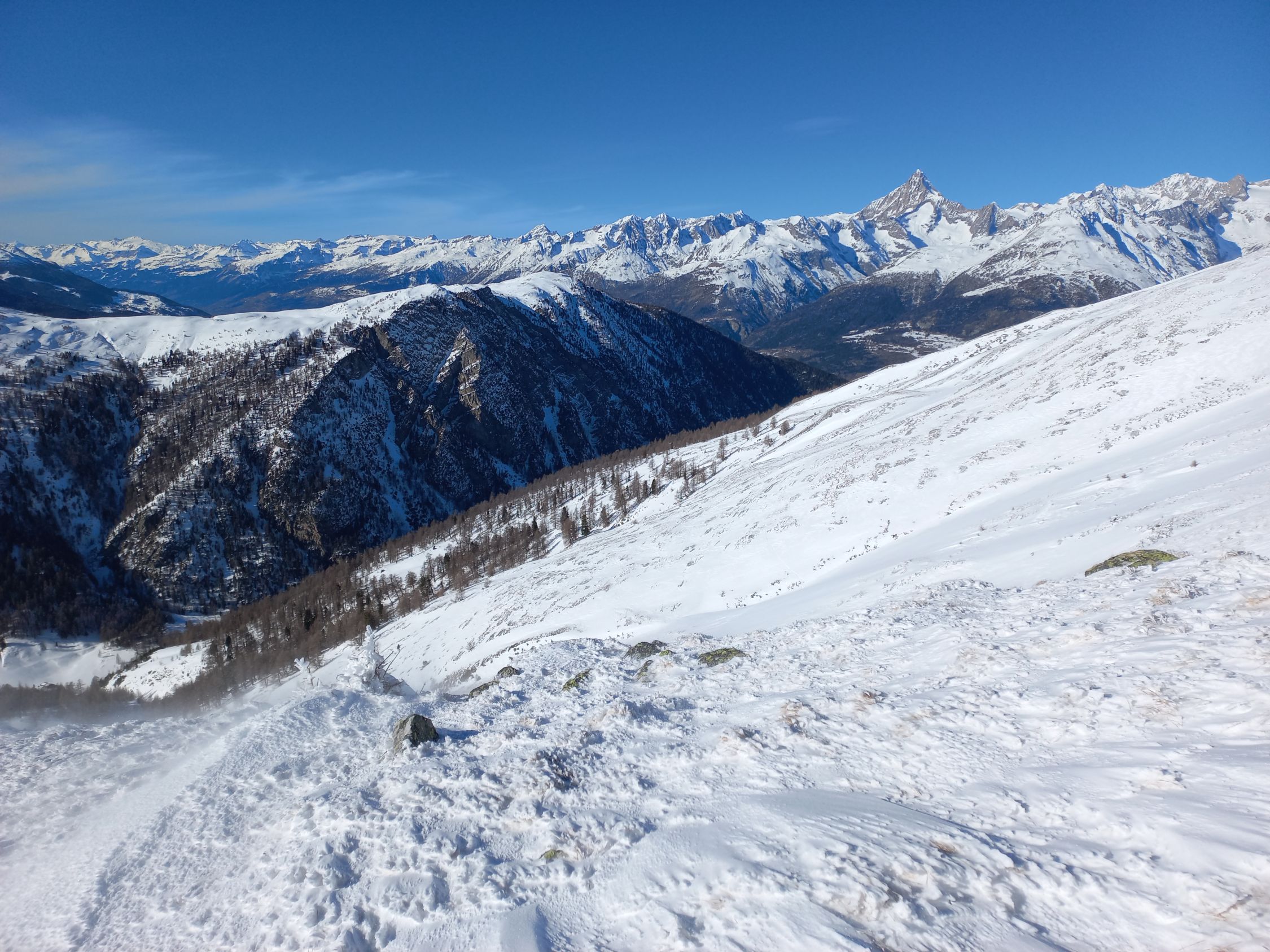 Westlich von Mättwe ist der Schnee bis zur Waldgrenze aufgebaut, in den mittleren Lagen aber wieder schön zu Spuren.