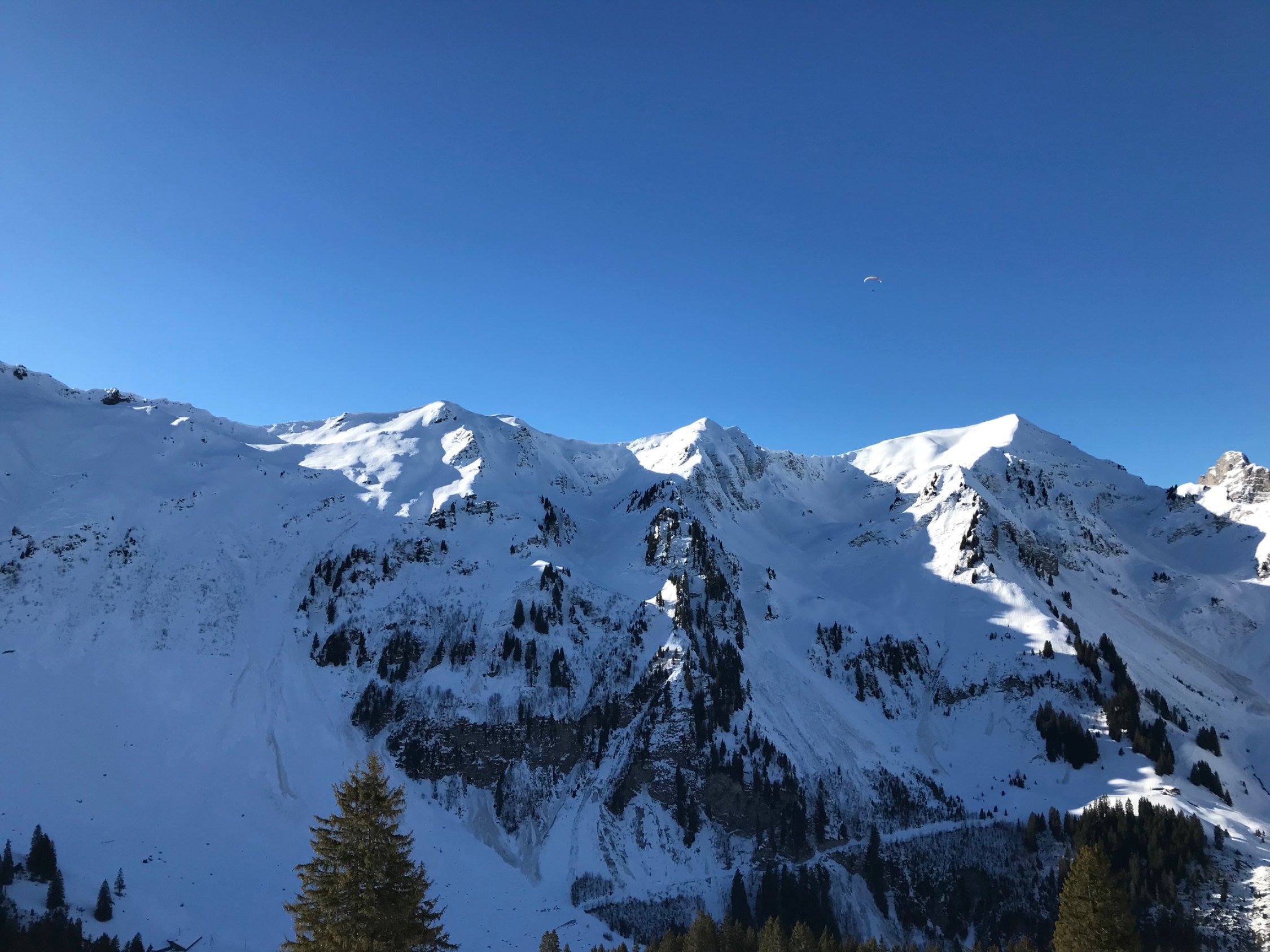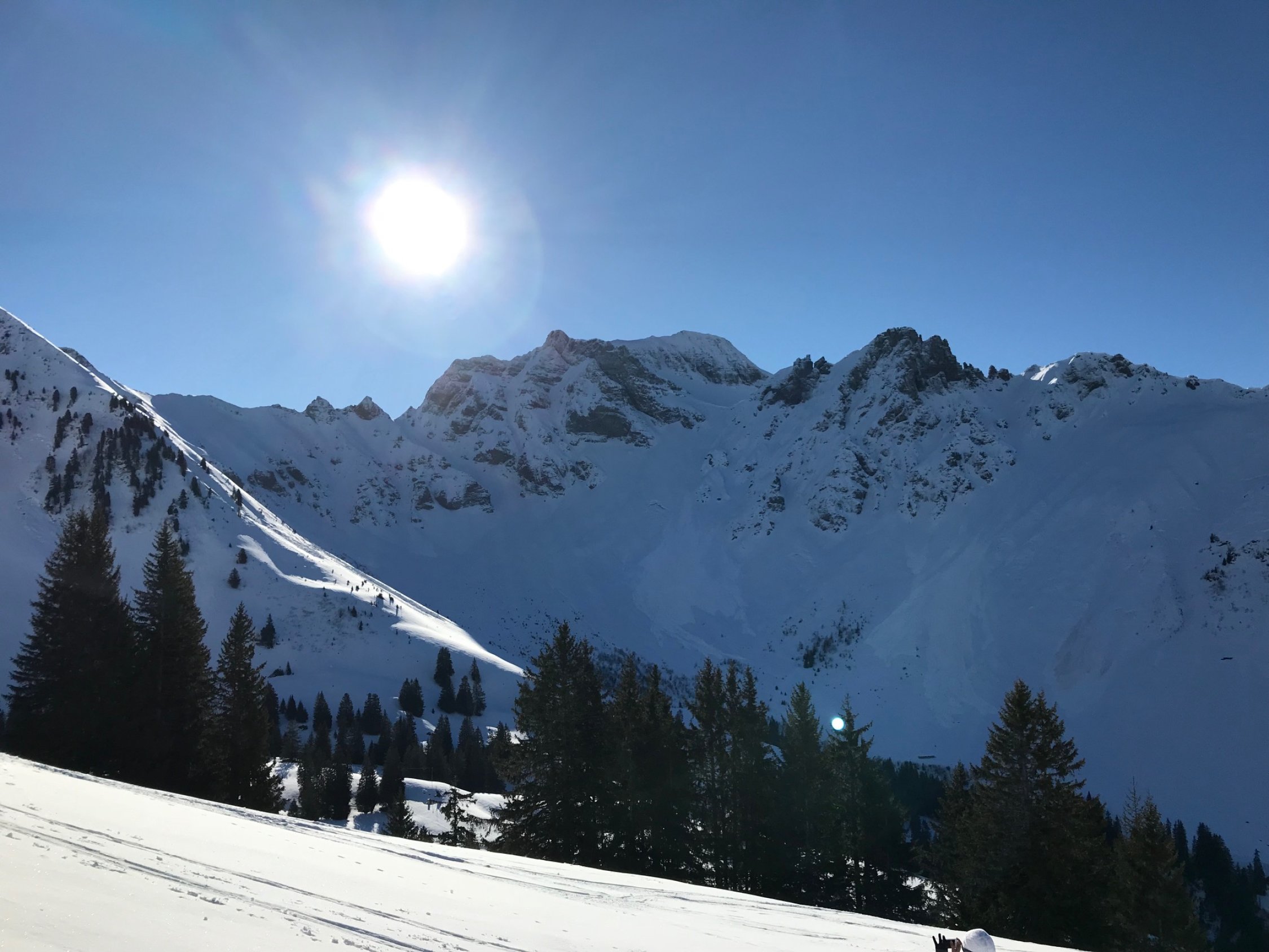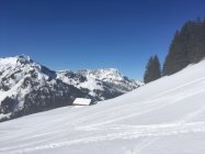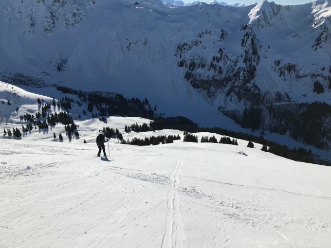 Das Wetter war hervorragend, unten im Tal -5 Grad um 09:30, im Schatten bis nach dem Waldaufstieg nach dem Steibode. Ab 1700m an der Sonne, kühl aber super zum Aufsteigen. Ab Mittelberg teilweise ziemlich eisig, wir hatten die Harscheisen hier montiert, das ging sehr gut. Überall genügend Schnee, man kann bis zum Parkplatz abfahren. Das Waldstück und die Bachüberquerung bei Steibode ist ein bisschen mühsamer aber gut machbar. Wer es gemütlich will, kann bis zum Pt 1664 (Sommerstrasse) aufsteigen und dort den Bach queren. Für die Abfahrt ist die Sommerstrasse sehr gut. Der Gipfel ist zu Fuss gut machbar, aber Vorsicht ist hier sicher angebracht.