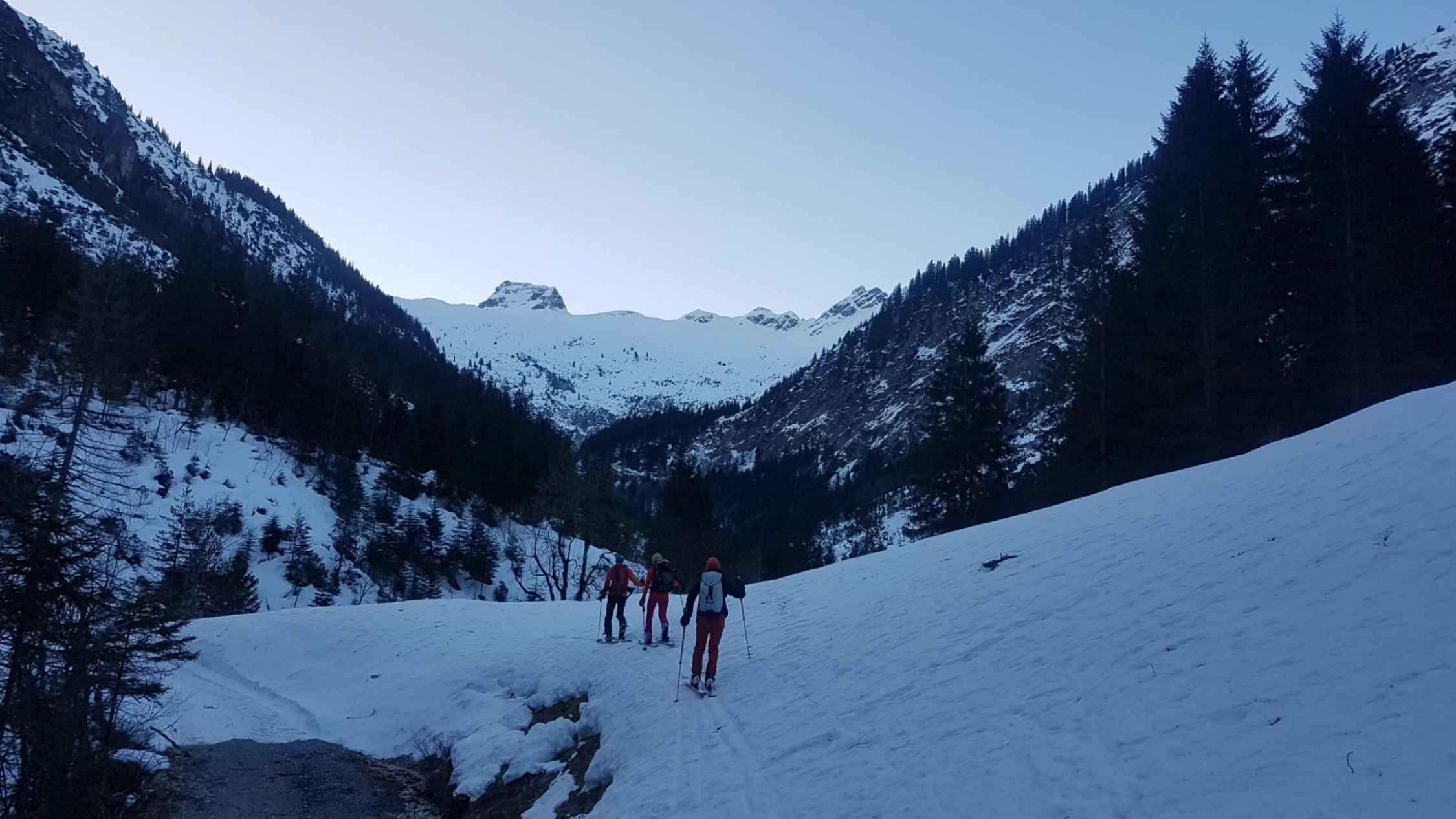 Auf dem Ziehweg bis zur Gadenalpe einige male kurz abschnallen, sonst durchgängige Schneedecke. Tour bis auf die letzten 150hm am Gipfel komplett hart (Deckel nirgends eingebrochen, sonst wärs übel gewesen). Am Gipfelhang kurz Ski getragen, kann aber auch mit Harscheisen+guter Aufstiegstechnik gemacht werden. Abfahrt durch steile Rinne von oben möglich.