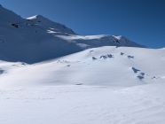 Umkehr oberhalb von P. 2524 da viel Triebschnee in der schattigen und steilen Mulde hoch zu P. 2704. Schneeprofil und Rutschkeil trugen zur Entscheidung bei.