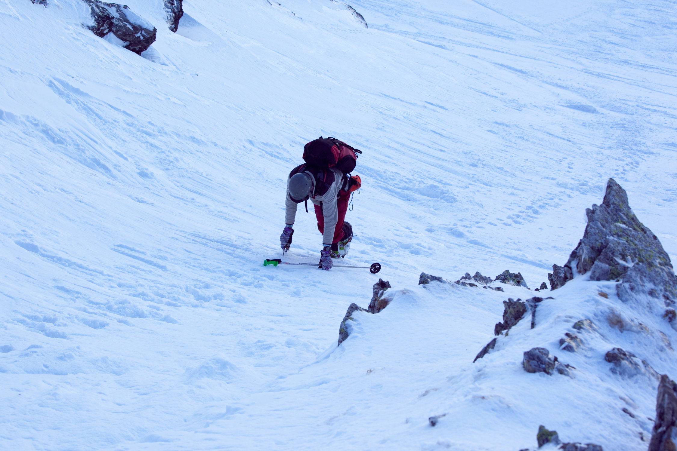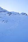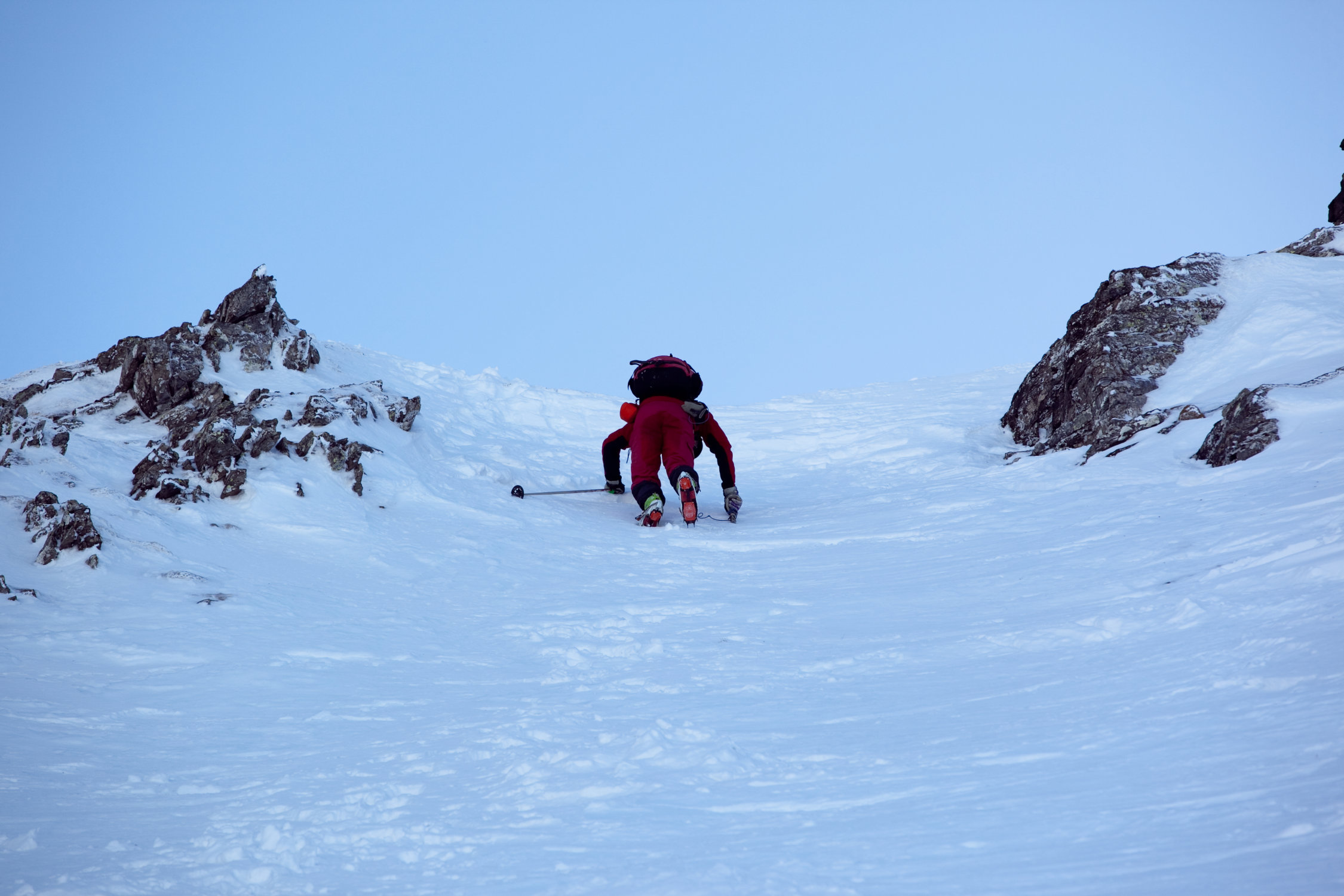 Heute reltiv wenig begangen, da bickelharter Schnee auf der gesamten Route, was den Aufstiegs- und Abfahrtsgenuss doch etwas trübte. Letzte 150 Hm mit Steigeisen auf- und abgestiegen, uns war das im Ggs. zu den anderen Gruppen mit Ski zu heftig.