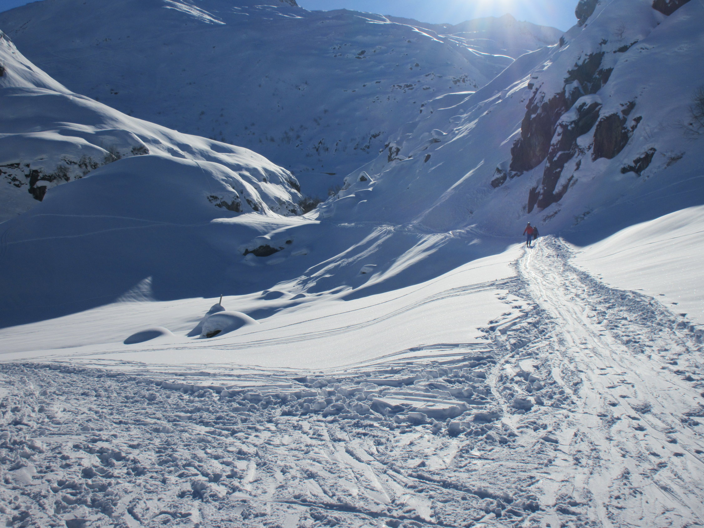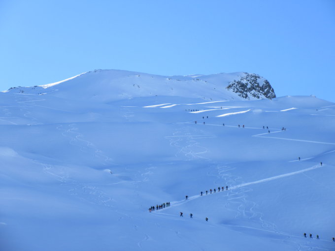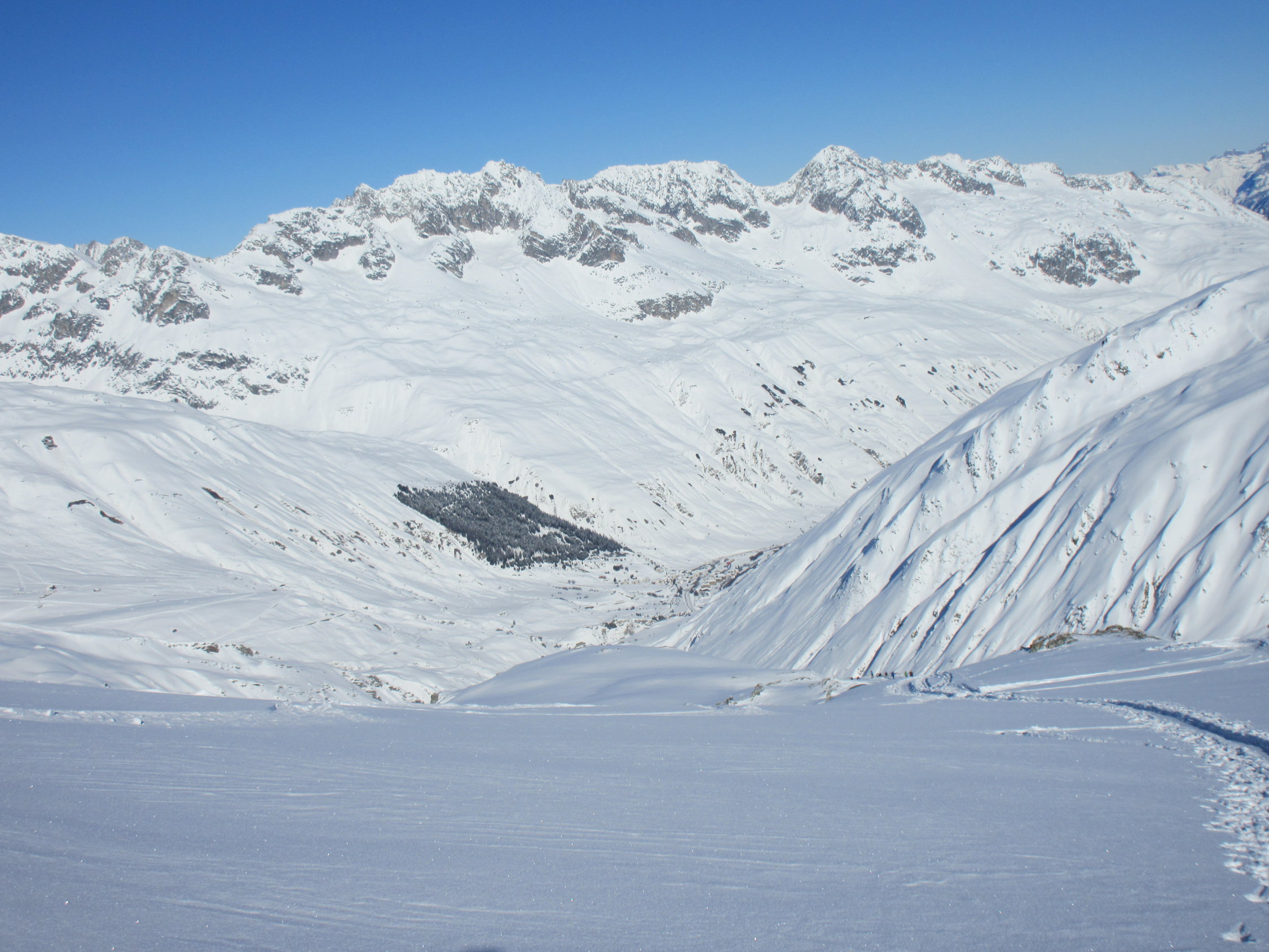 Parkplätze in Realp um 8 Uhr 30 voll, aber tolle Parkplatzorganistion, da der Verkehr wegen der parkenden Autos auf der Strße nach Realp im Einbahnverkehr geregelt wurde, traumhafte Verhältnisse am Berg mit viel Platz für eigene Spuren
