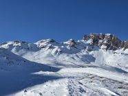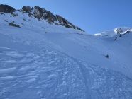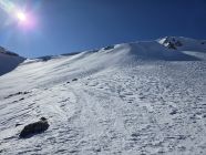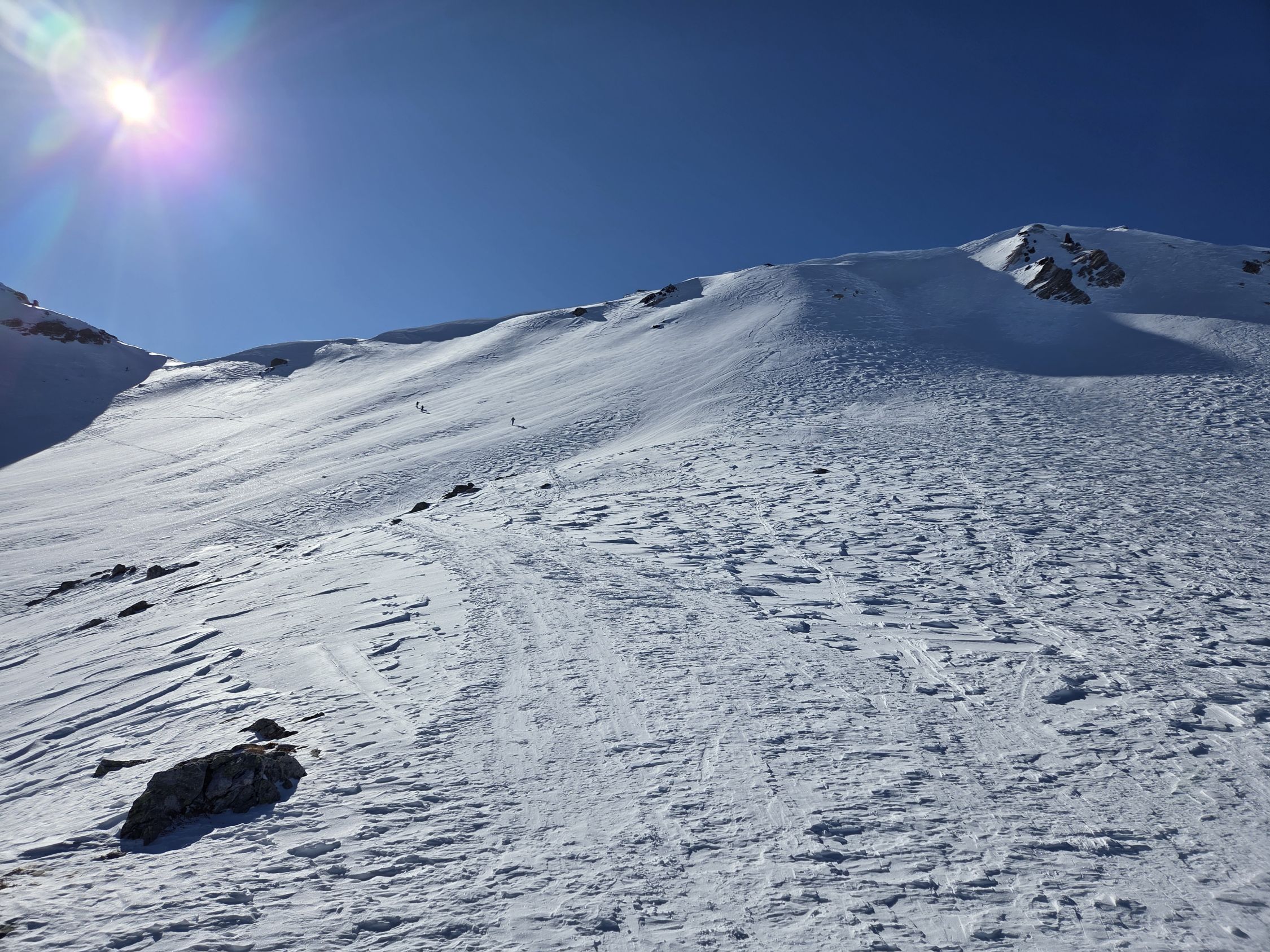 Abfahrt zuerst etwas zurückgefahren, dann in den Steilhang reingefahren (Achtung Wächten). Dort hart und teils ruppig.