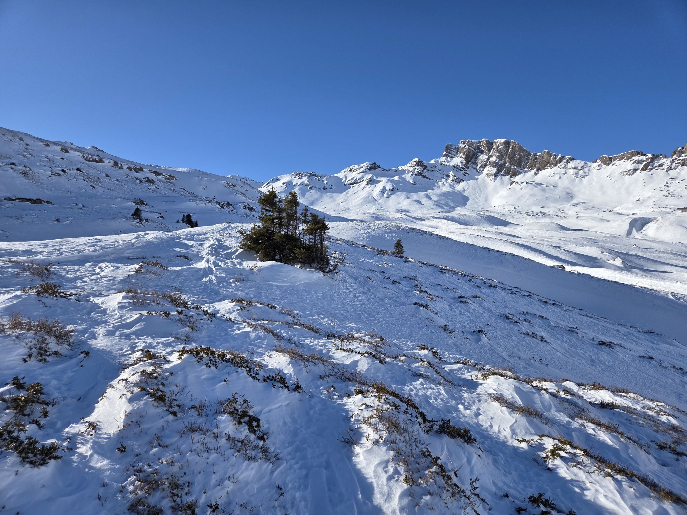 Der Bergrücken ist eingeschneit, es kommen aber da und dort Steine und Felsen hervor.