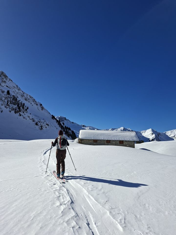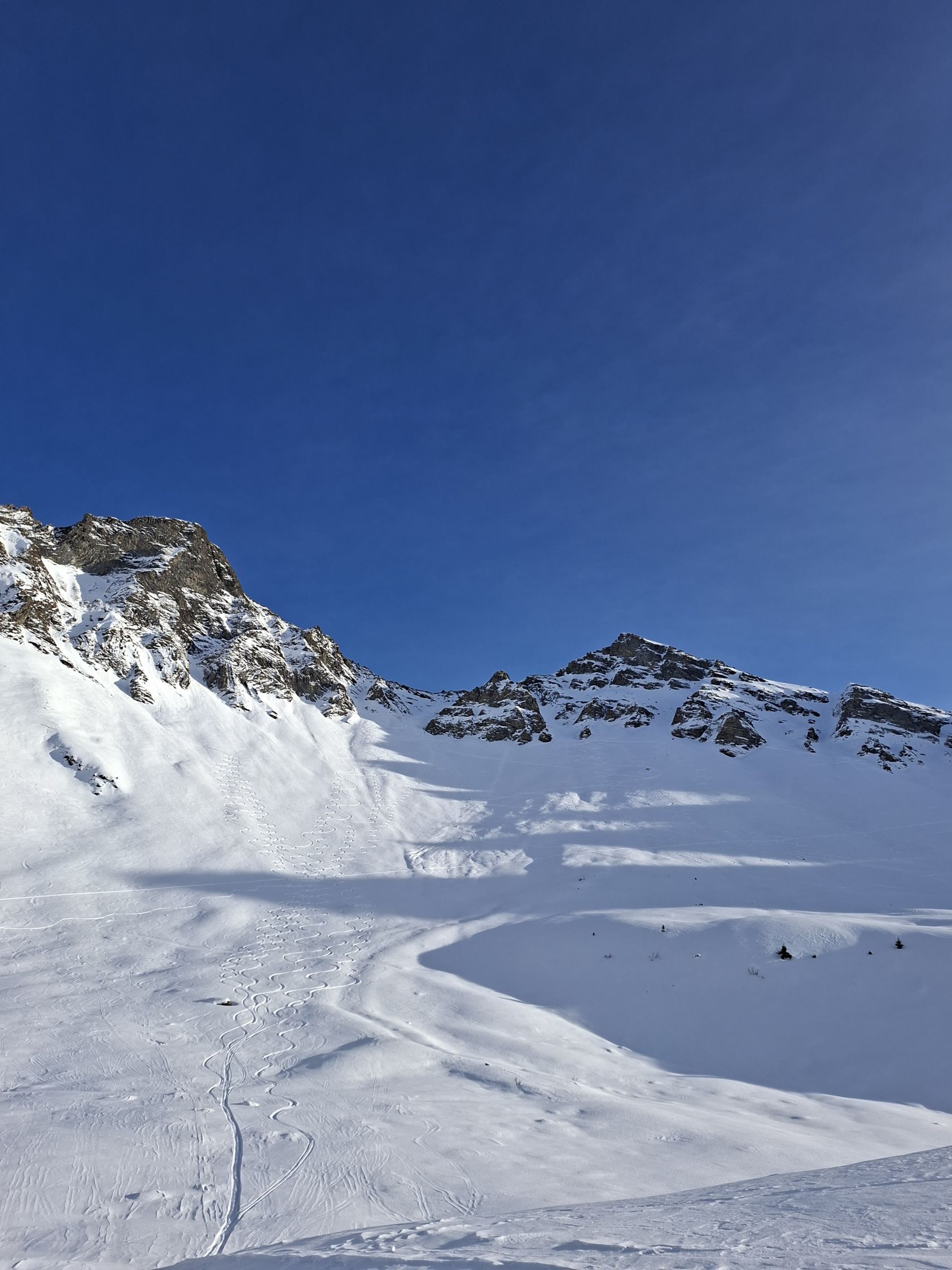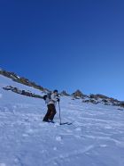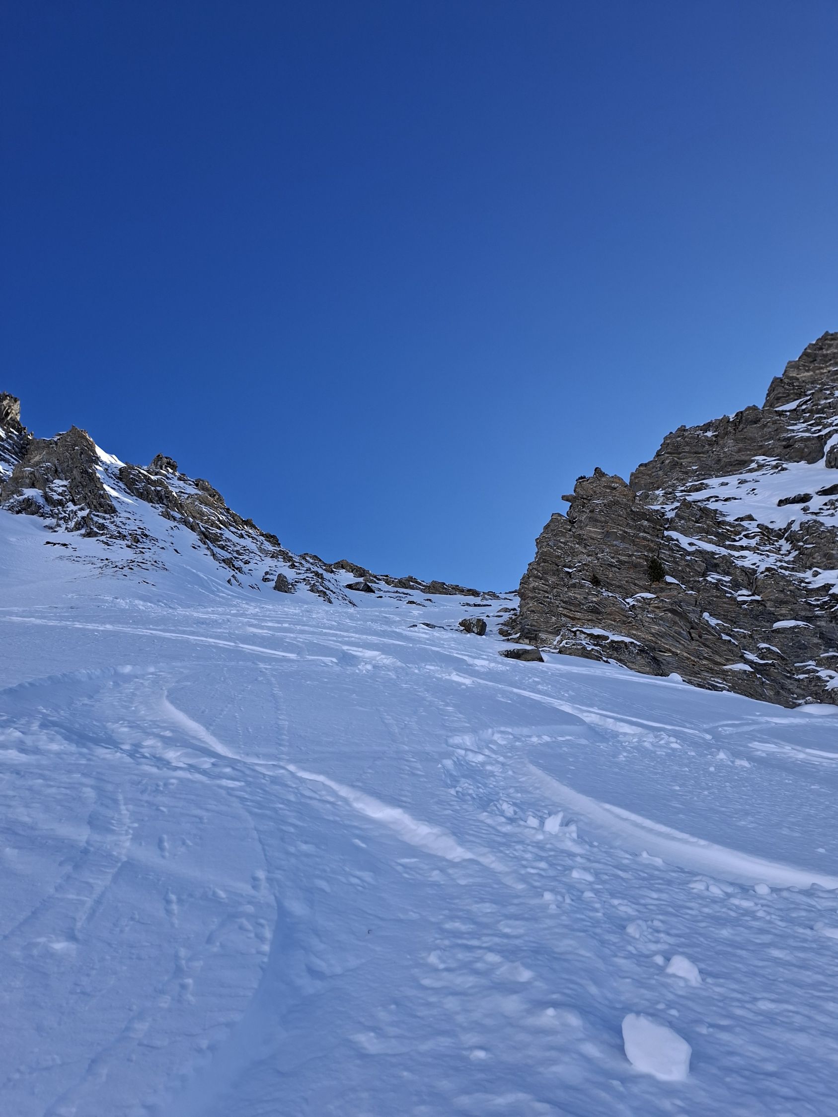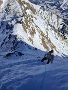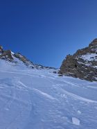 Abfahrt: In den obersten 20 Hm sind die Felsen nur schwach mit Schnee überdeckt, dann aber viel Pulverschnee. Der obere Teil Steibode Pulver, der untere Teil gesetzter Pulver.