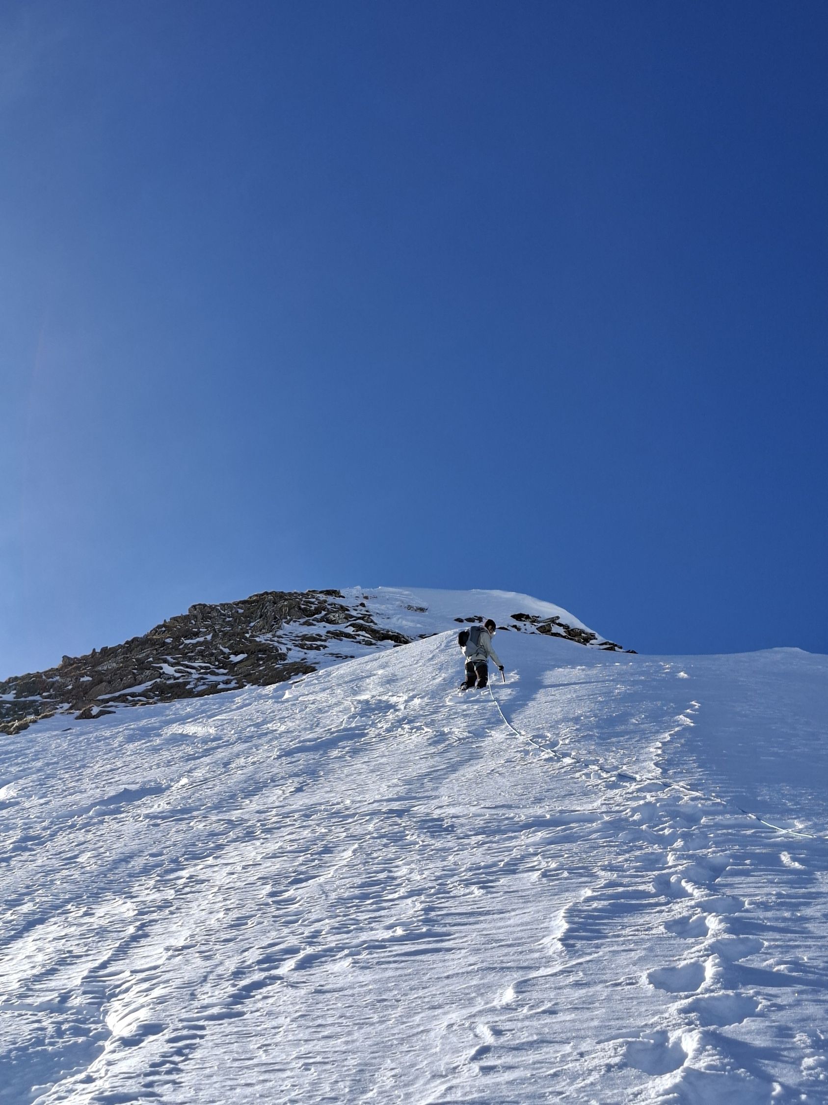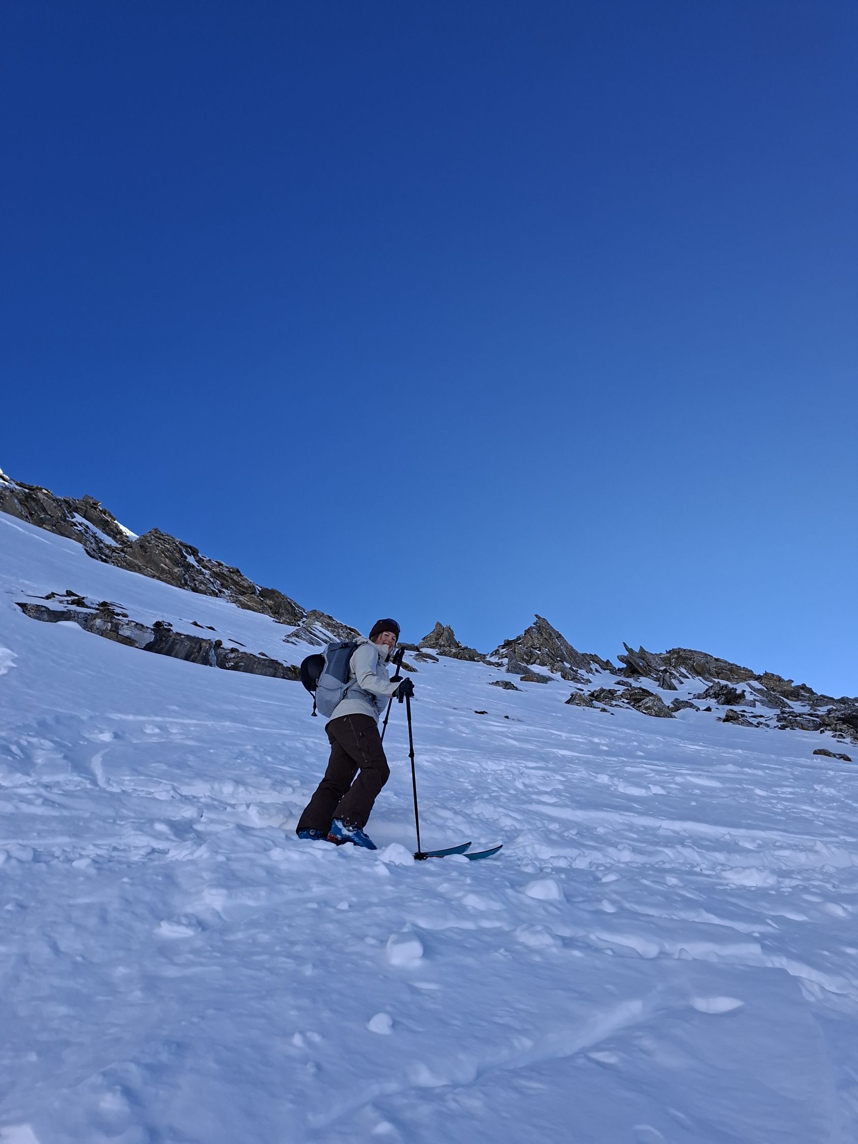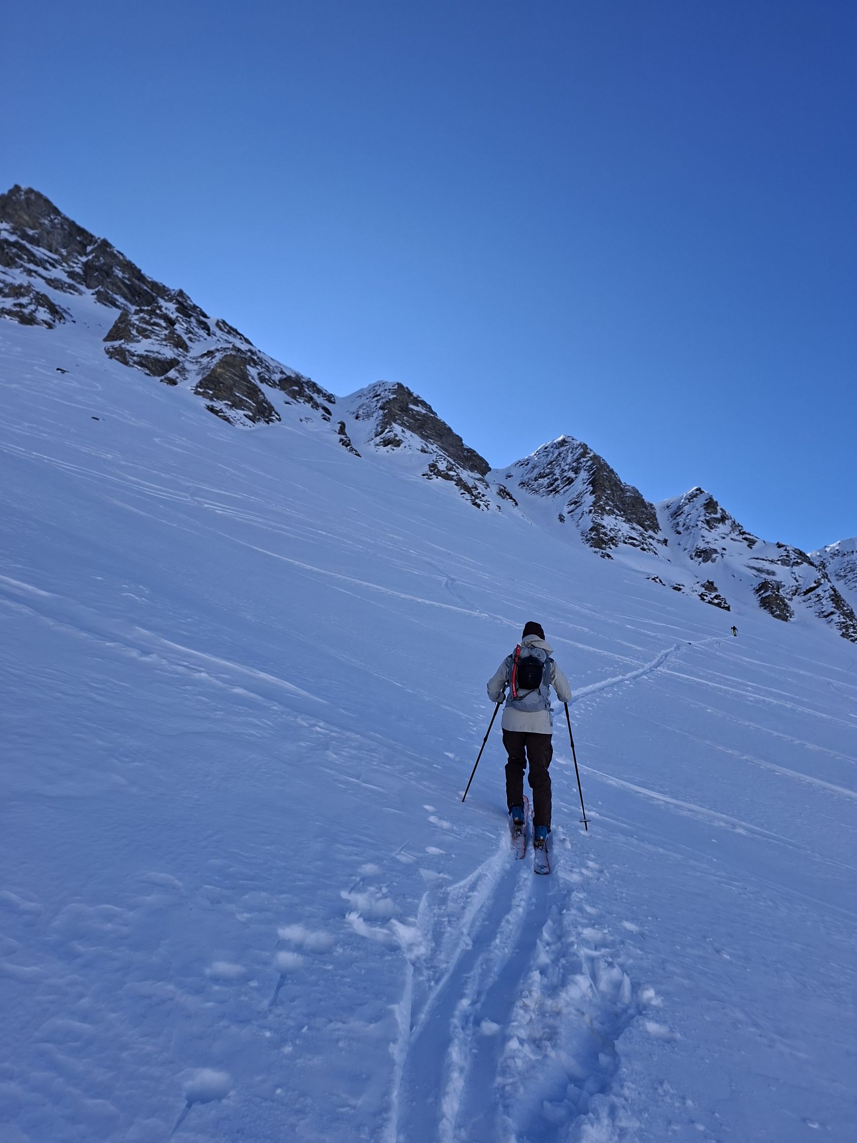 Abfahrt: In den obersten 20 Hm sind die Felsen nur schwach mit Schnee überdeckt, dann aber viel Pulverschnee. Der obere Teil Steibode Pulver, der untere Teil gesetzter Pulver.