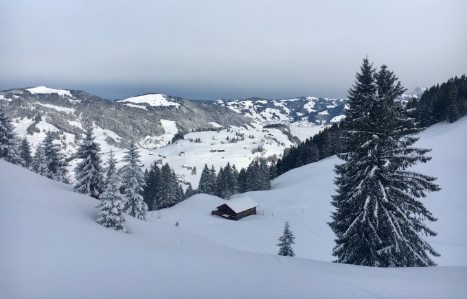 Die Abfahrt wie erwartet ein Traum - trotz spätem Start um 10.15 Uhr und Gipfelankunft um 11.25 sehr viel Platz für eigene Spuren. Abfahrt heute via Jäntli in der Falllinie - perfekt und nur 2 Spuren.