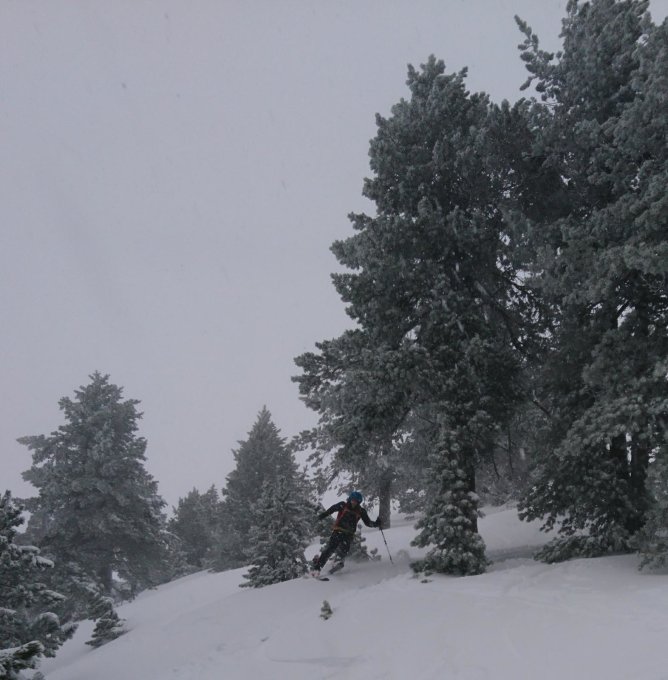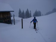 Abfahrt: oben ein Hang Pulver, dann Pulver auf durchbrechender Kruste und oder Pulver auf Nassschnee (der Regen ging wohl ziemlich hoch heute morgen). Unten sind wir auf der Piste abgefahren. Der Genuss der Tour hielt sich in Grenzen.