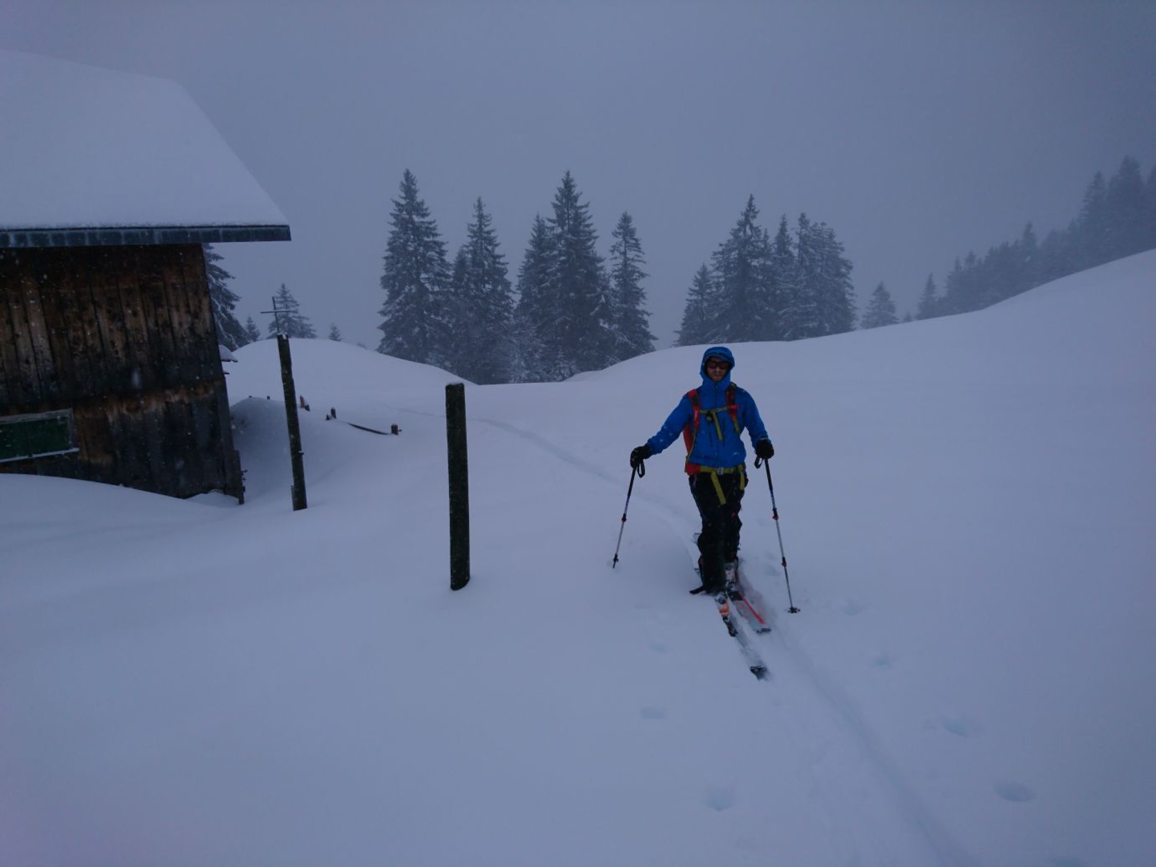 Beim Start vor 9 Uhr nasser Schneefall. Den Rest der Tour dann durchgehend Schneefall und unterschiedliche Sicht.
