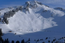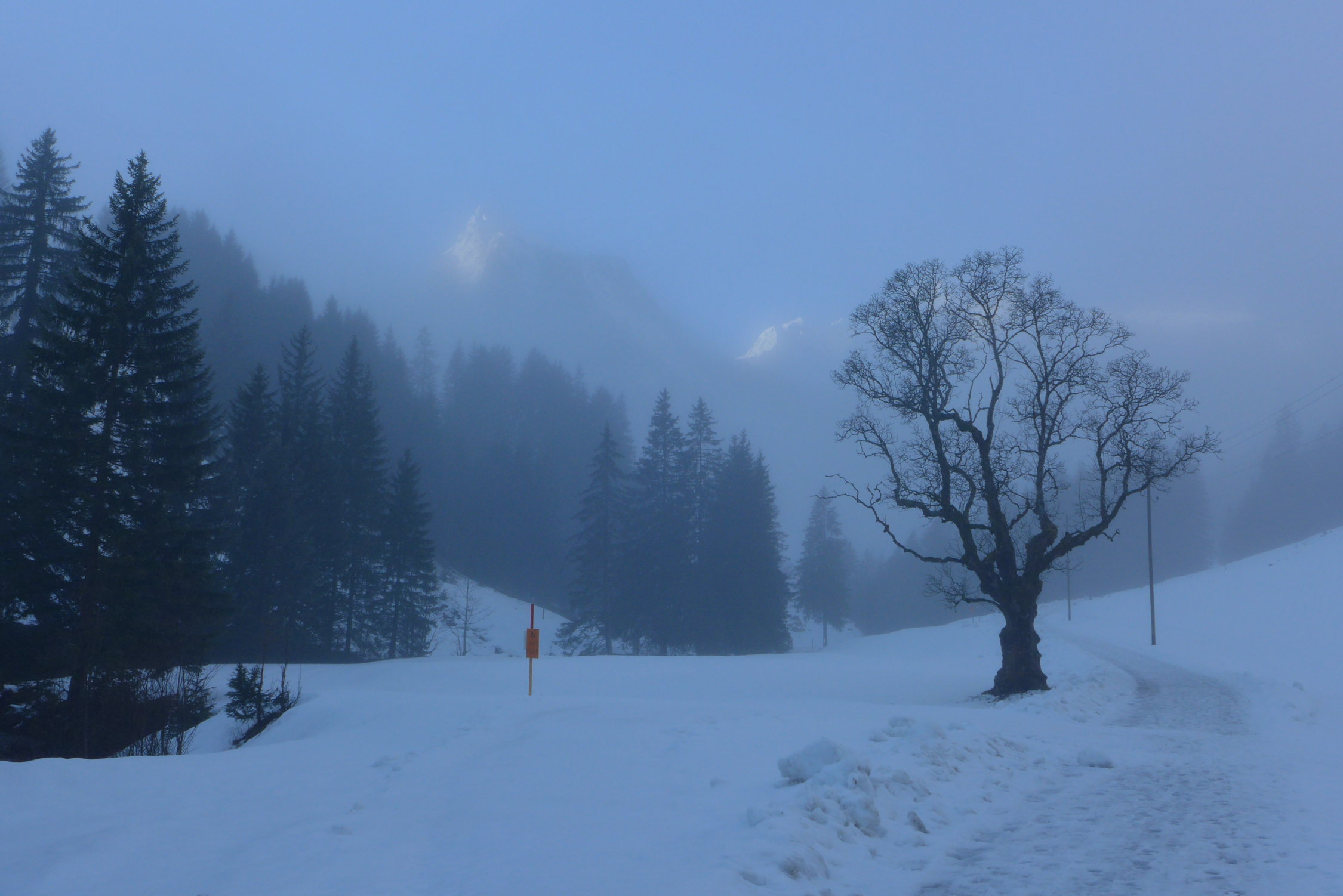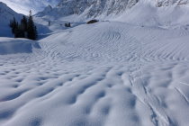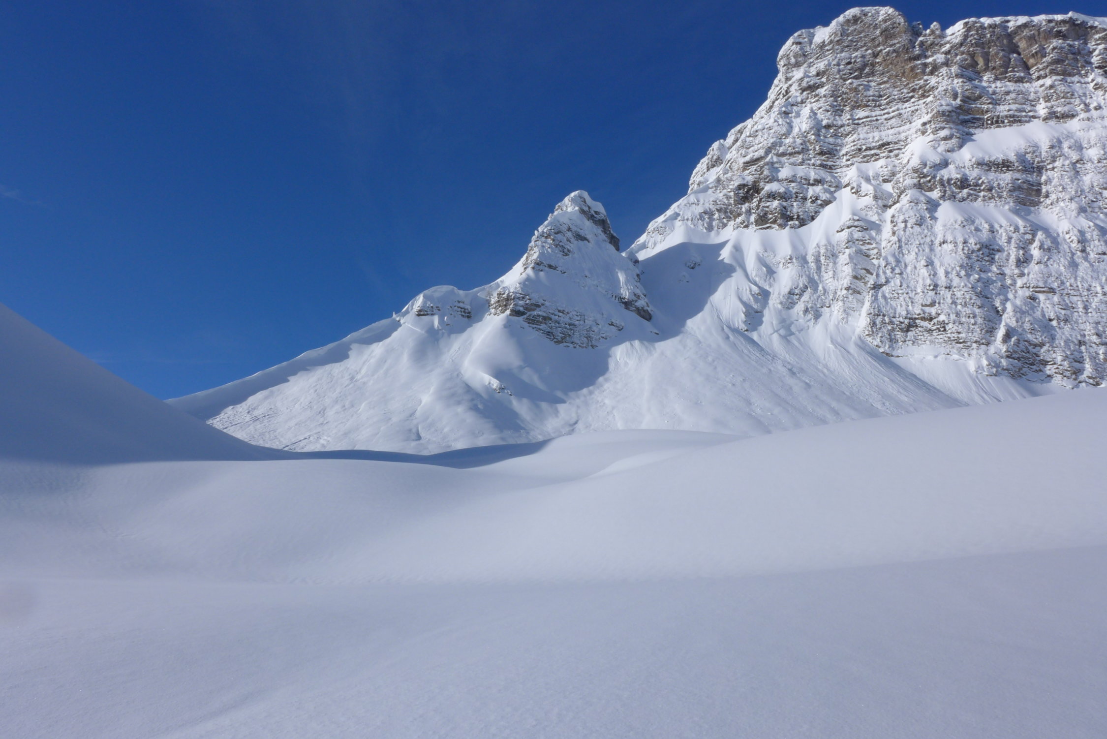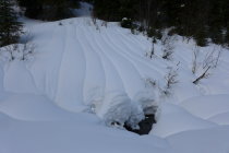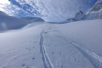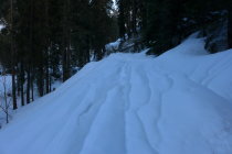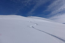 Etliche spontan wohl schon am Vortag abgegangene Lawinen am Wegrand, z.B. ein beeindruckendes Schneebrett am kleinen Hang gegenüber des Baches unterhalb Alp Grimmi. Viel Schnee kam auch am Nordhang bereits runter. Dank achtsamer Routenwahl aber doch machbar.