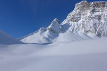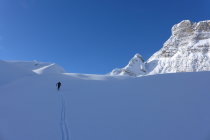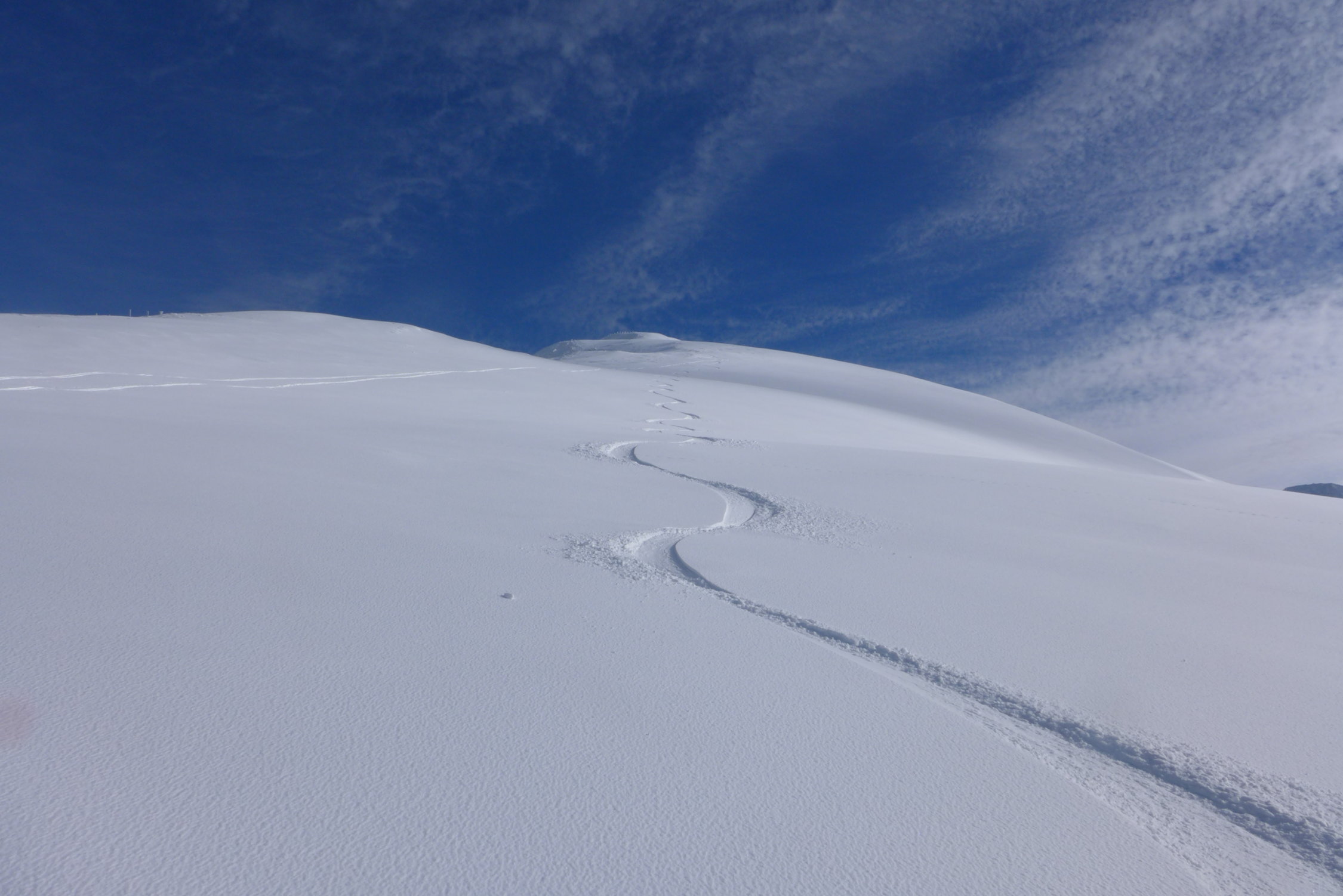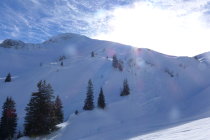 Gipfelhang mit nur wenig, aber genügend Schnee, etwa 20 cm schönster Pulver auf dem recht abgeblasenen Hang. Bis auf ca. 1800 m sehr schön zu fahren, dann auf der harten (Regen-)Eisschicht gerade ganz knapp einbrechend und damit äusserst schwierig zu fahren. Da war heil Herunterkommen angesagt und ein leises Beneiden meines Kollegen, der auf dem Gipfel mit seinem Gleischirm gestartet war.