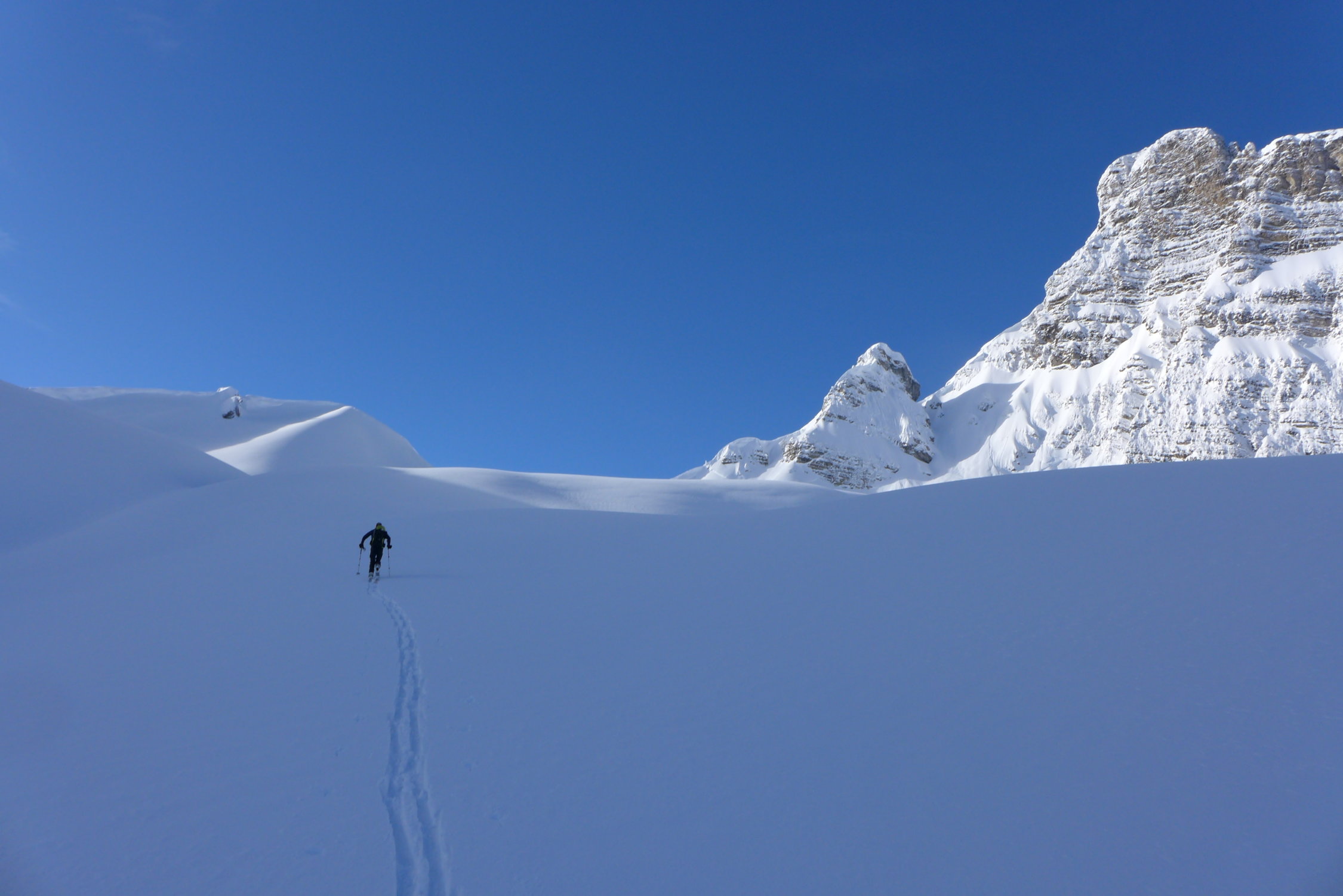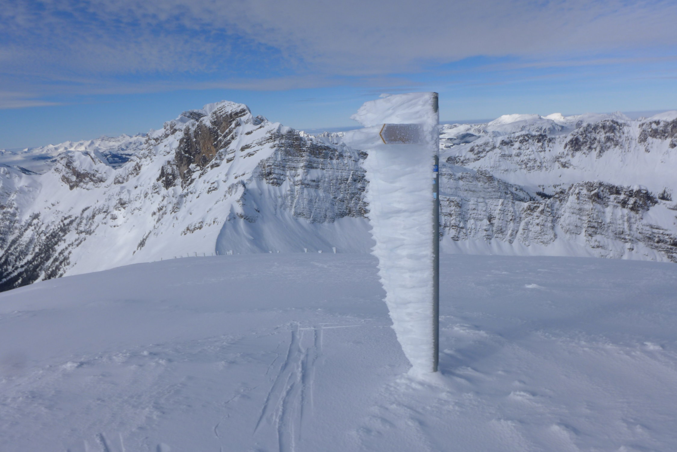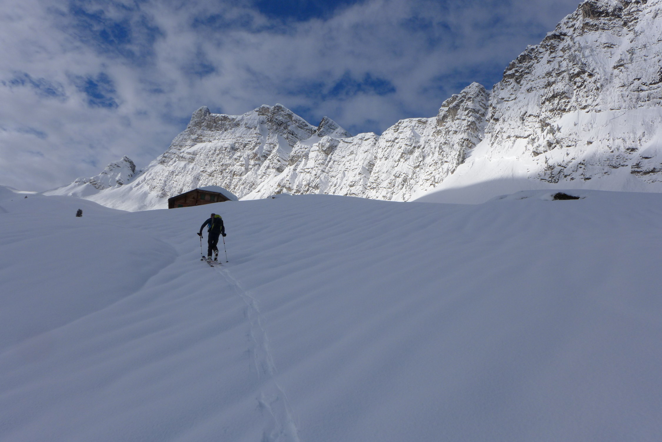 Start um 9 beim Parkplatz. Genügend Schnee ab Parkplatz. Unten bis zum Ende des Alpweges bei 1800m Harsch, meist eine ca. 2 cm für den Aufstieg tragende Eisschicht auf dem mit vielen Regenrinnen zerfurchten Schnee.