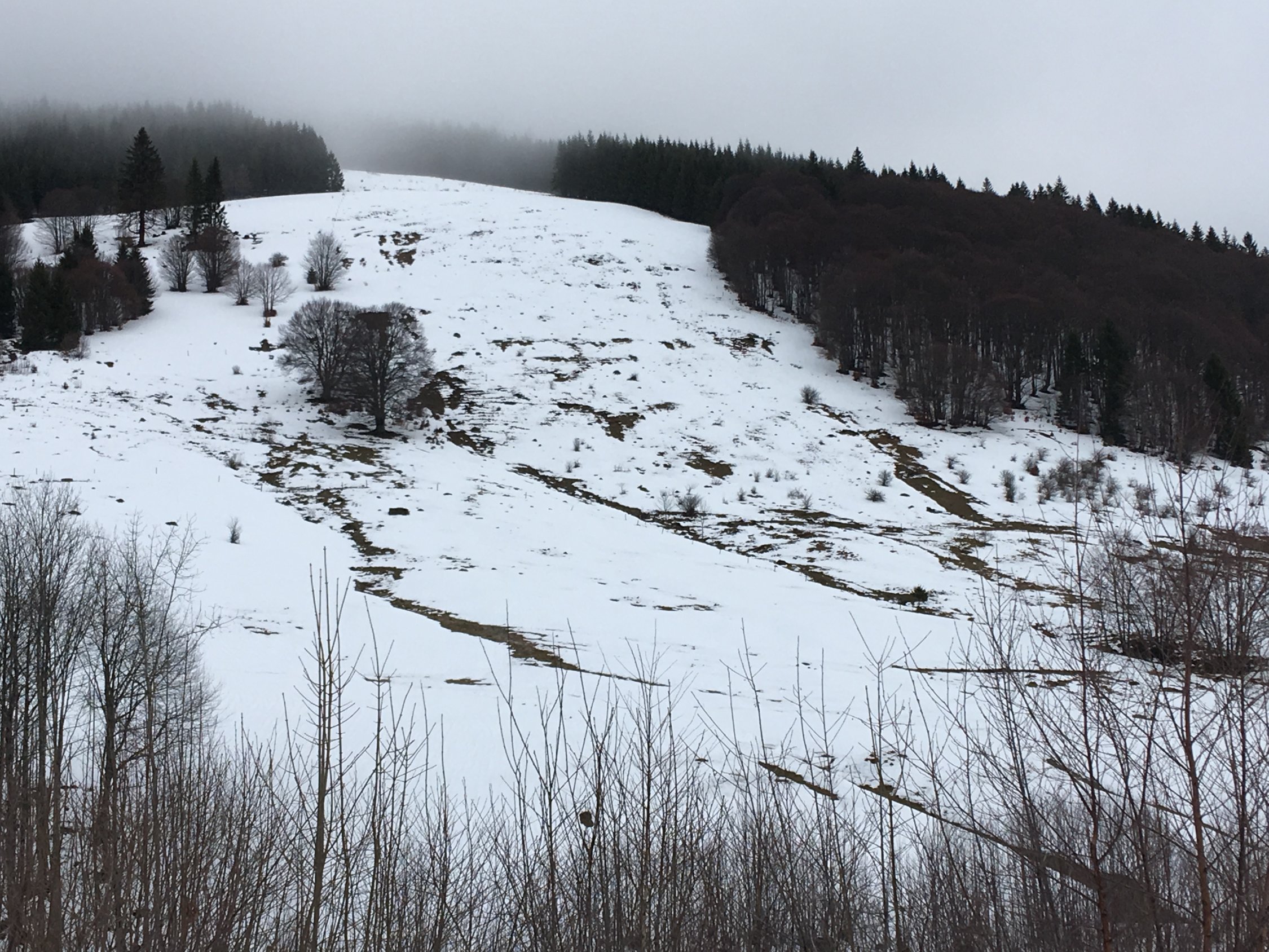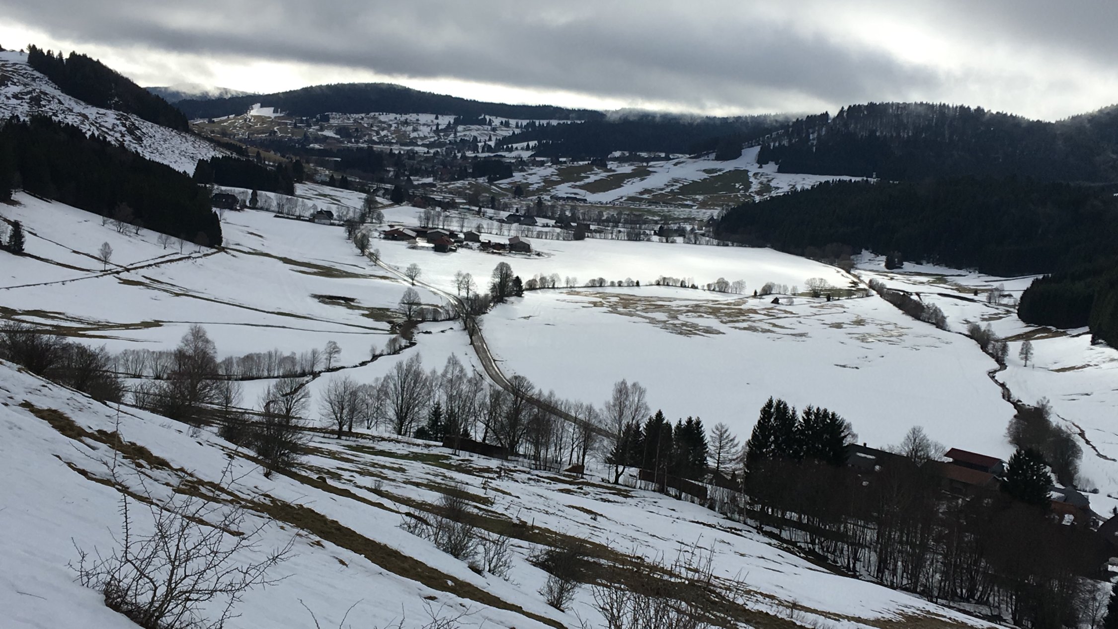 Generell im Laufe des Tages immer „mussiger “. Im Wald haklig. Abfahrt Spaß hält sich in Grenzen. Abfahrt nach Hof bis krunkelbachweg ausreichend Schnee, unterhalb muss man etwas suchen s. Bild. Zur krunkelbachhütte auf nen Kaffee, danach Spießhörner. Am Pavillon windstill und Vespern. Abfahrt ging so. Auf Herzogenhorn wieder stormy. Abfahrt zu BLZ gut. Grafenmatt und Piste wie Ostern.